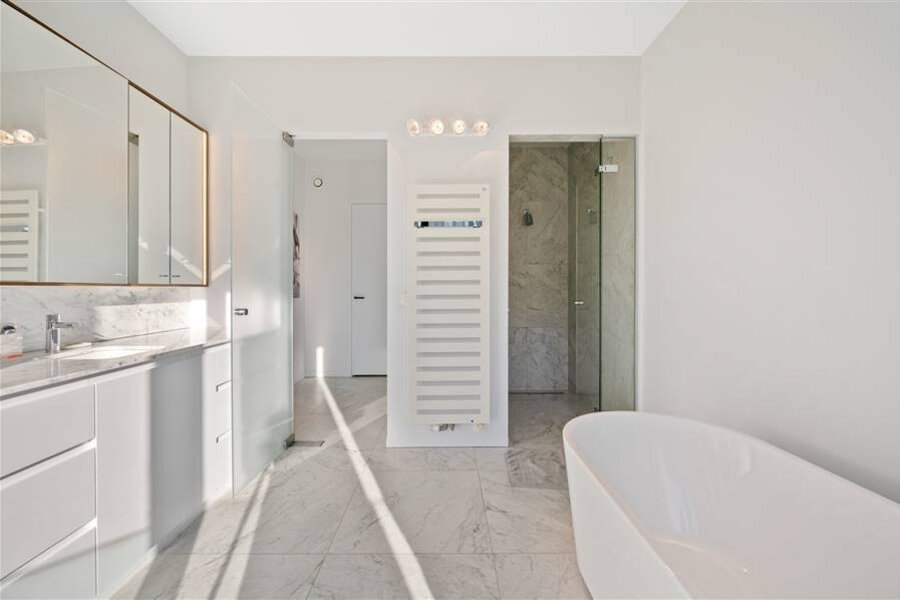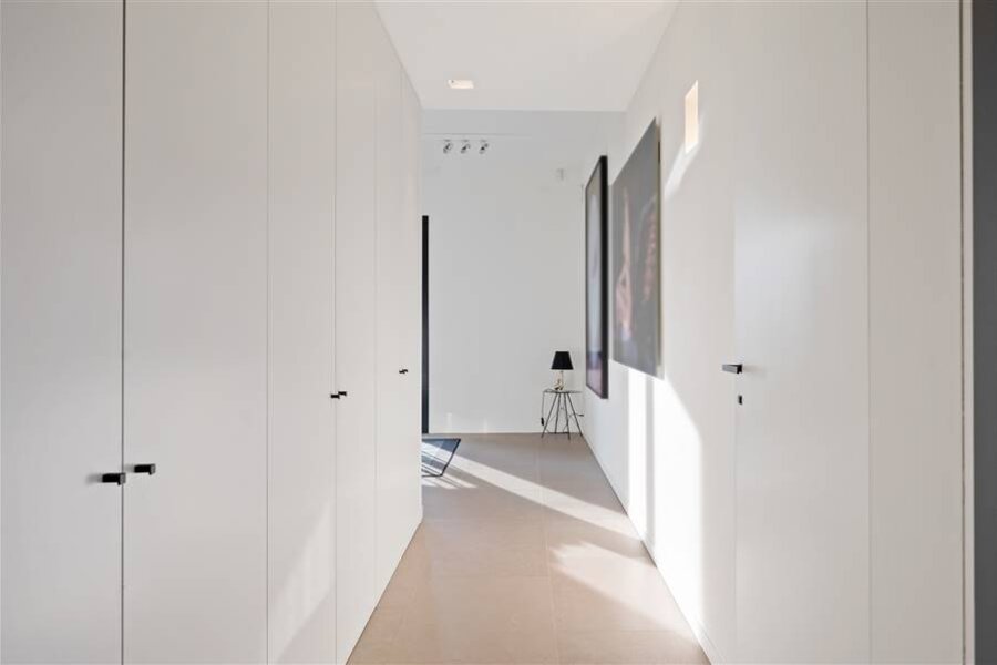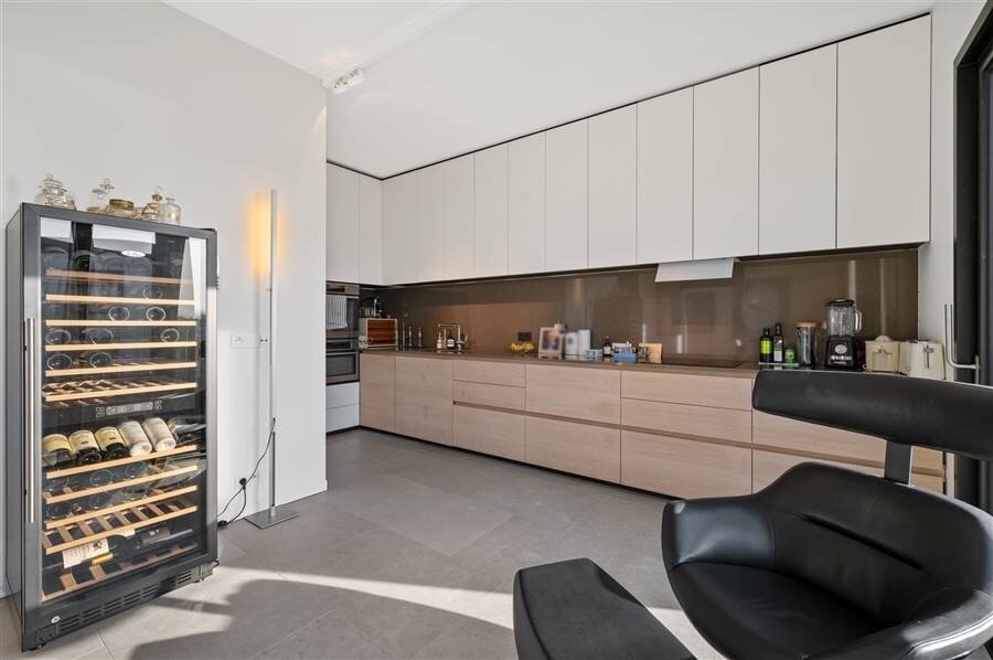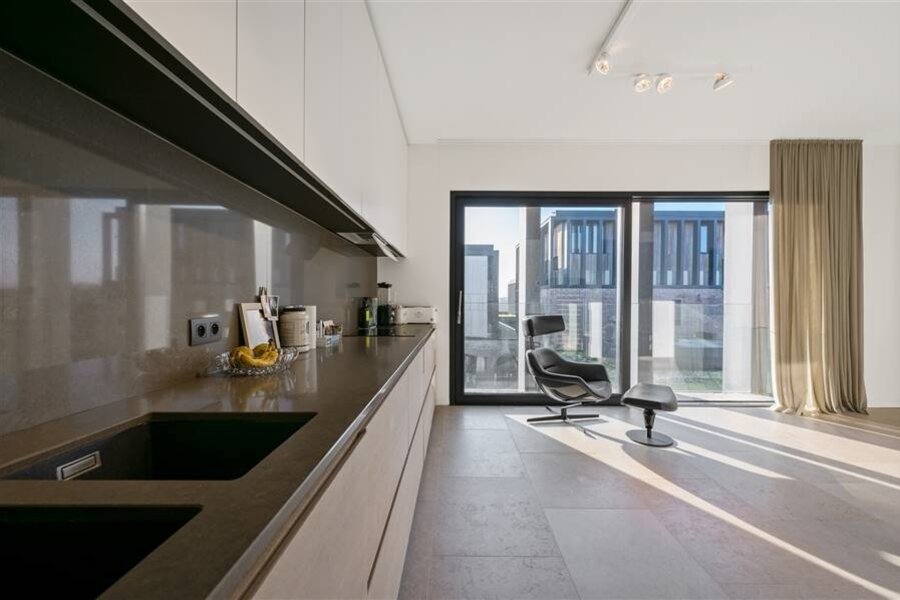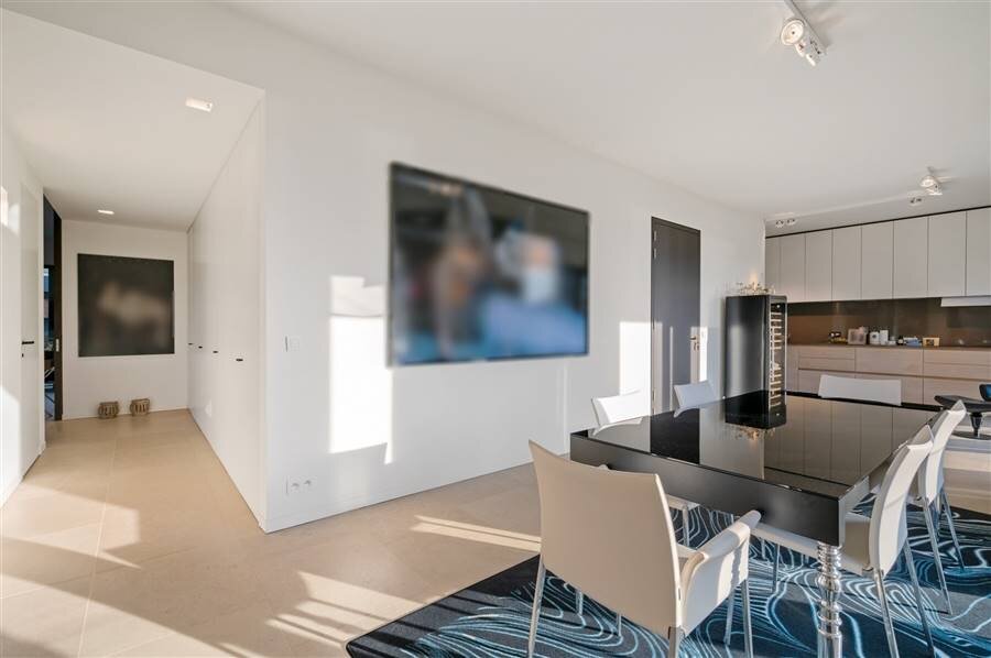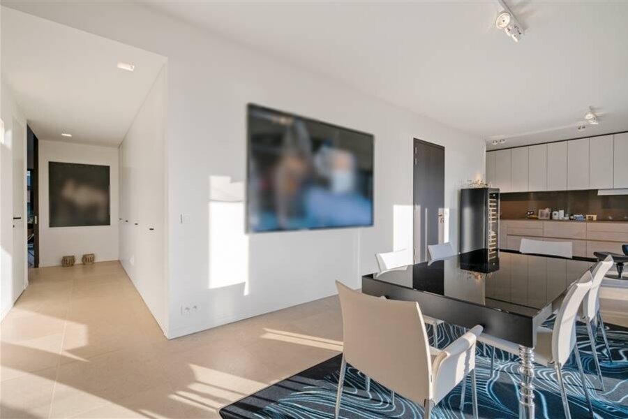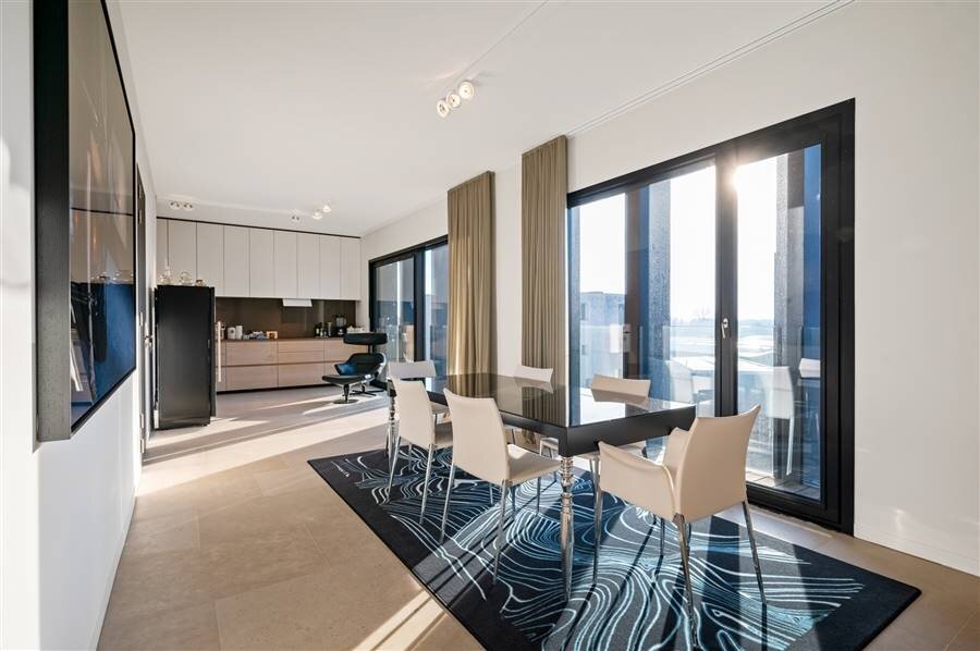 You enter the apartment and suddenly experience the space and light thanks to the large windows of the living kitchen. This large living space was equipped with a kitchen with built-in appliances and gives further freedom to fulfill the wishes of the resident. A passageway with a guest WC leads to the second living space, currently offering an office and a lounge as well as access to the spacious terrace. From the living room access to the multipurpose dressing room with passage to the laundry and technical room, access to the bedroom and the spacious bathroom.