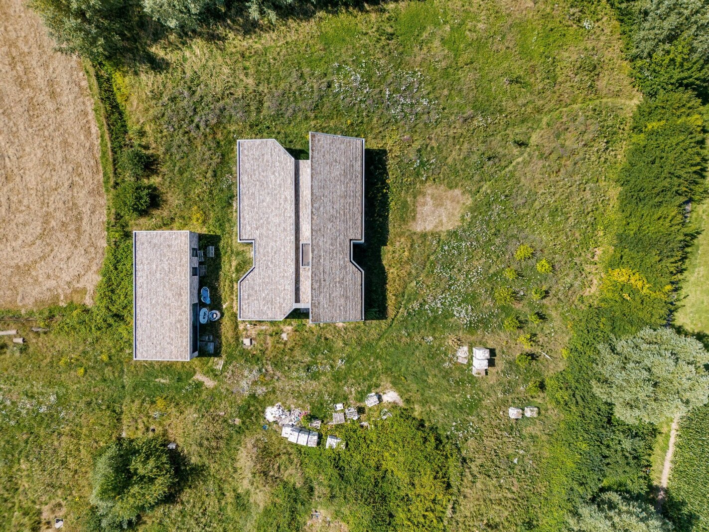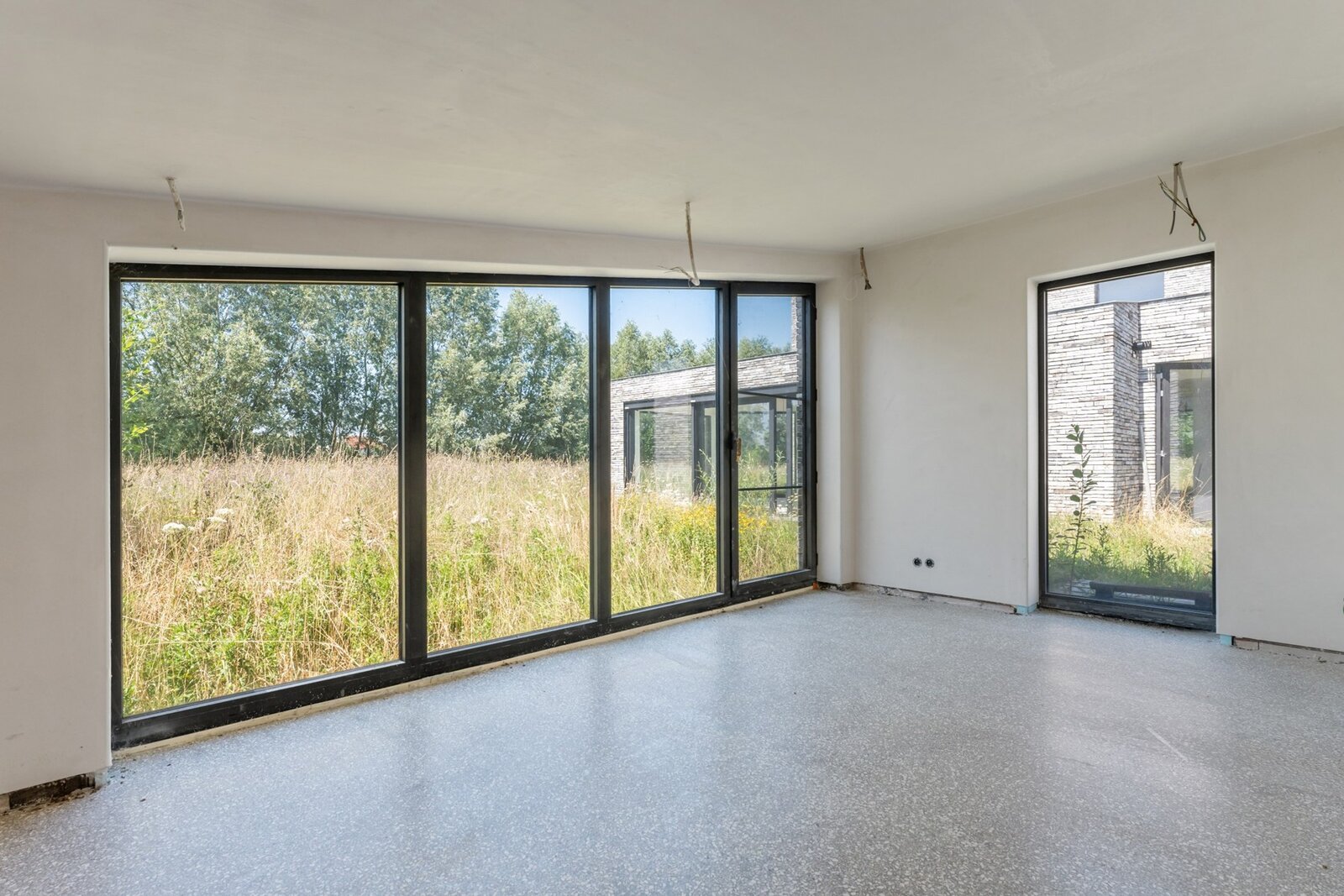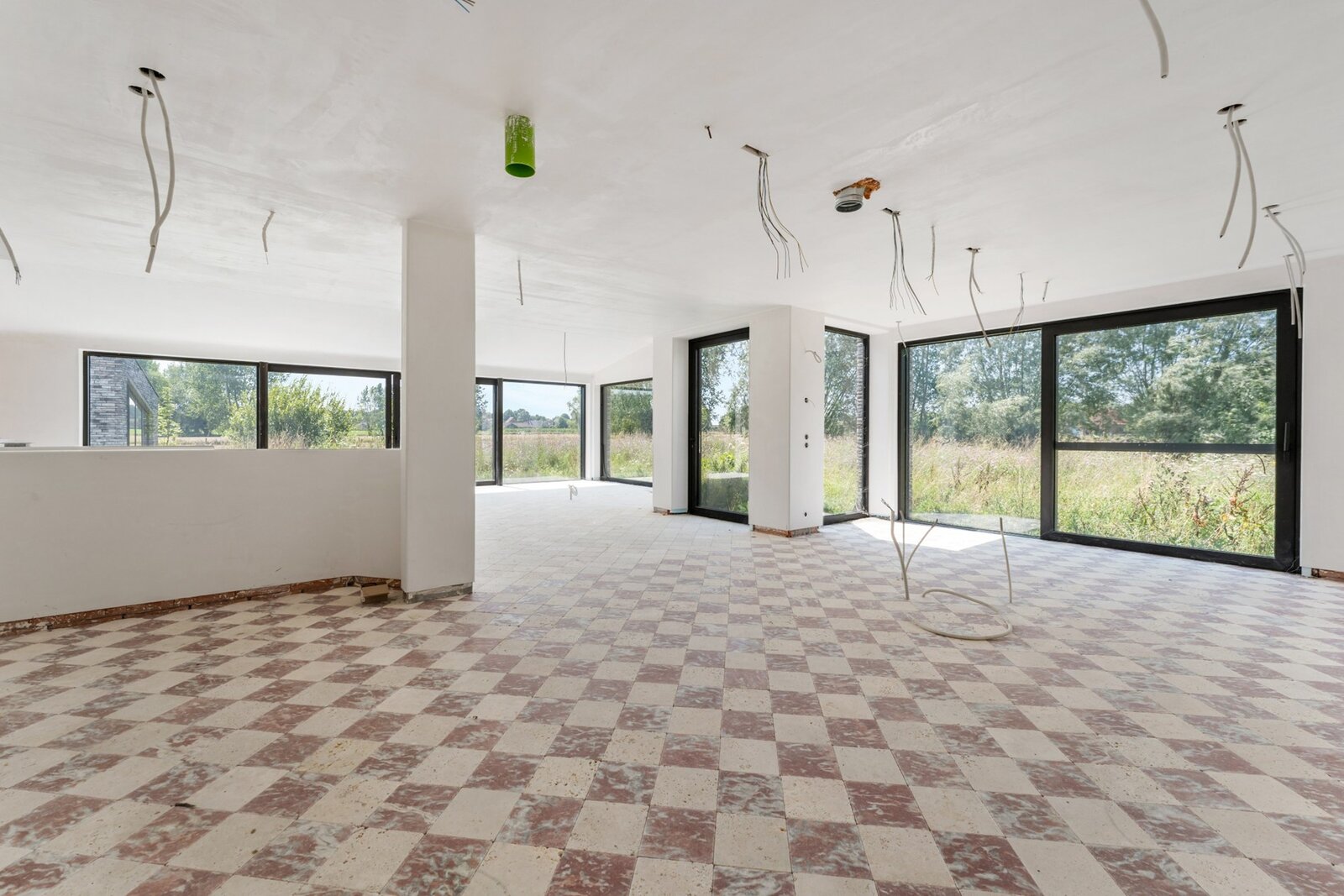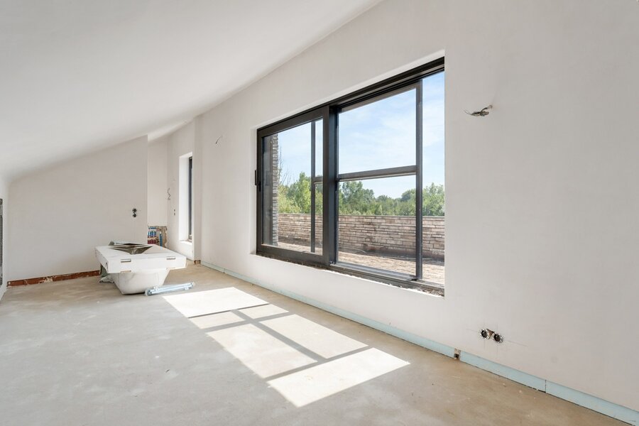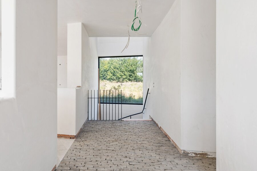 Centraal op het perceel staat een moderne woning in semicasco-staat, ontworpen door de gerenommeerde binnenarchitecte Antoinette Tondreau. De ruwbouw weerspiegelt een hedendaagse, elegante stijl en vormt de ideale basis om jouw droomwoning volledig naar eigen smaak af te werken.