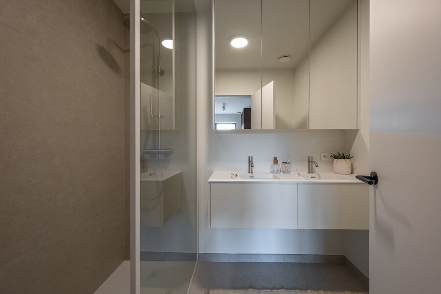 Inkomhal met vestiaire en gastentoilet. Lichtrijke leefruimte bestaande uit open keuken met aansluitend berging, eetplaats, bureauhoek en salon uitgevend op een zuidgericht terras. Drie slaapkamers en twee badkamers. Terras achteraan.