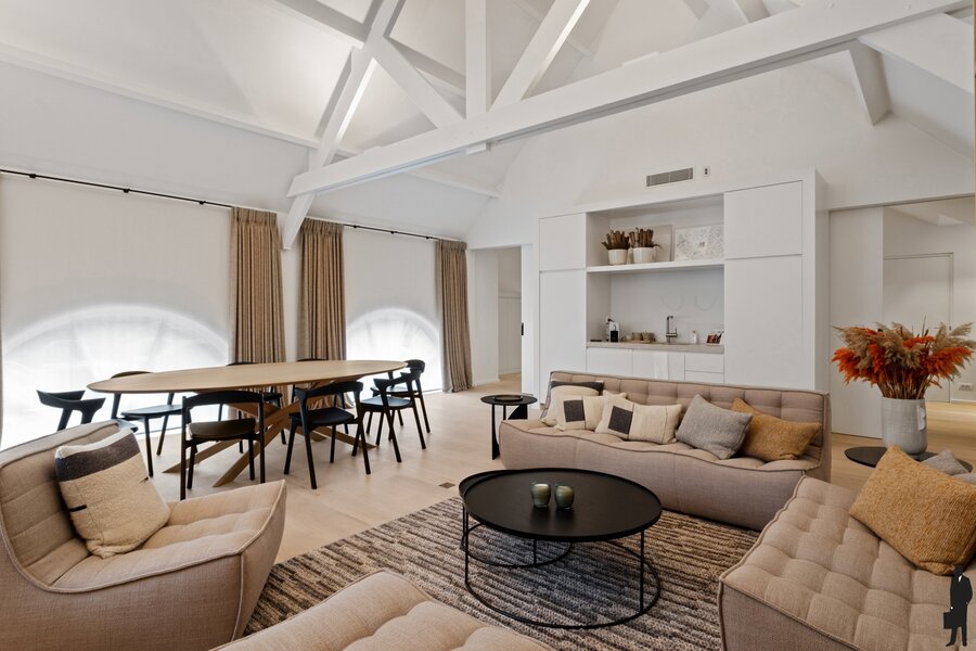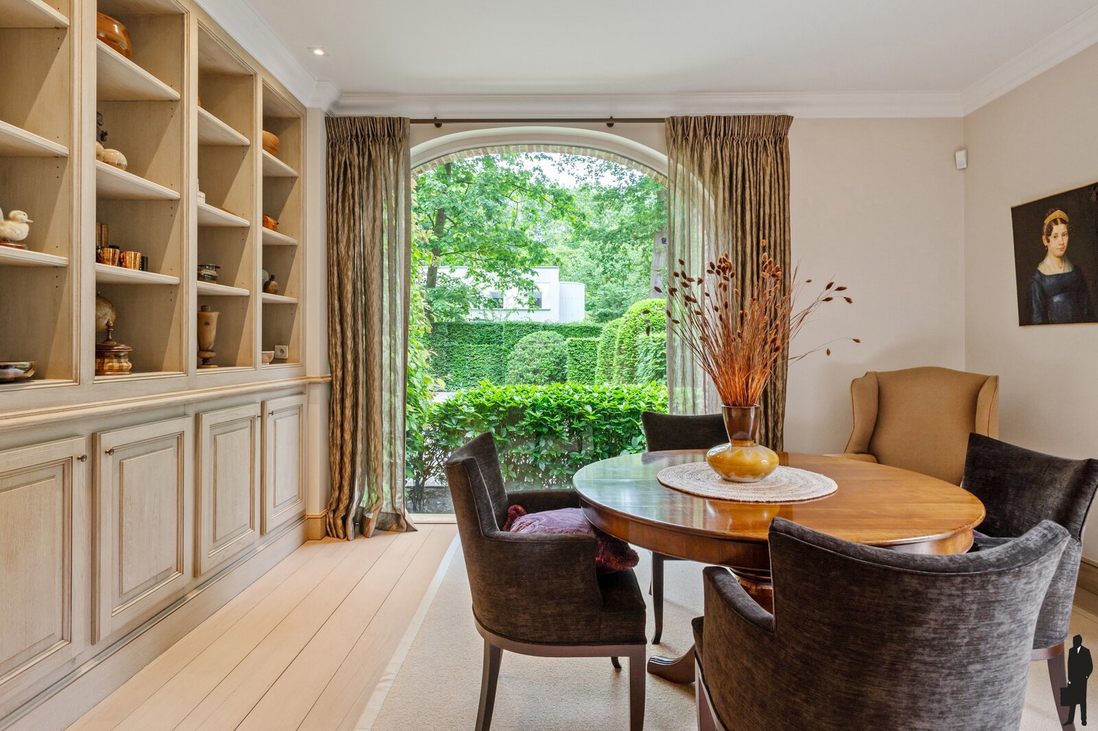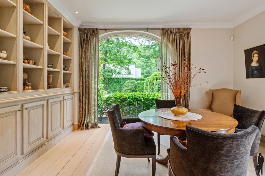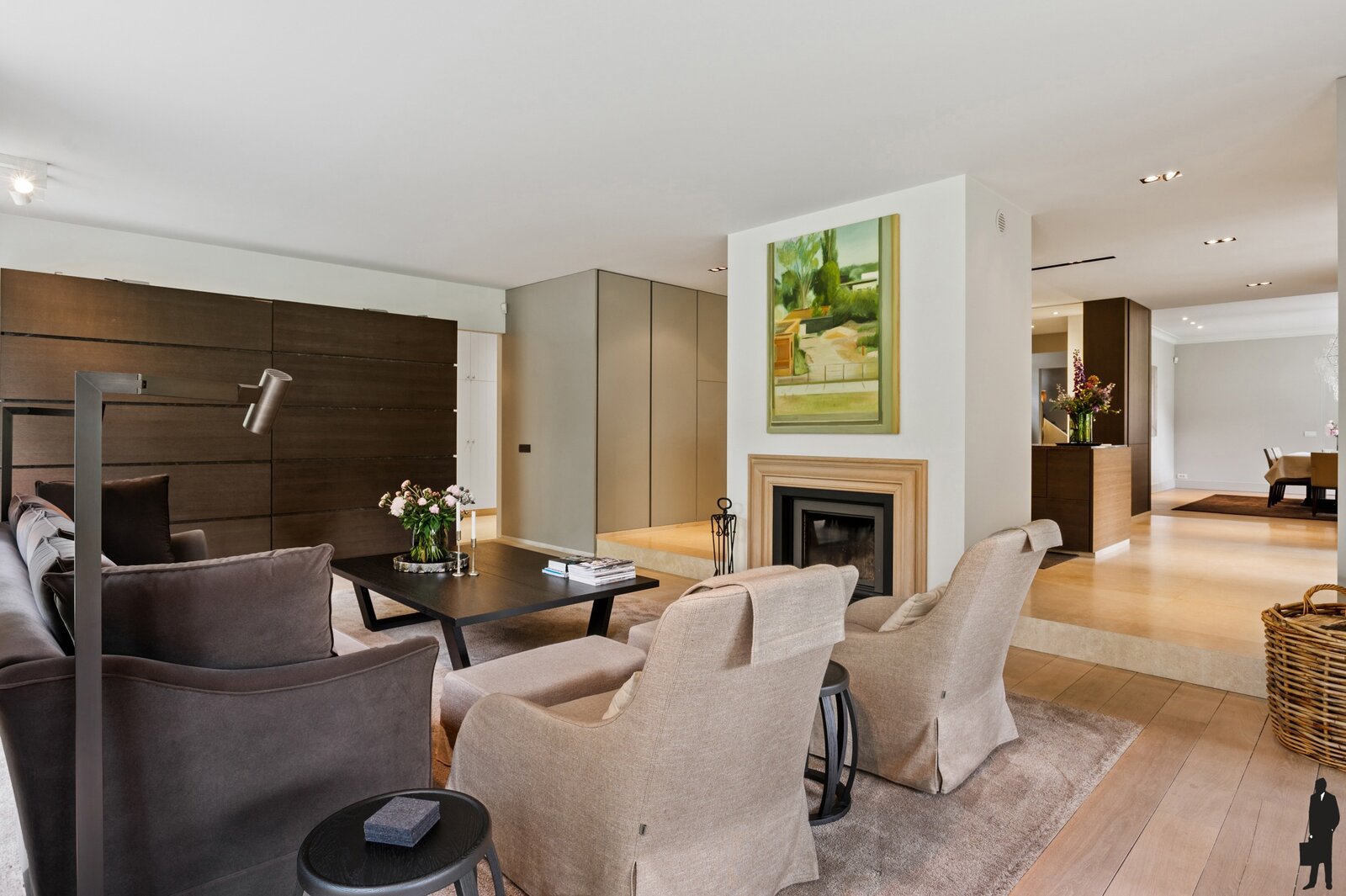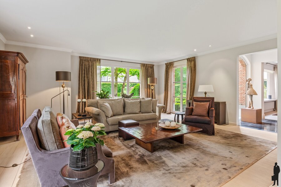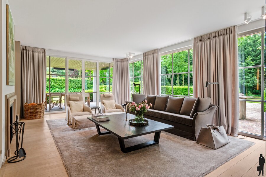 – Riante woonkamer met verschillende zithoeken, bibliotheek en open zicht op de tuin
