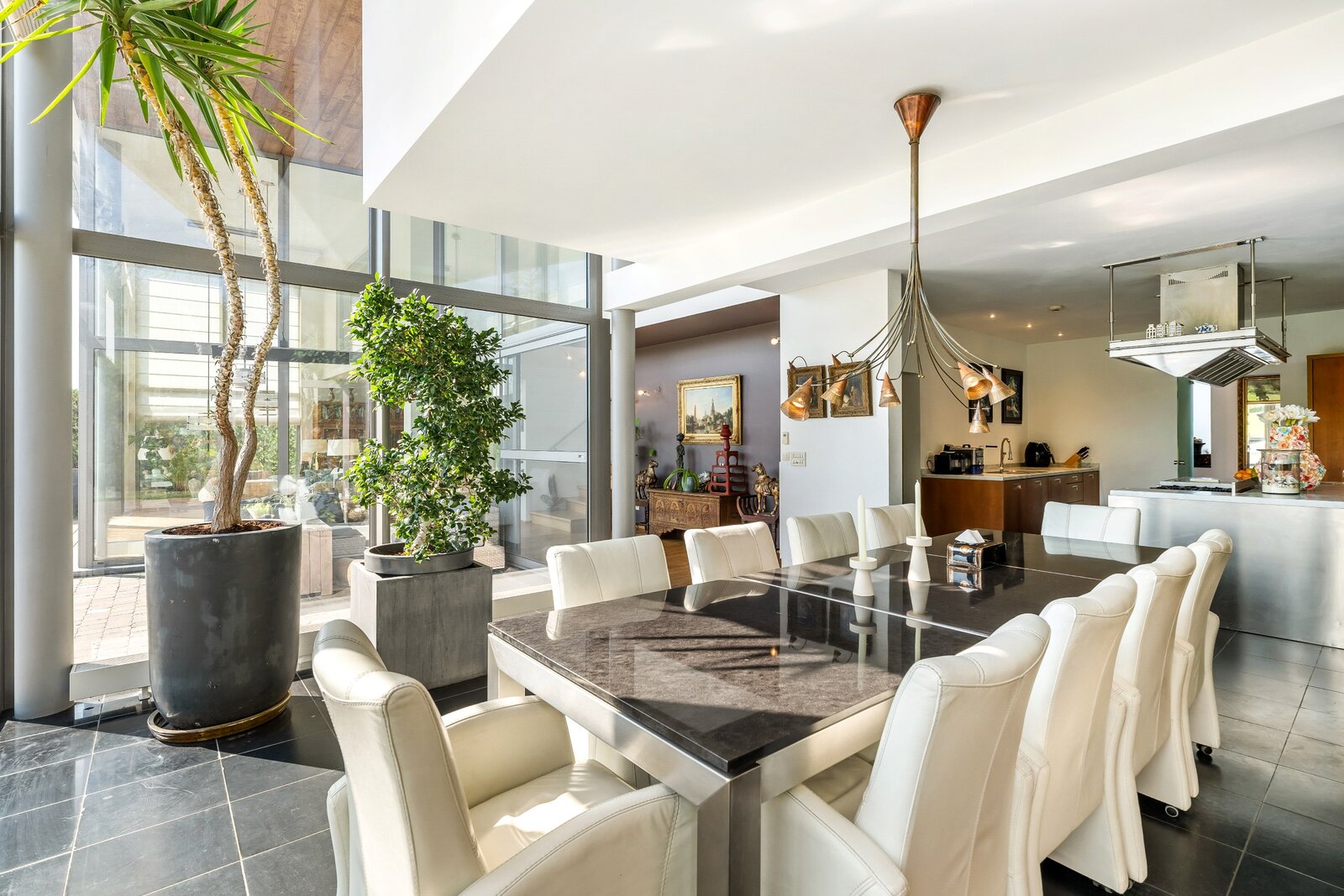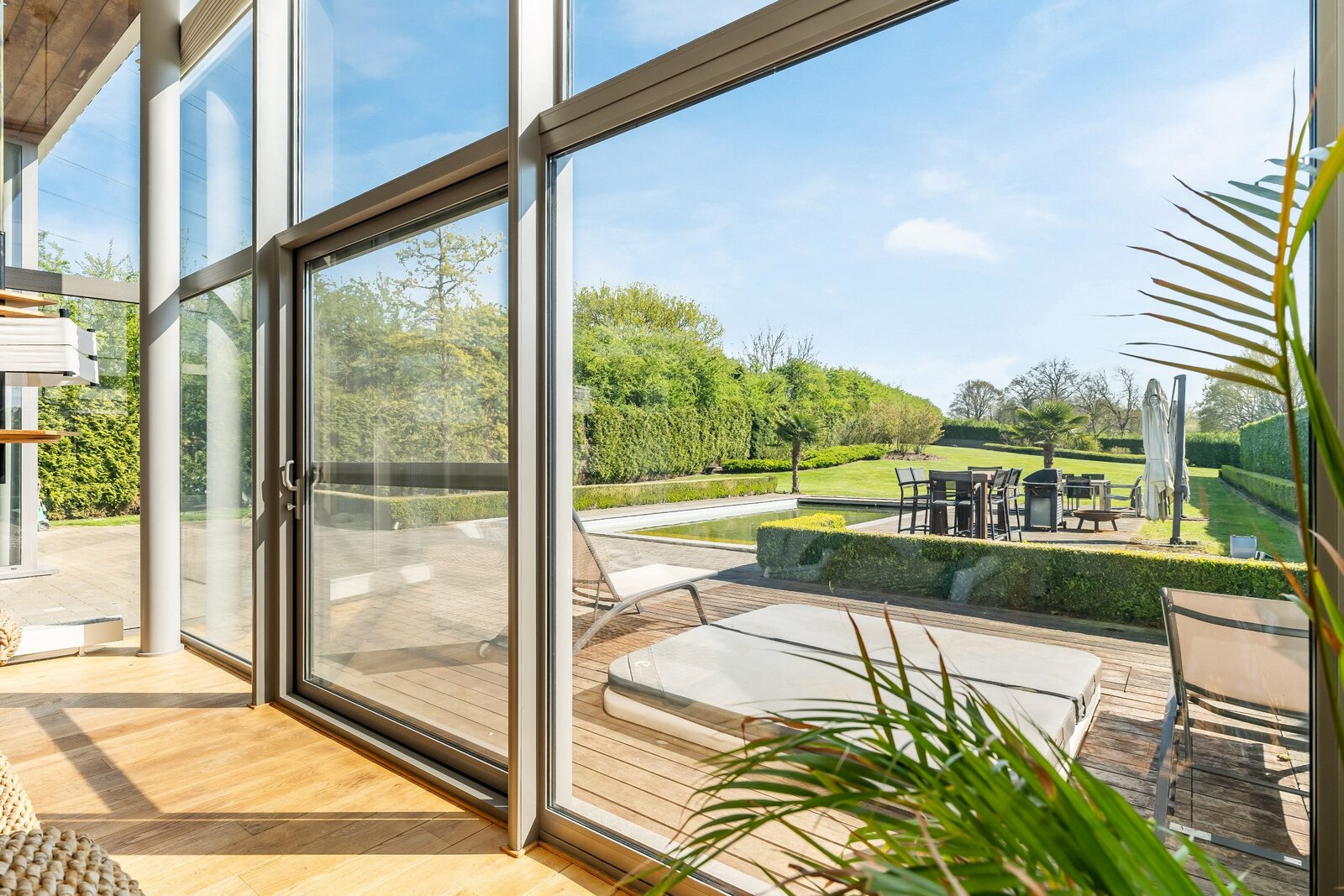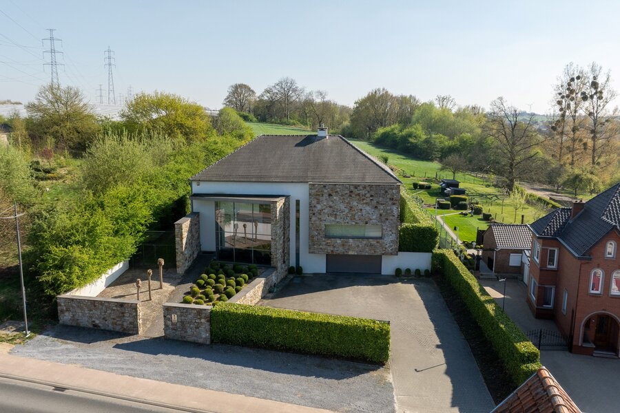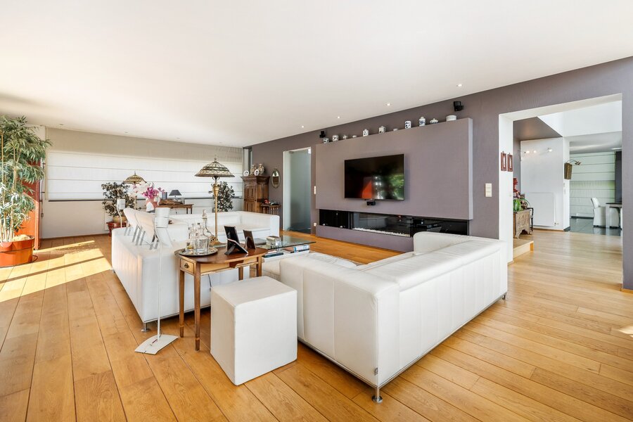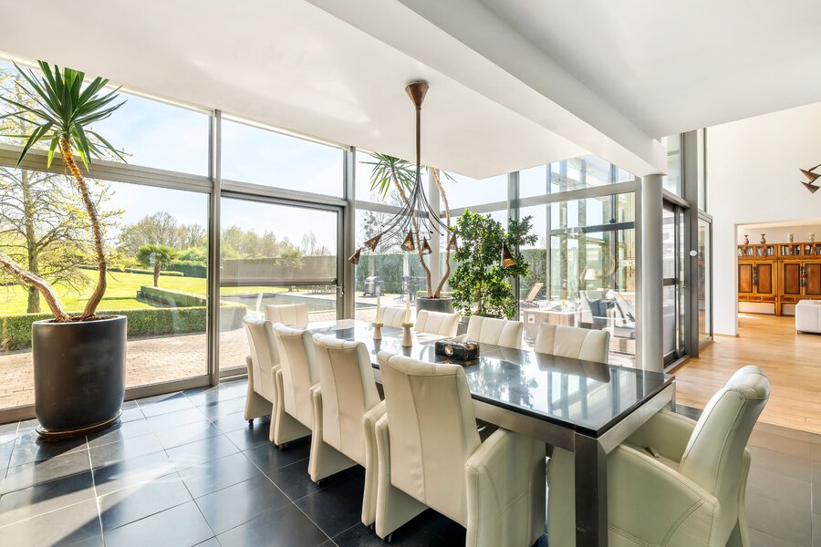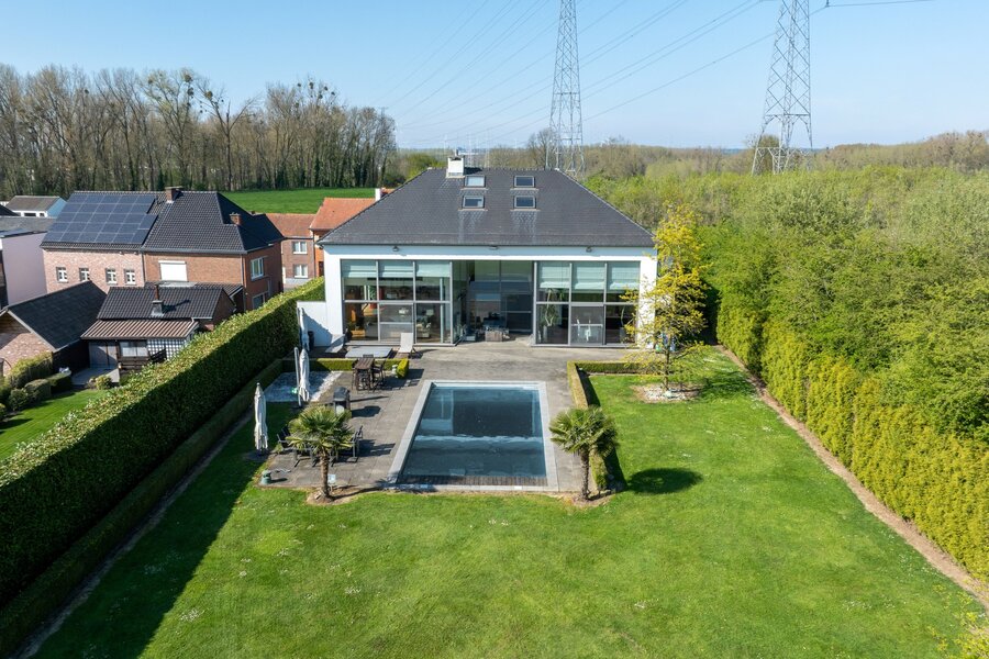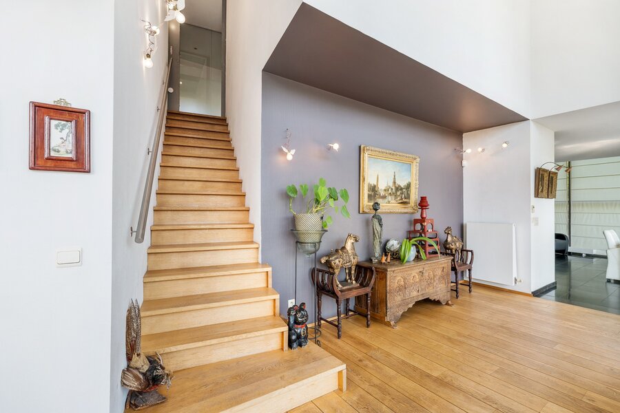 Deze statige villa onderscheidt zich door haar stijlvolle afwerking, royale volumes en overvloedige lichtinval dankzij de grote raampartijen.