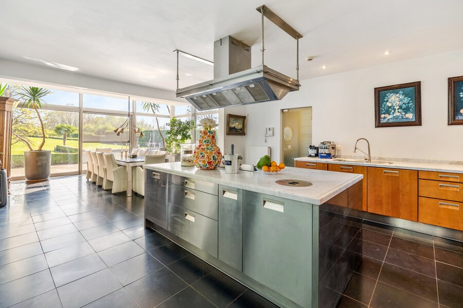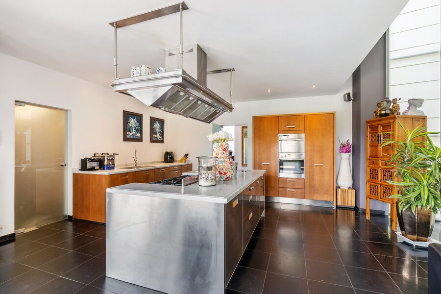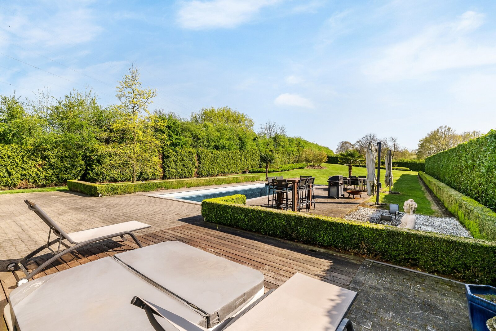 Op het gelijkvloers betreed je de woning via een indrukwekkende inkomhal met royale vestiairekasten. De moderne open keuken met eiland sluit naadloos aan op de eetkamer en de lichtrijke woonkamer. Aansluitend is er een ruime berging met aansluiting voor wasmachine en droogkast. De leefruimte kijkt uit over de prachtig aangelegde tuin met een royaal terras en een zwembad – de perfecte plek om te ontspannen of te entertainen.
