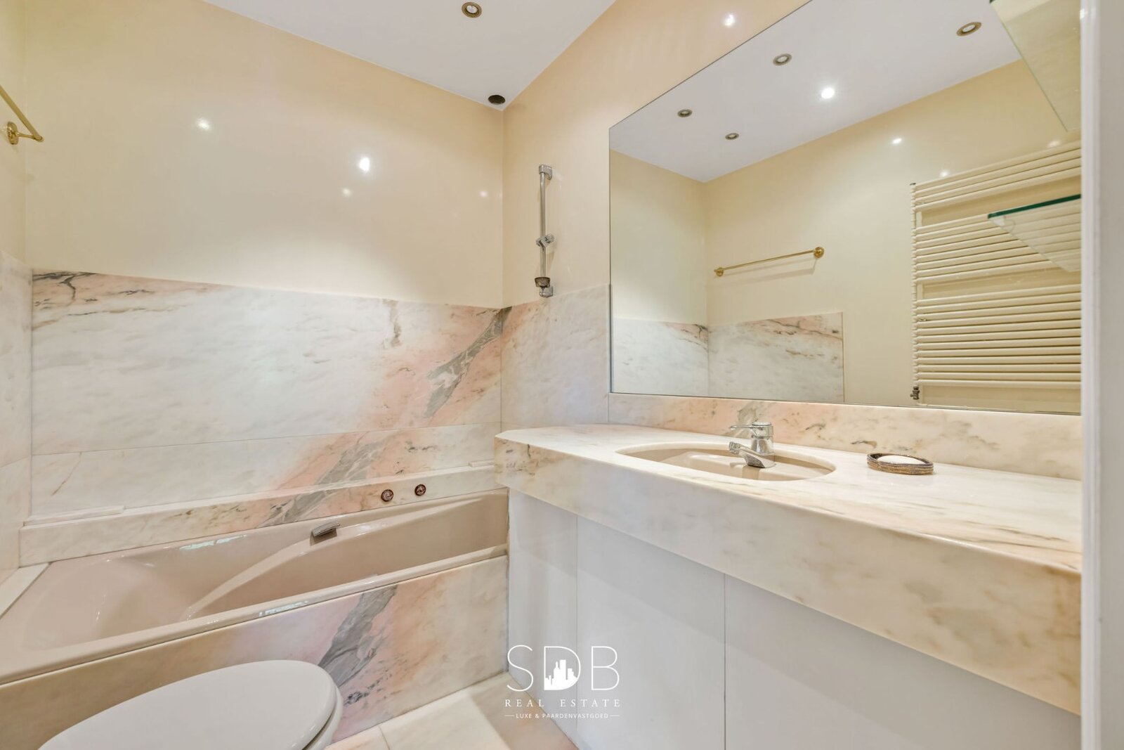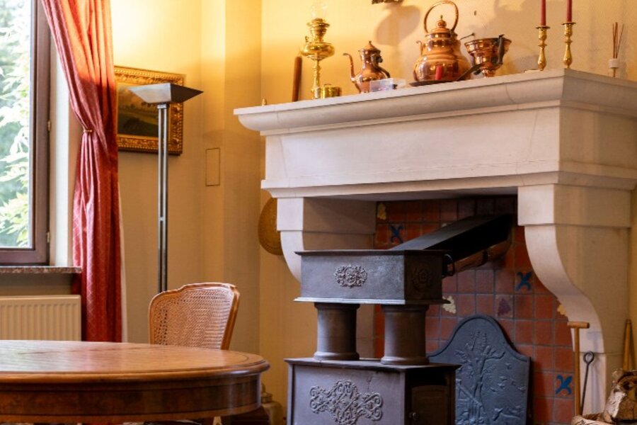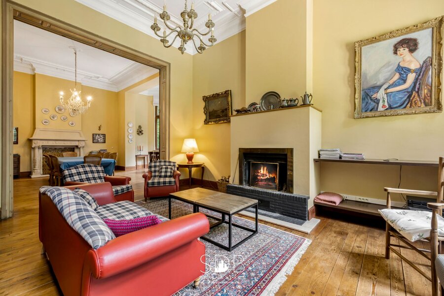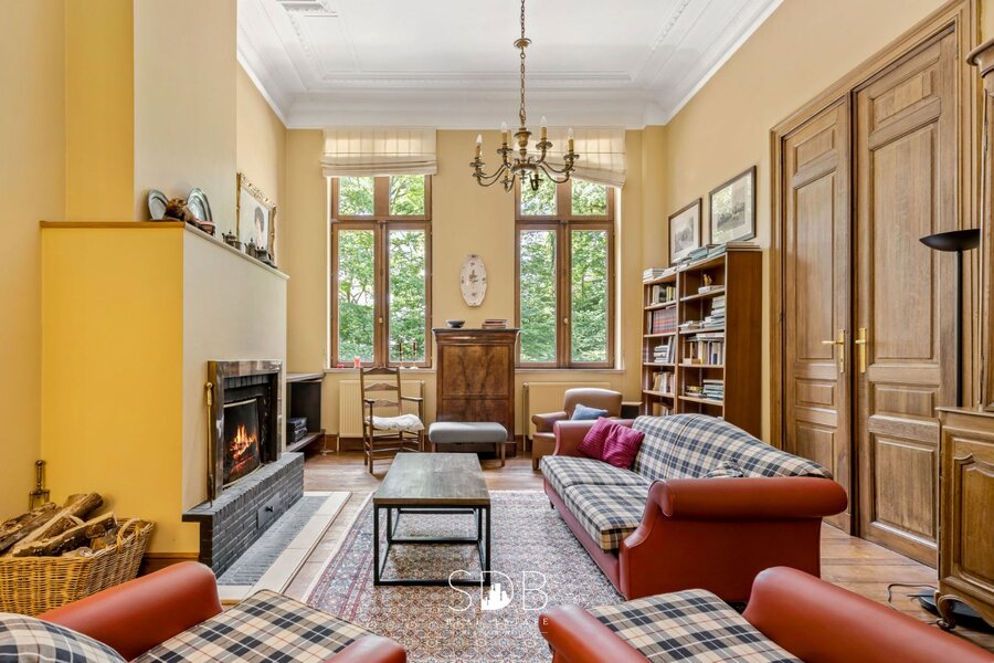 De royale woonkamer met hoge plafonds, sierlijke kroonlijsten en plafondrozetten genieten door de vele glaspartijen van natuurlijke lichtinval. De openhaard maakt het dan ook aangenaam vertoeven.
