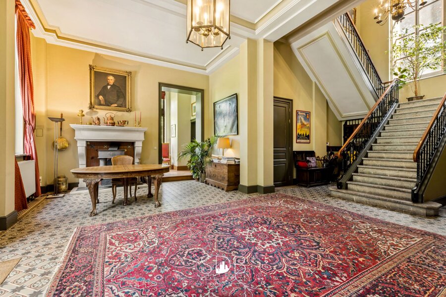 Via een statige inkom betreden we het landhuis. De indrukwekkende inkom met de imposante trap en het prachtige glaswerk zijn alvast de eerste blikvangers in dit interieur.