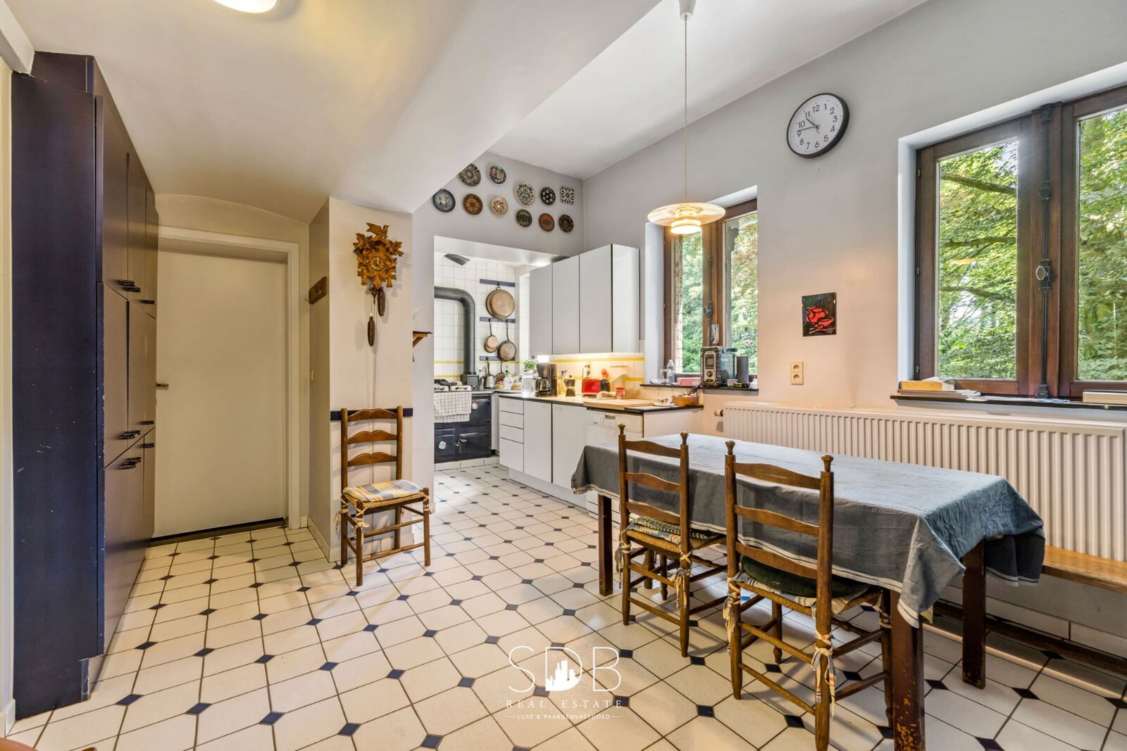 De aanpalende keuken is voorzien in al haar faciliteiten.