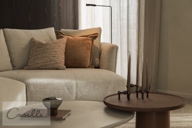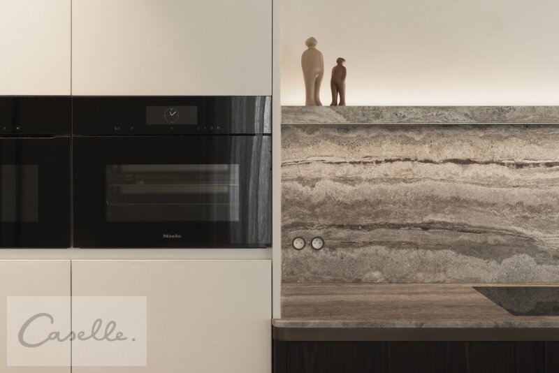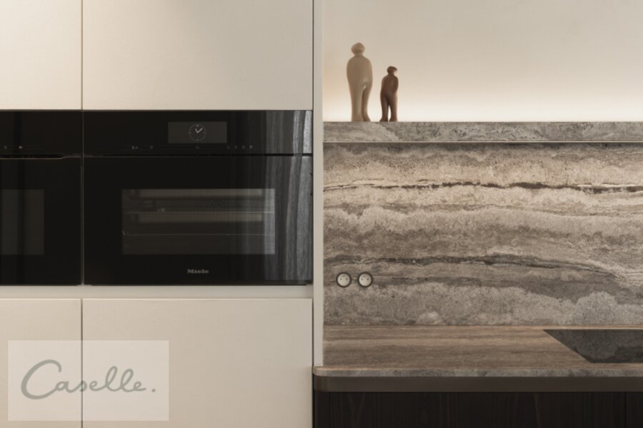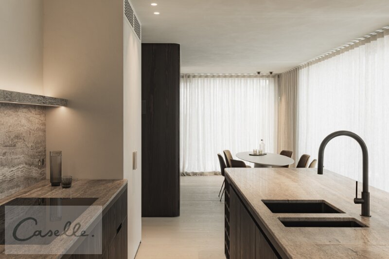 Binnenin ervaart u een luxe afwerking op maat: inkomhal met vestiairekasten, waarna je de ruime leefruimte inkomt met sfeervol ingewerkt gashaardmeubel. Deze ruimtes baden in het licht dankzij de grote raampartijen en sluiten naadloos aan op de designkeuken met moderne Miele-toestellen en een Travertino Silver natuurstenen blad (Devriese Interieur).