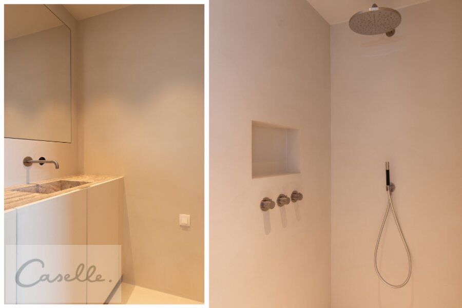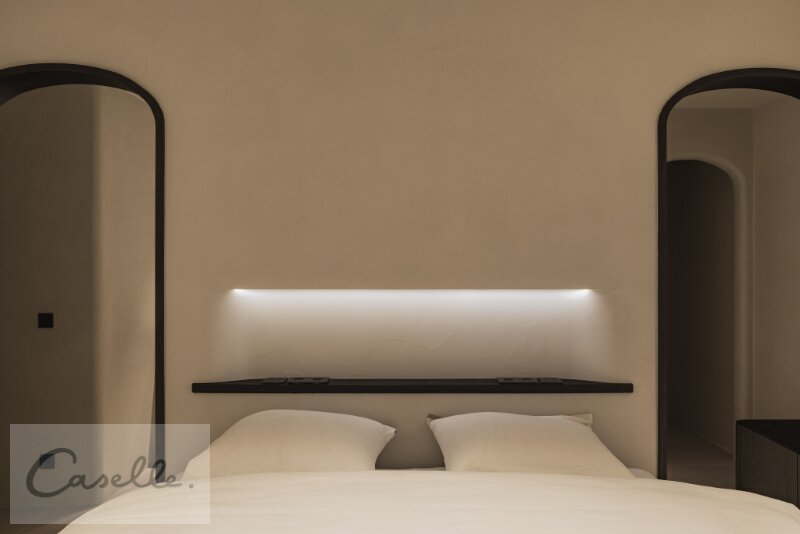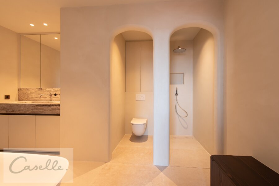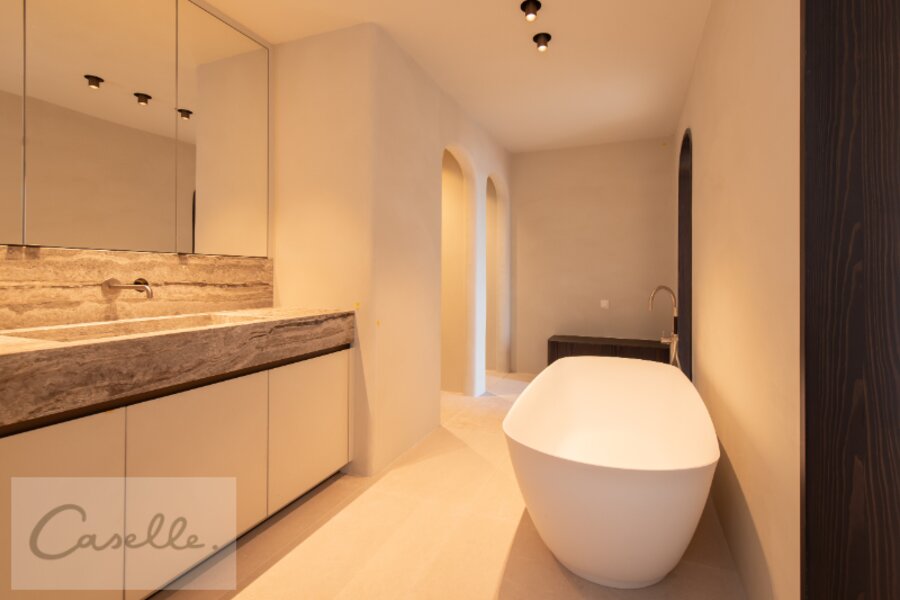 Master bedroom met ensuite badkamer (vrijstaand bad, inloopdouche, toilet, maatwerk lavabomeubel in natuursteen)