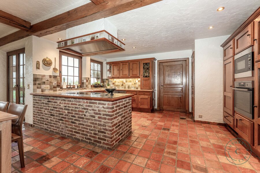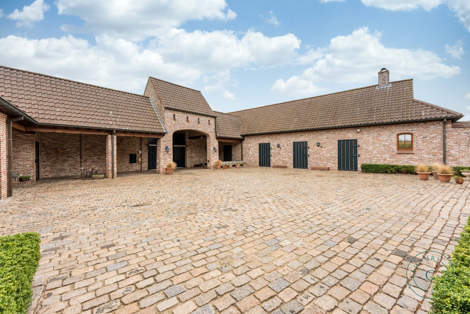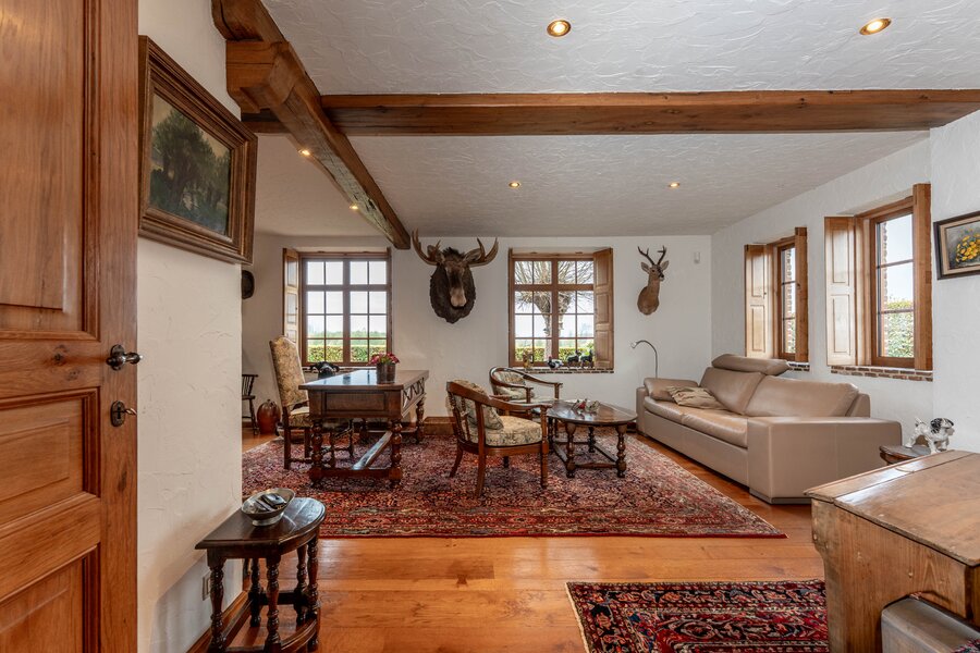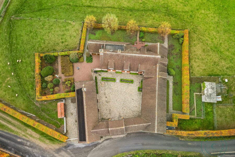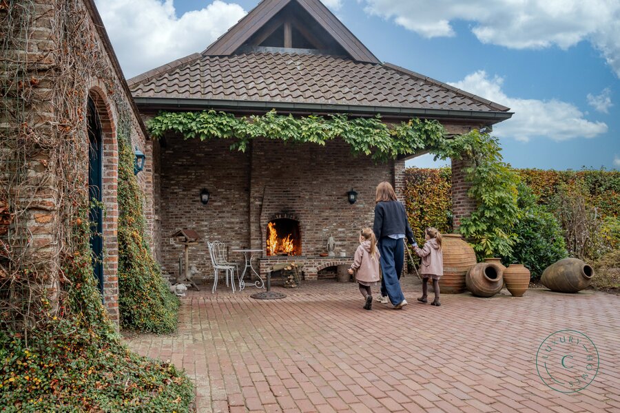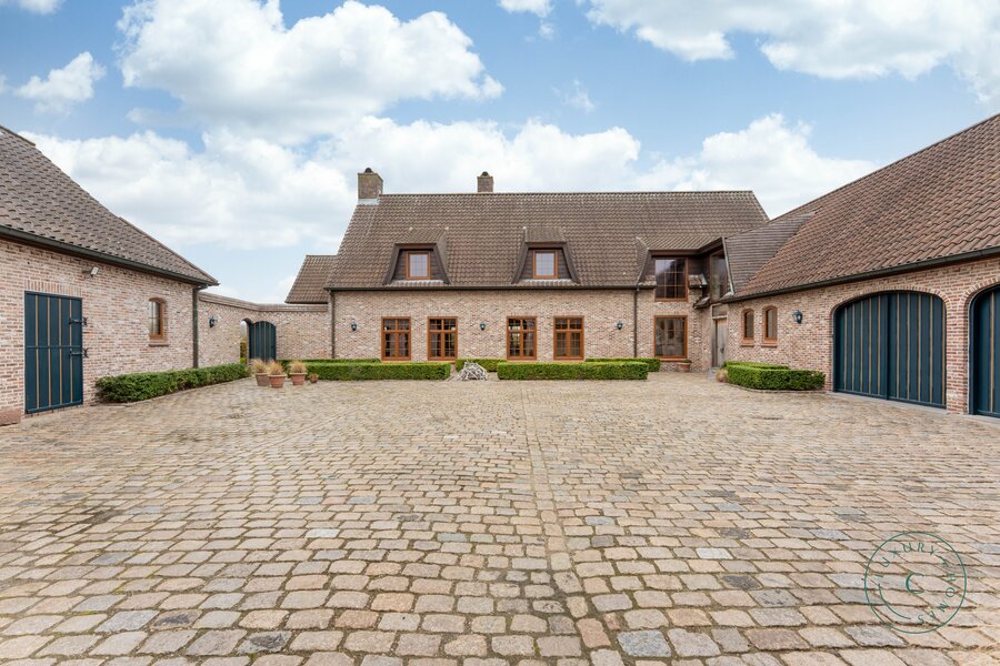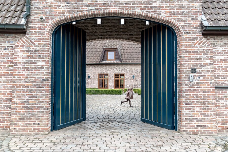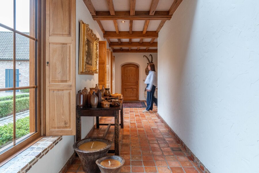 Achter de automatische poort ontvouwt zich een harmonieus geheel waarin functionaliteit en authenticiteit elkaar ontmoeten. Vanuit de binnenkoer heeft u toegang tot elk deel van het domein: de paardenstallen, dubbele garage, carport en de woning zelf. Elk volume vormt een deel van het karaktervolle geheel dat deze vierkantshoeve zo uniek maakt.