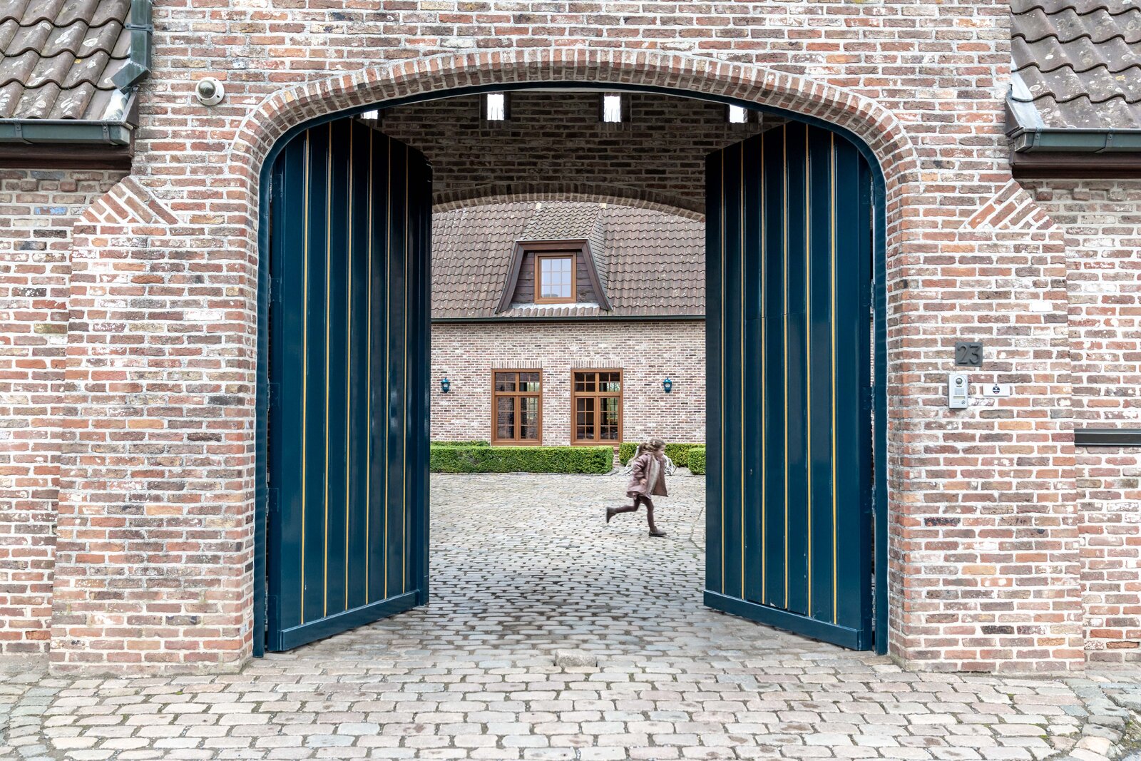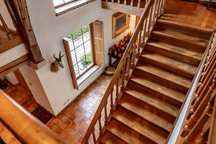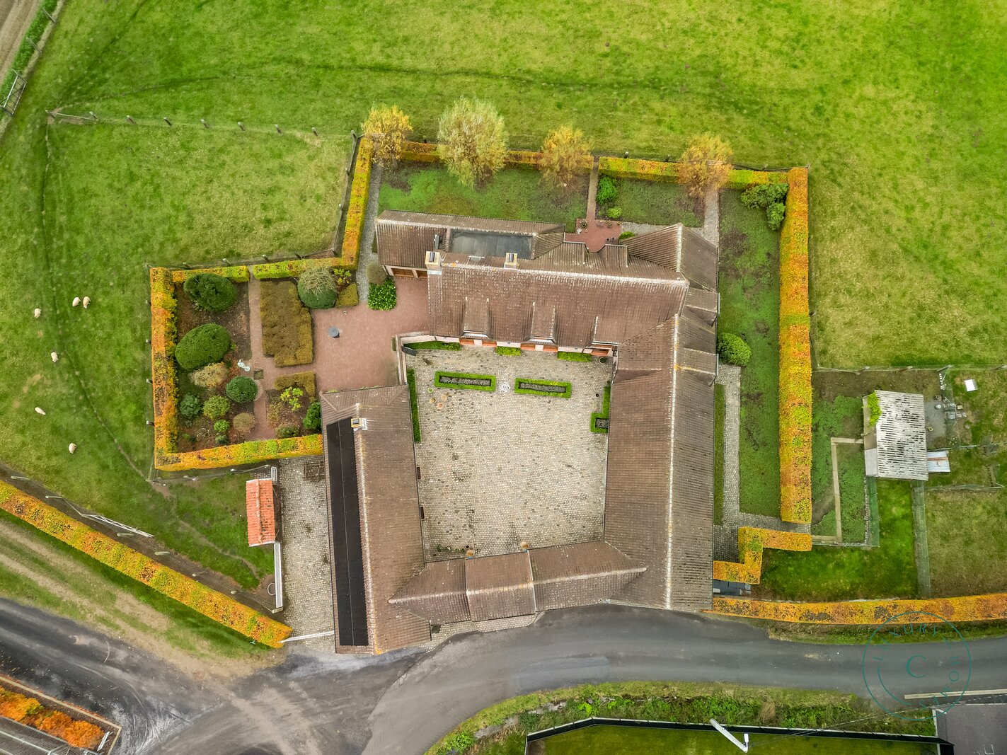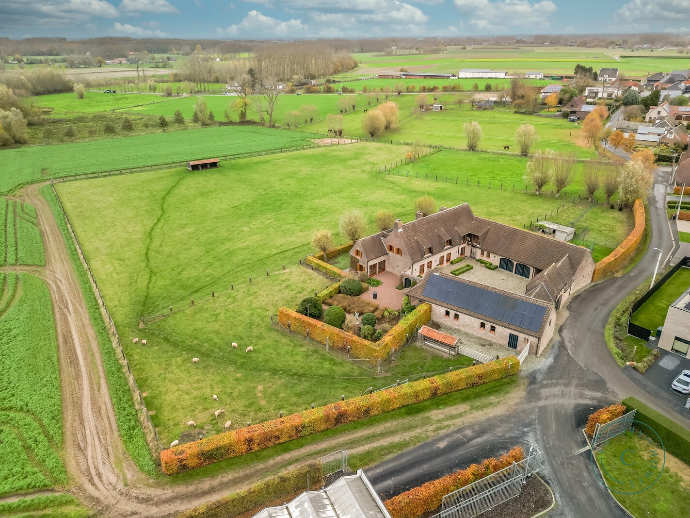 Achter de automatische poort ontvouwt zich een harmonieus geheel waarin functionaliteit en authenticiteit elkaar ontmoeten. Vanuit de binnenkoer heeft u toegang tot elk deel van het domein: de paardenstallen, dubbele garage, carport en de woning zelf. Elk volume vormt een deel van het karaktervolle geheel dat deze vierkantshoeve zo uniek maakt.
