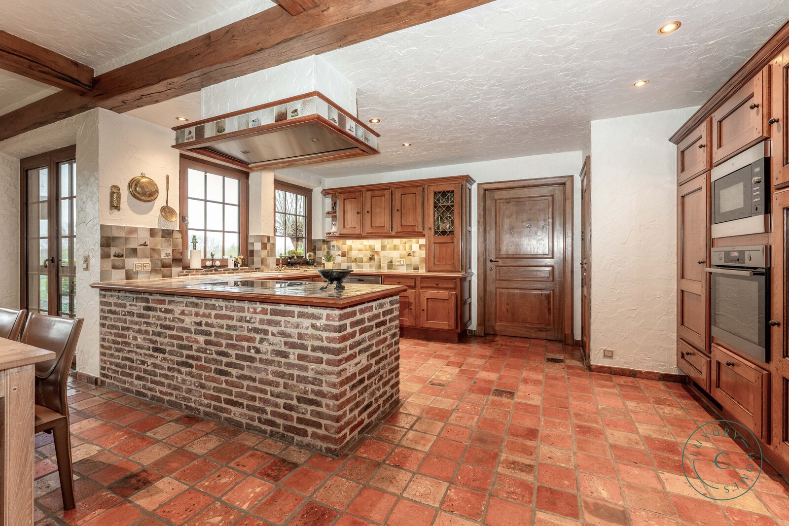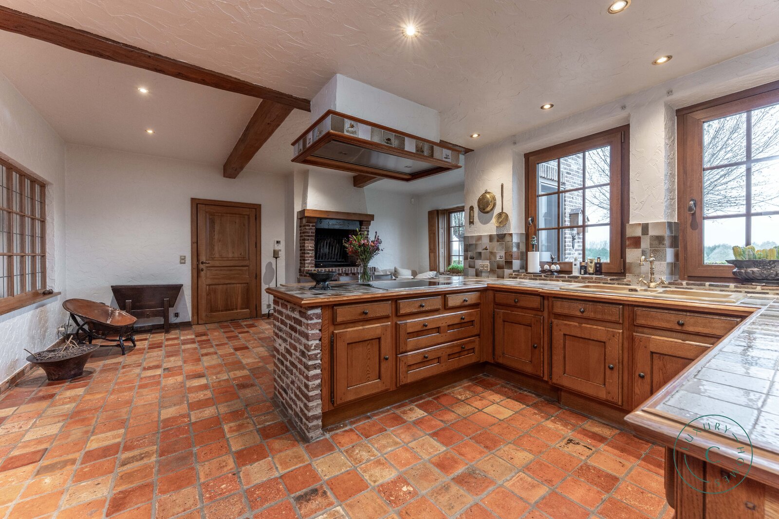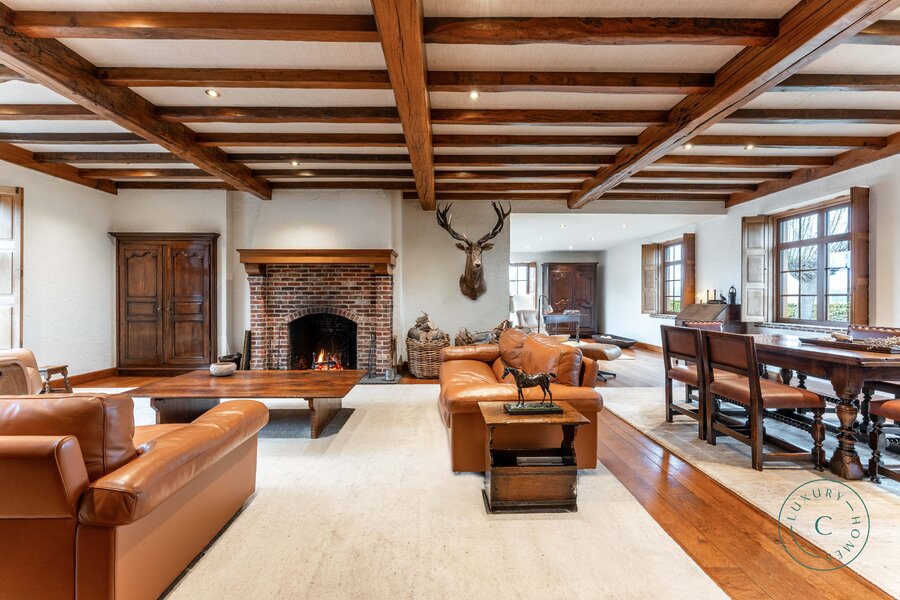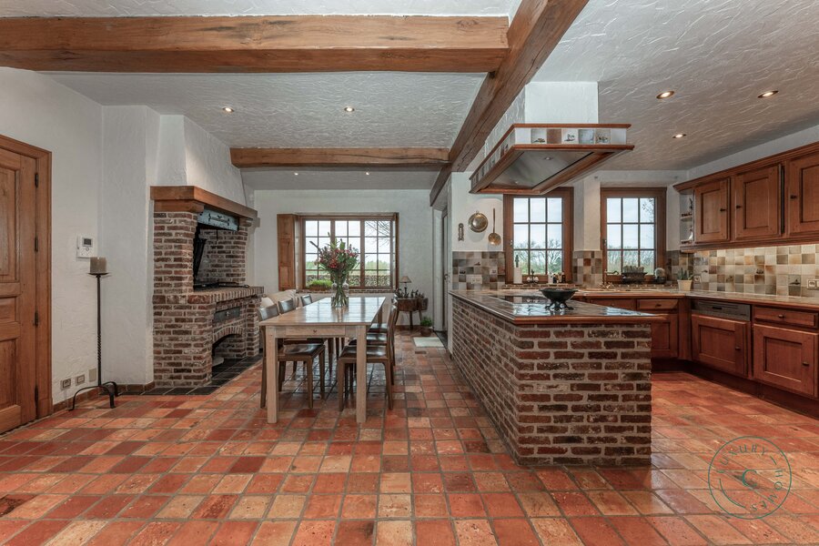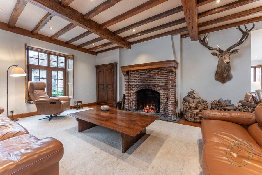 Via een lange, lichtrijke gang bereikt u de keuken met aansluitende bijkeuken, praktische berging en toegang tot de kelder. De ruime leefruimte met eetplaats en zitgedeelte ademt warmte en gezelligheid, met een open haard als centraal element en grote raampartijen die uitkijken op de binnenkoer en het terras.