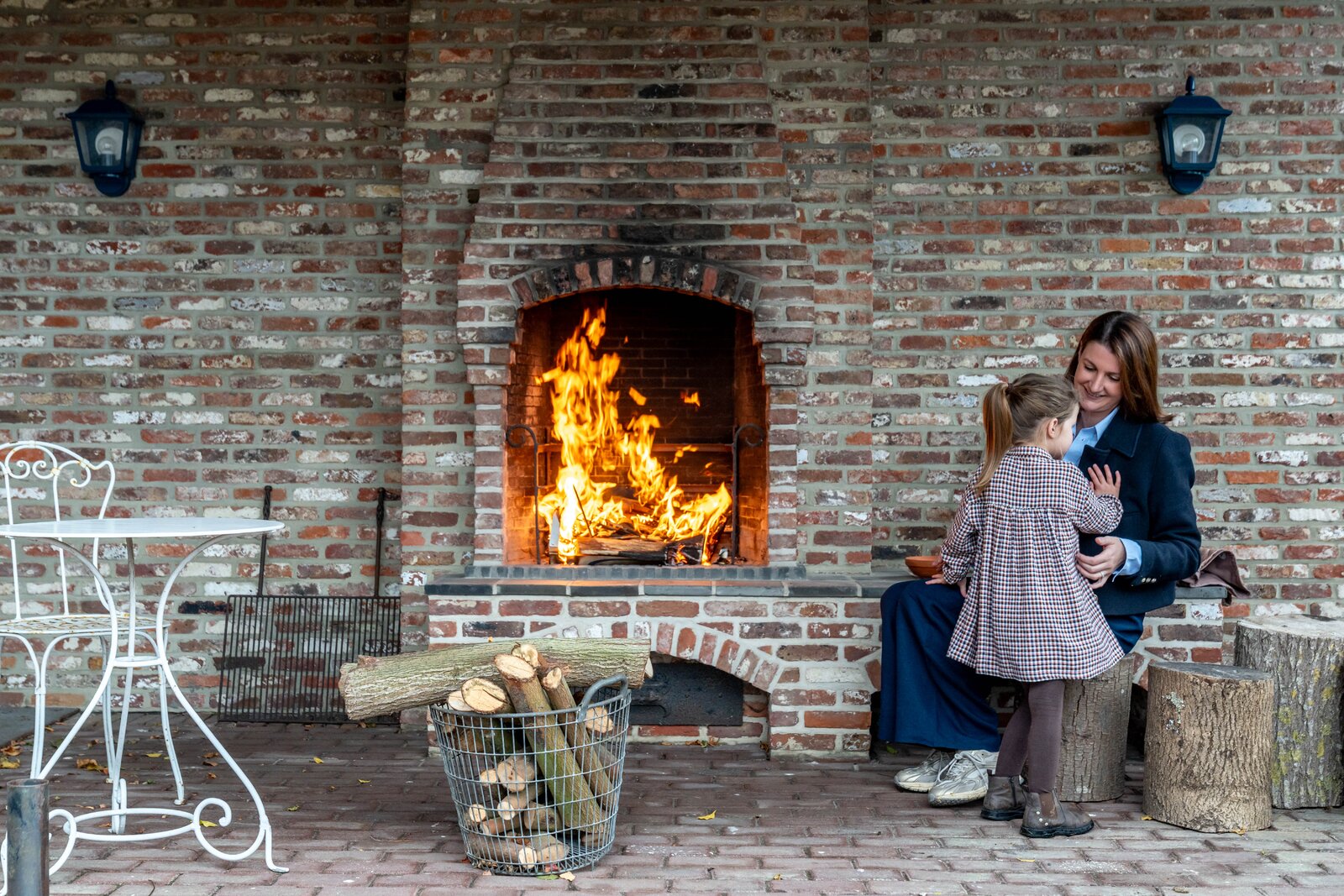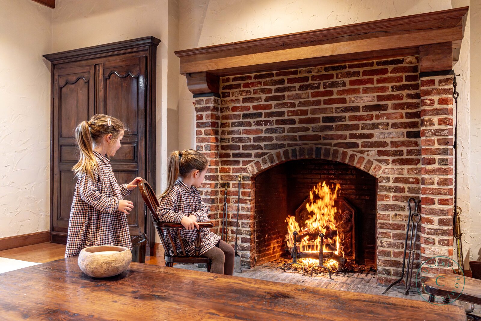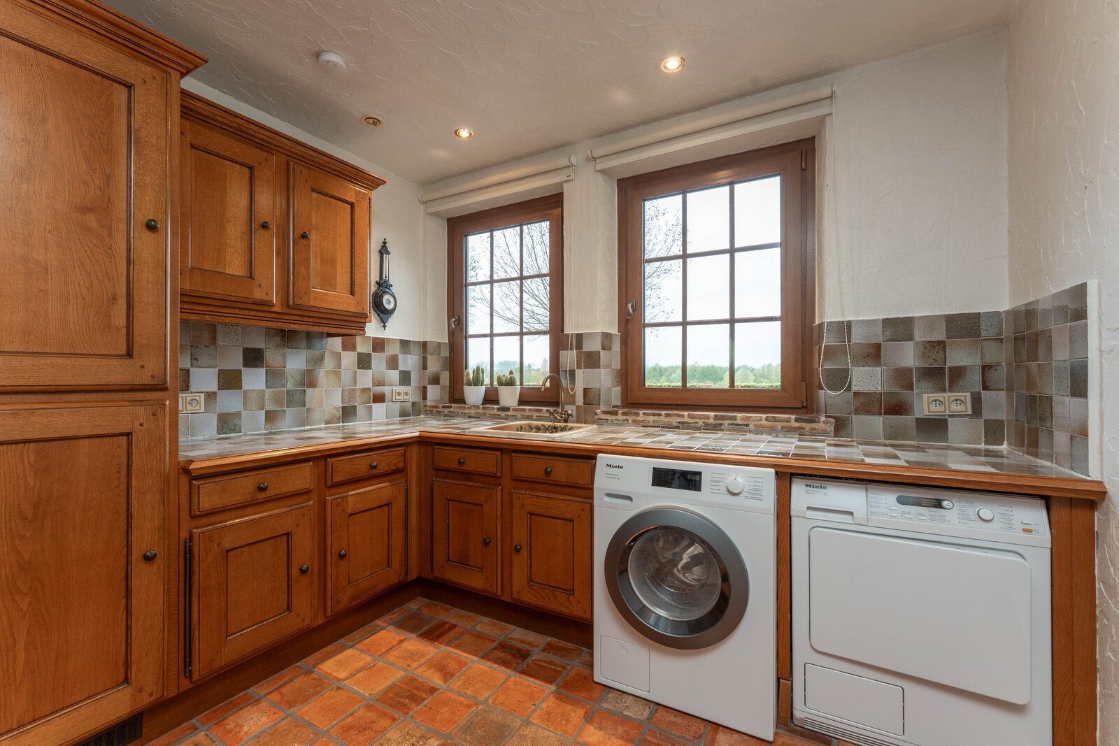 Via een lange, lichtrijke gang bereikt u de keuken met aansluitende bijkeuken, praktische berging en toegang tot de kelder. De ruime leefruimte met eetplaats en zitgedeelte ademt warmte en gezelligheid, met een open haard als centraal element en grote raampartijen die uitkijken op de binnenkoer en het terras.