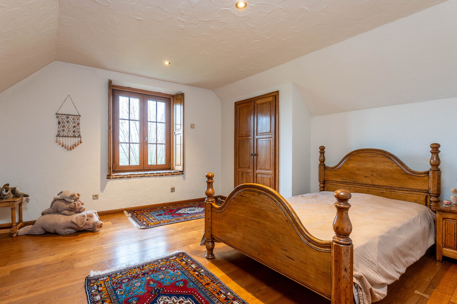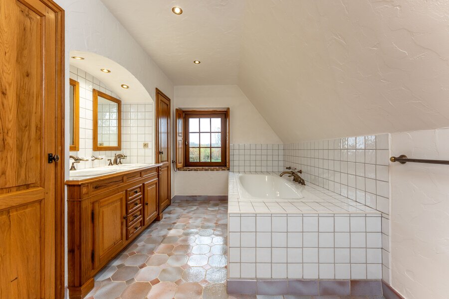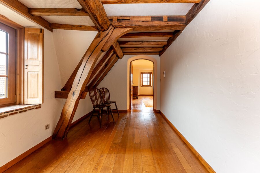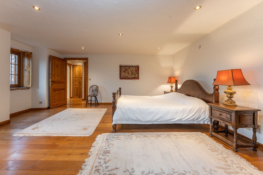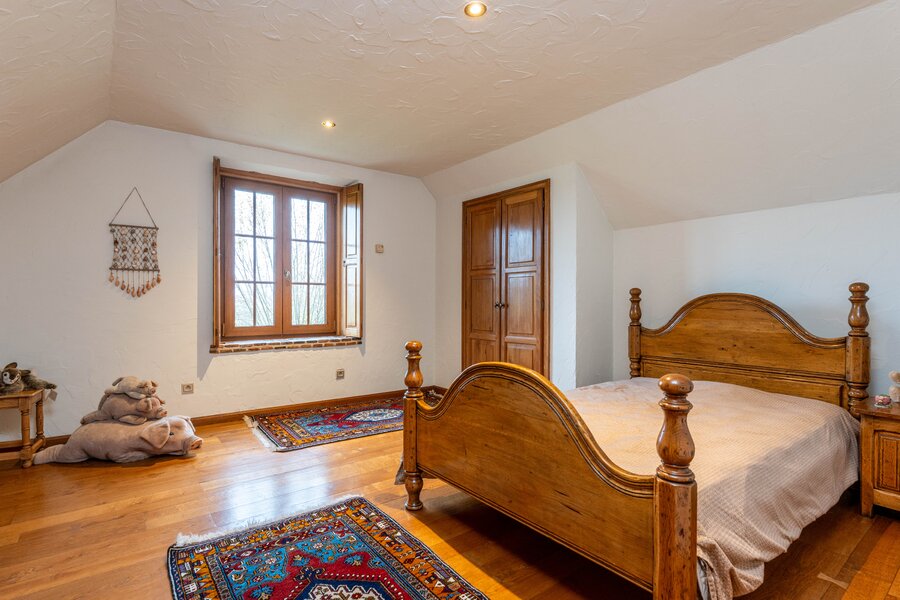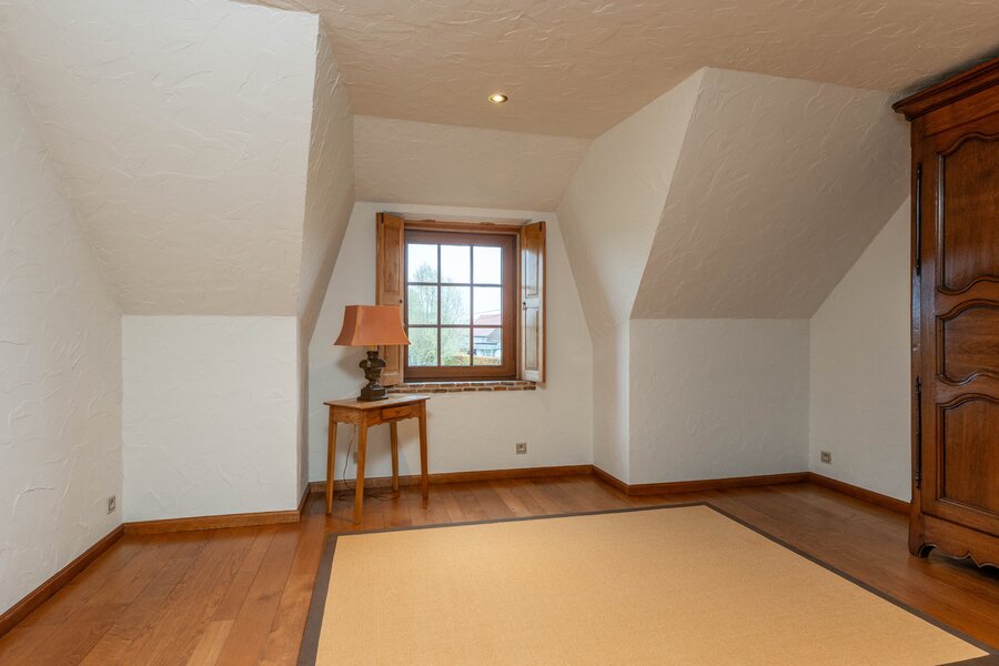 Op de eerste verdieping bevinden zich nog vijf slaapkamers. Eén van de kamers beschikt over een dressing en een eigen badkamer met ligbad, dubbele lavabo en toilet. Verder is er een afzonderlijke douchekamer en een extra toilet. Eén slaapkamer biedt bovendien toegang tot de zolderverdieping, die nog extra bergruimte voorziet.