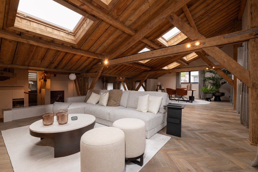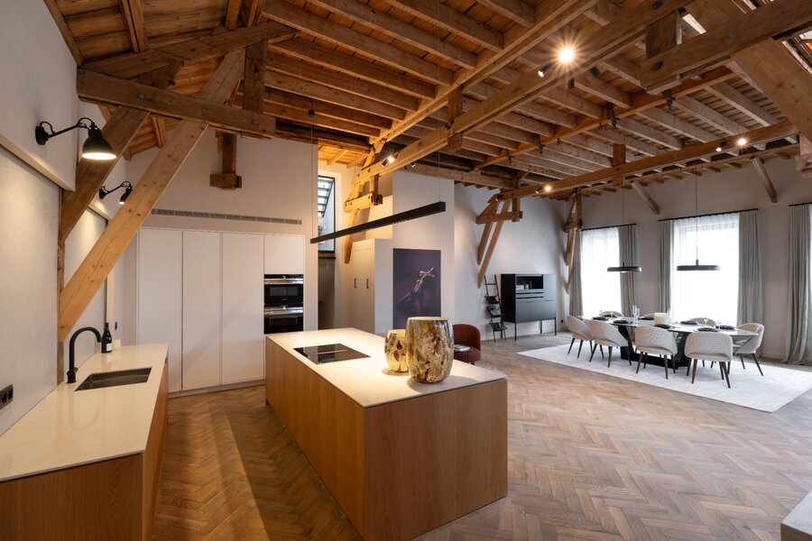 Energiezuinige loft van maar liefst 338 m² bewoonbare oppervlakte met 3 slaapkamers en evenveel badkamers maakt deel uit van een kleinschalig gebouw in neo-renaissancestijl op de hoek van de Mutsaardstraat/ Lange Noordstraat en straalt klasse en monumentaliteit uit. De loft werd in 2022 volledig vernieuwd en strekt zich uit over de tweede en derde verdieping van het gebouw Nottebohm.