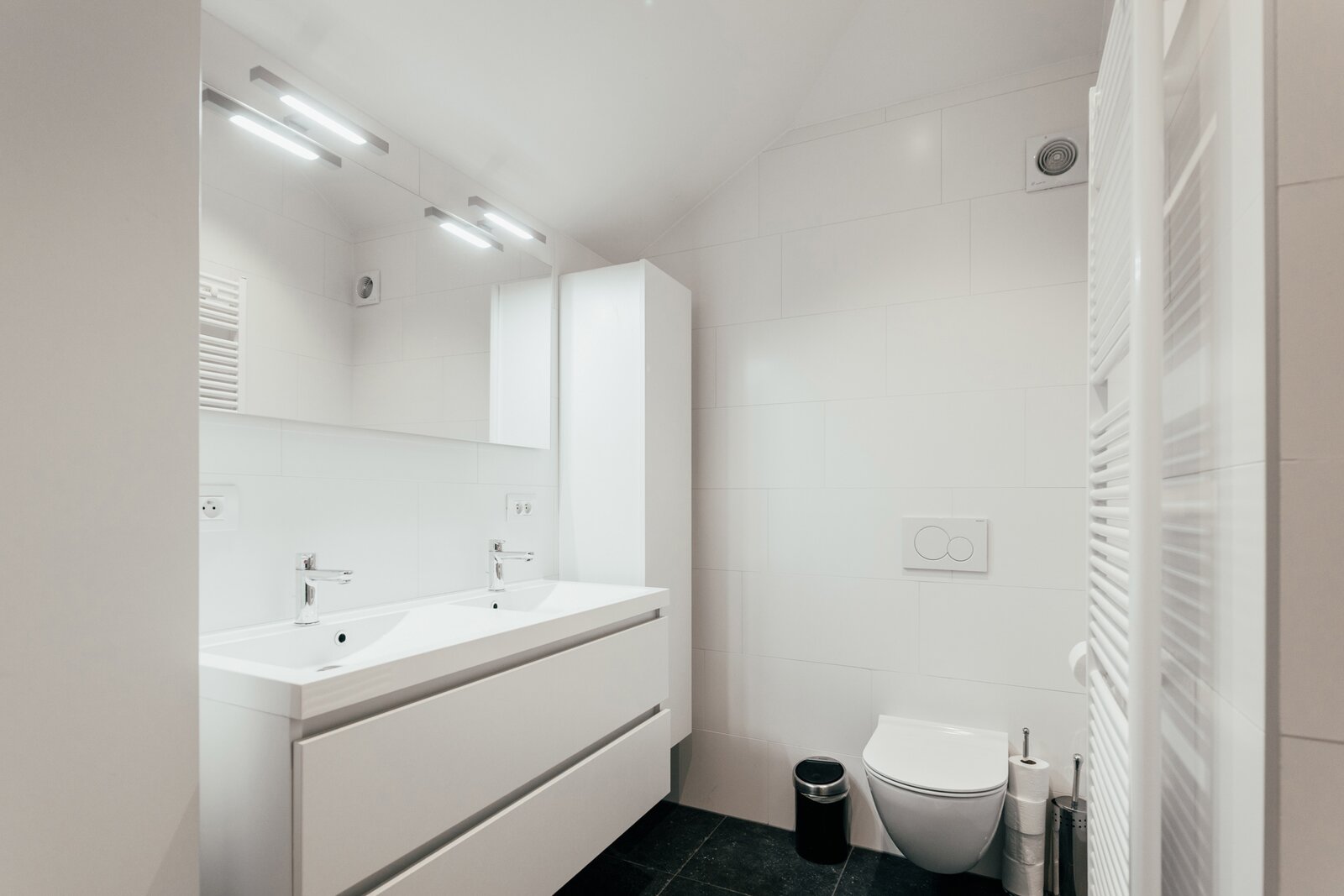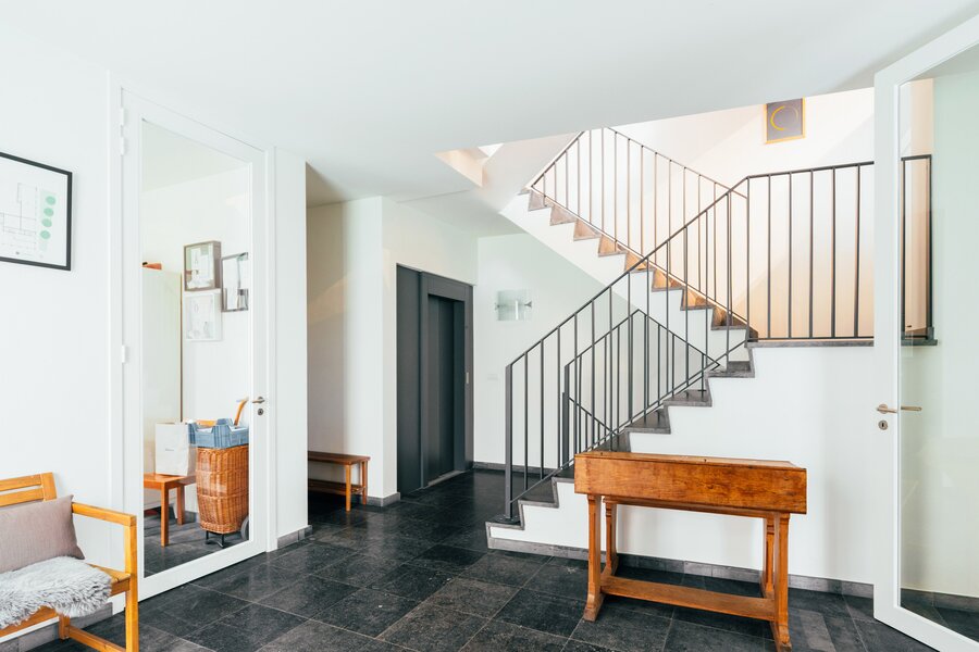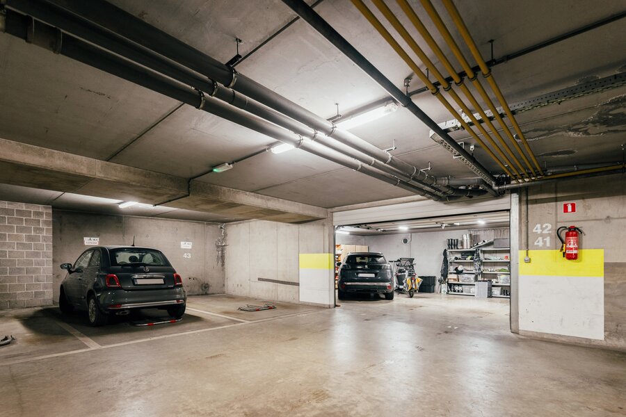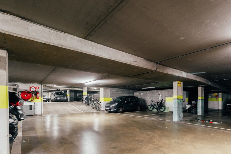 We start with one of the most practical assets of this home: the double integrated garage, easily accessible via the Zirkstraat and offering ample space for two cars and bicycles. From here, you can enter the house directly and take your groceries upstairs using the private lift, which serves all floors from level -1 up to the top.