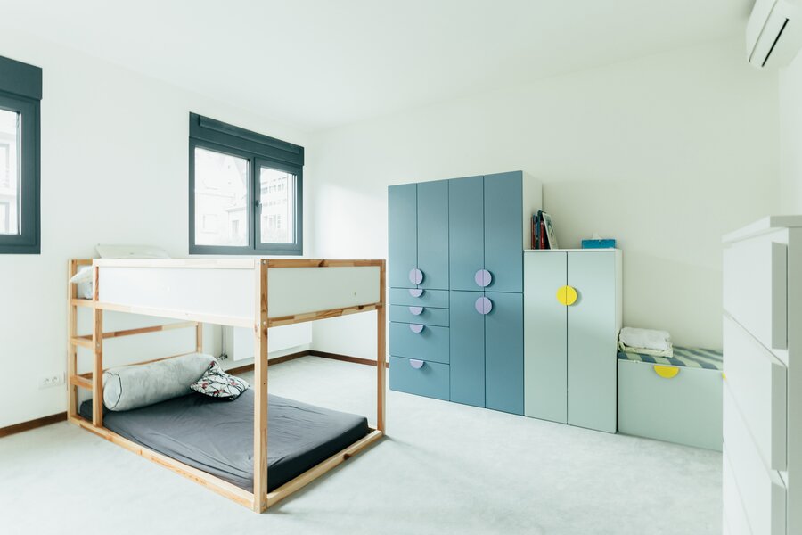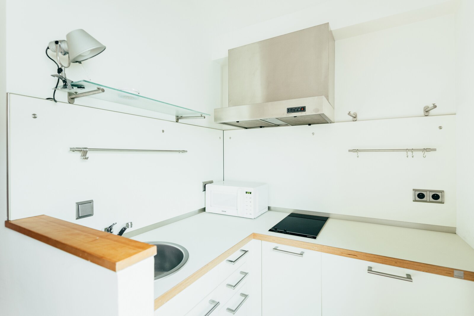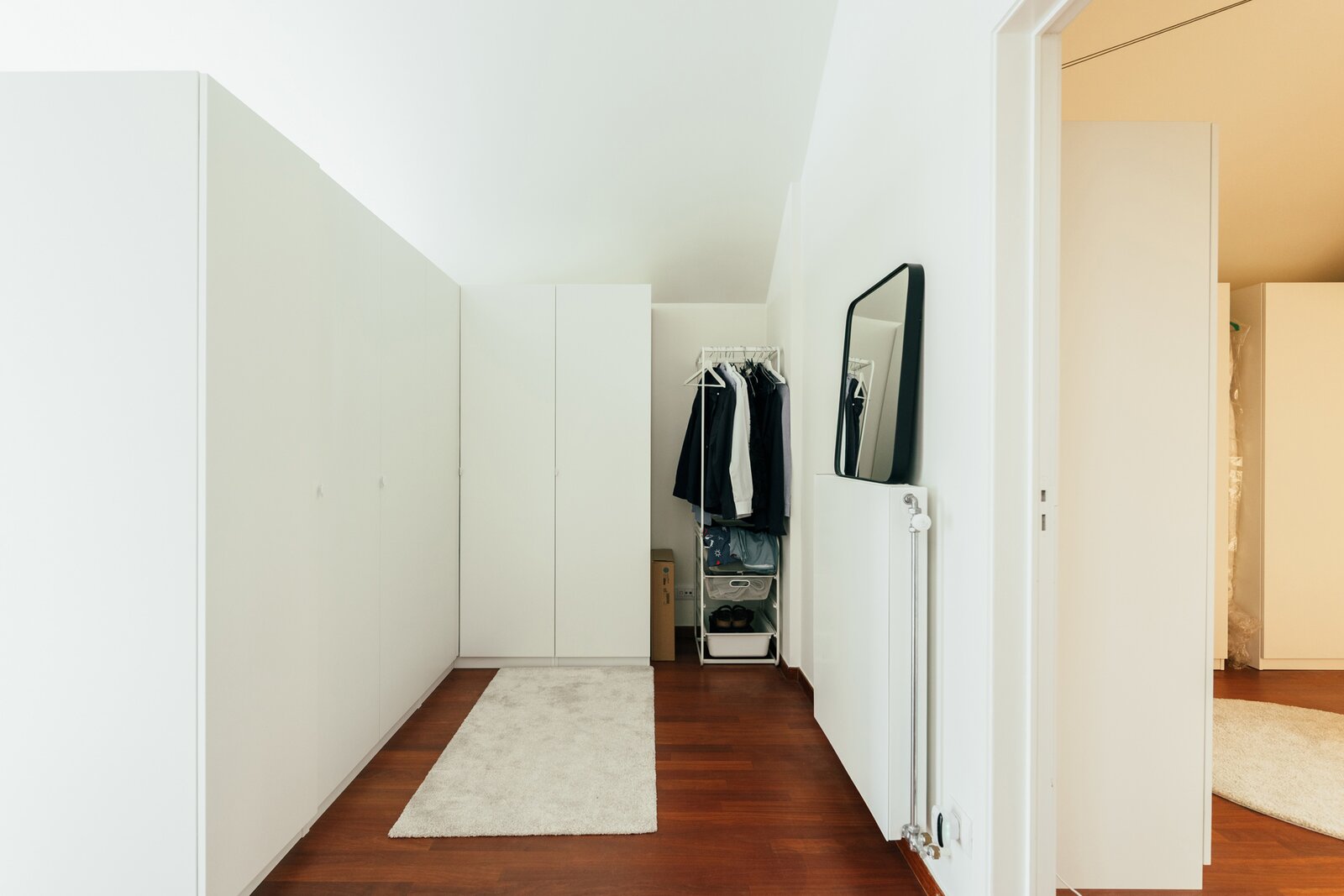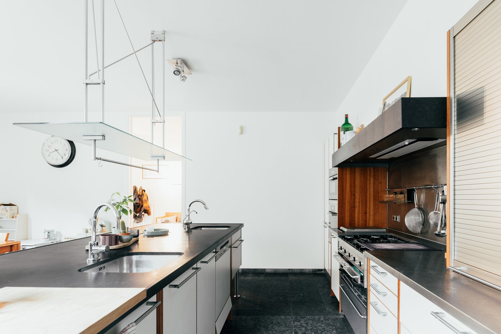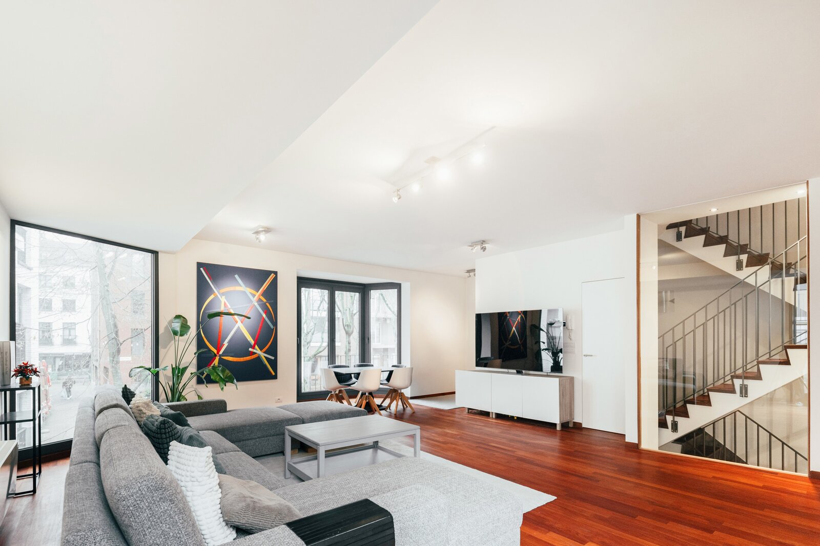 The ground floor consists of an entrance hall with access to the front door opening onto the quiet city square, a very spacious kitchen equipped with gas hob, oven, microwave with steam function and built-in deep fryer, as well as a pleasant, sheltered city garden enjoying sunlight from the afternoon onwards. A home office and guest toilet complete this floor.