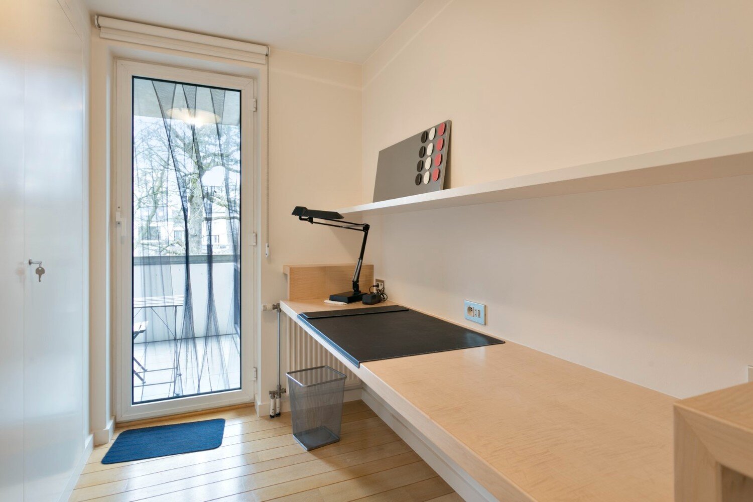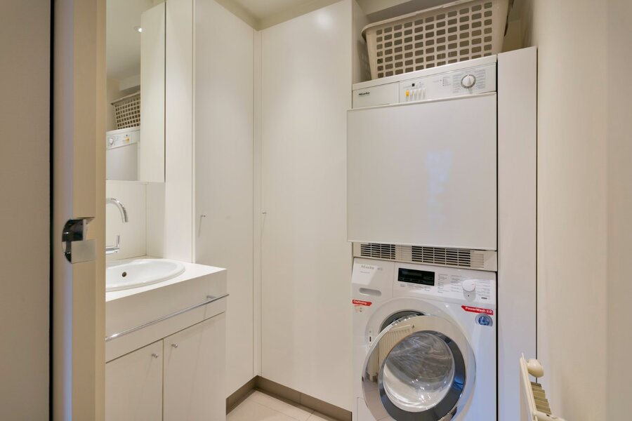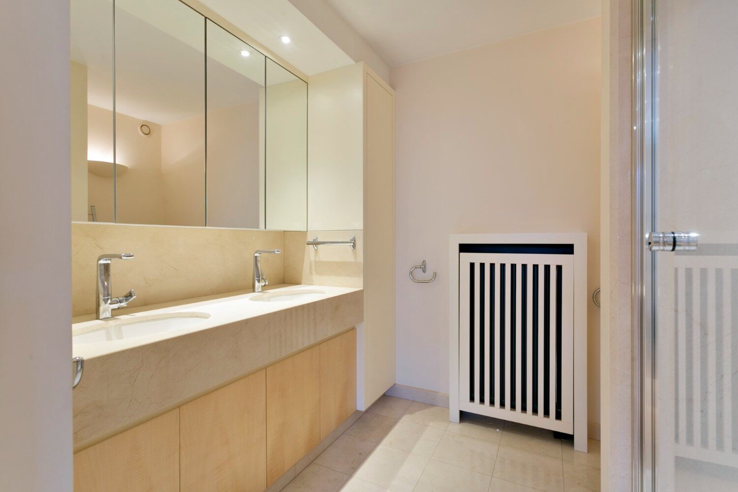 De eerste slaapkamer en het bureau hebben toegang tot het terras, waar het heerlijk vertoeven is. Beide slaapkamers zijn uitgerust met ingebouwde kasten en een tweepersoonsbed. Ook de aparte bureauruimte werd praktisch ingericht, met het oog op voldoende opbergmogelijkheden. Aan de master bedroom grenst de badkamer. Deze badkamer heeft een dubbele lavabo, douche en toilet.