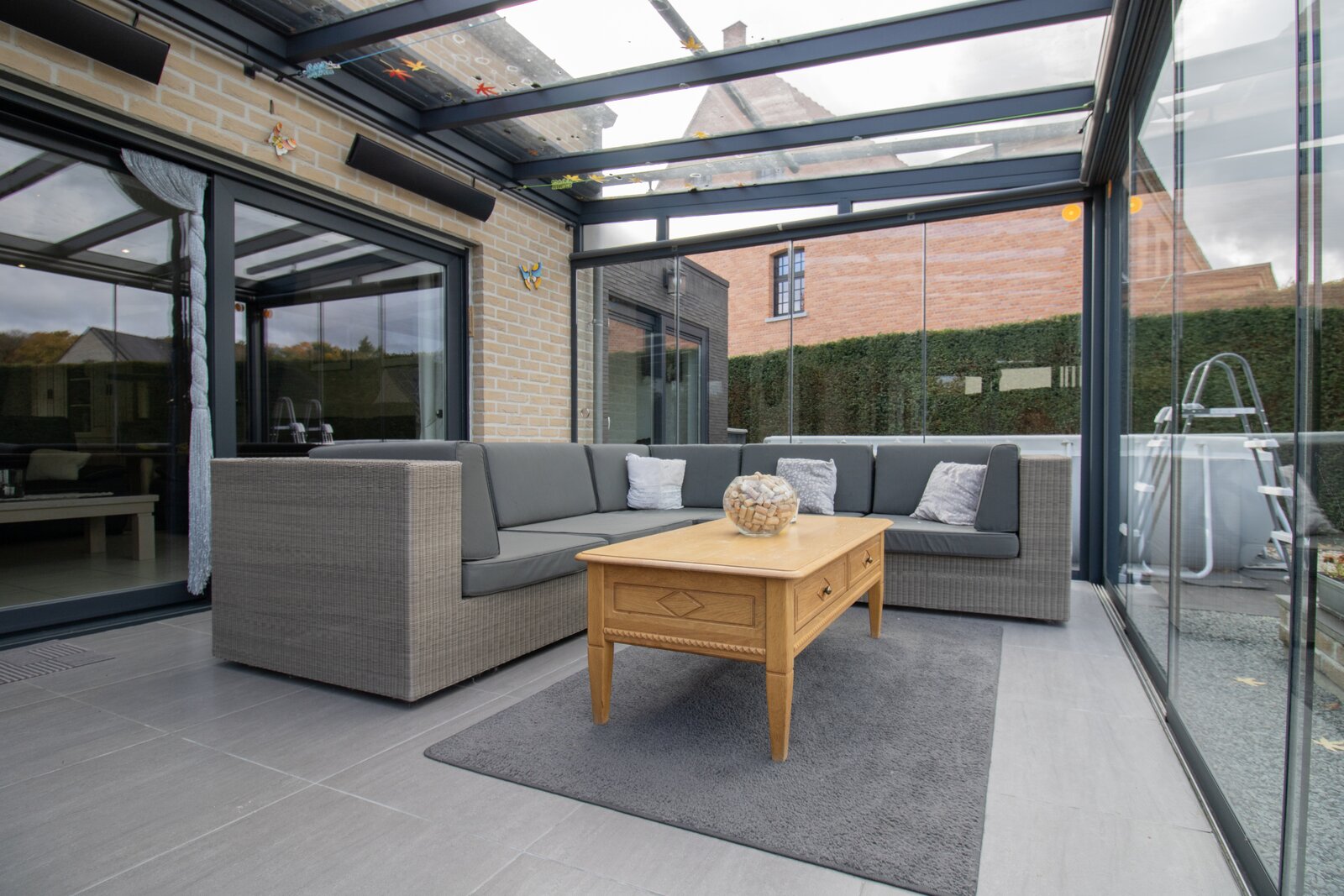 De aangename veranda van 31 m², met pelletkachel en zonneluifel, vormt een extra leefruimte die dankzij de schuifdeuren volledig kan worden geopend voor voeling met de tuin.