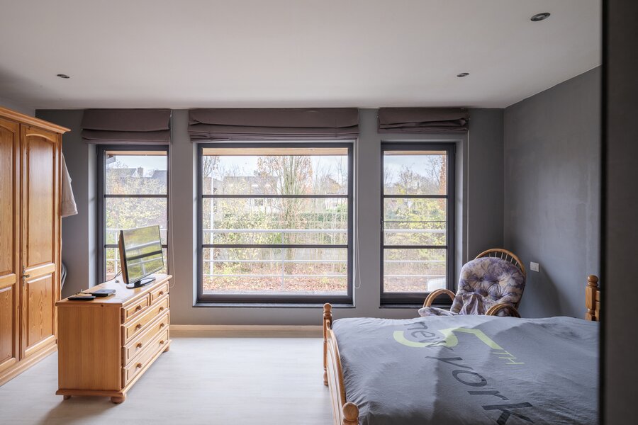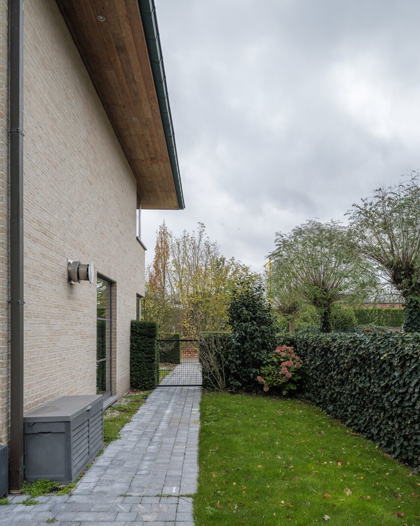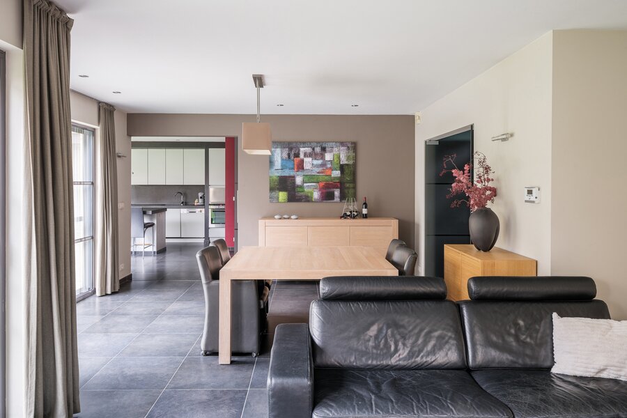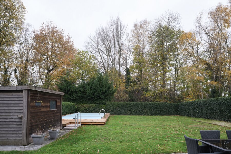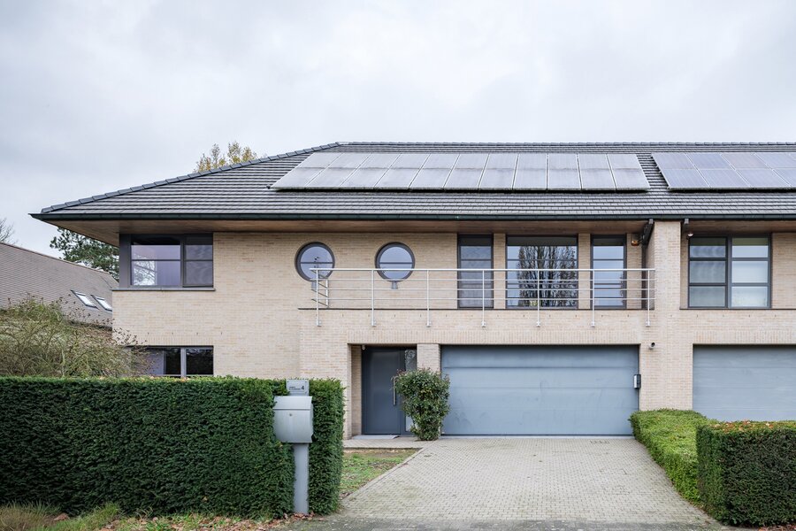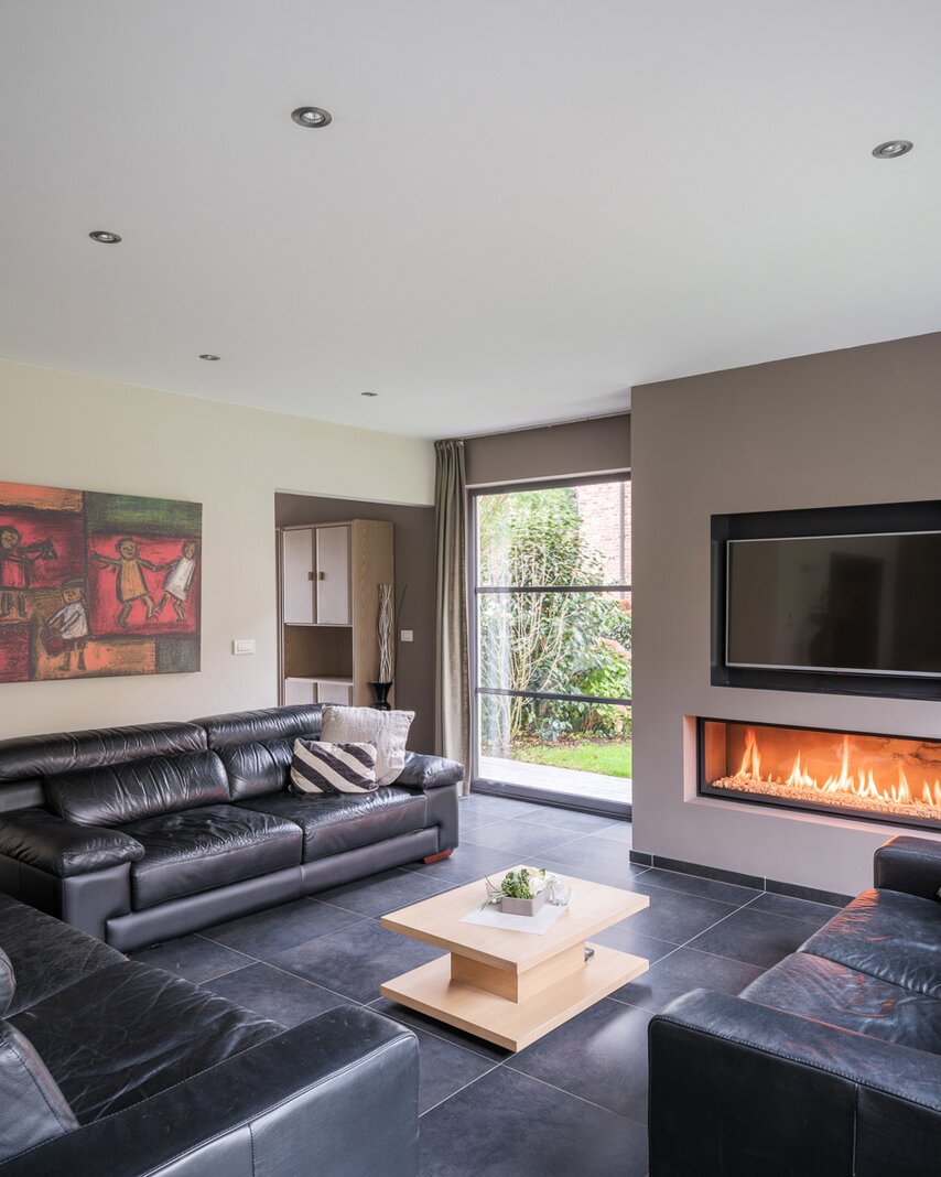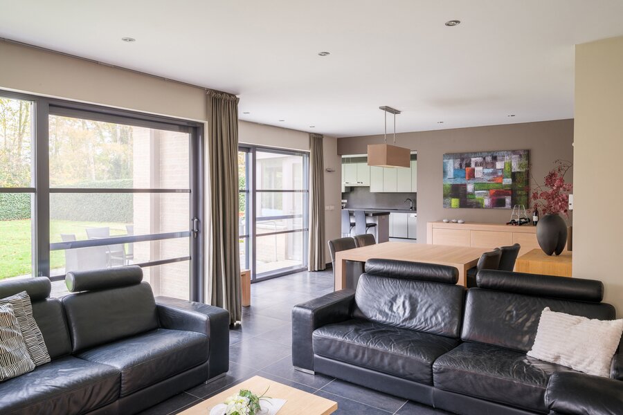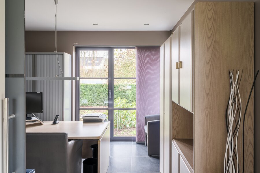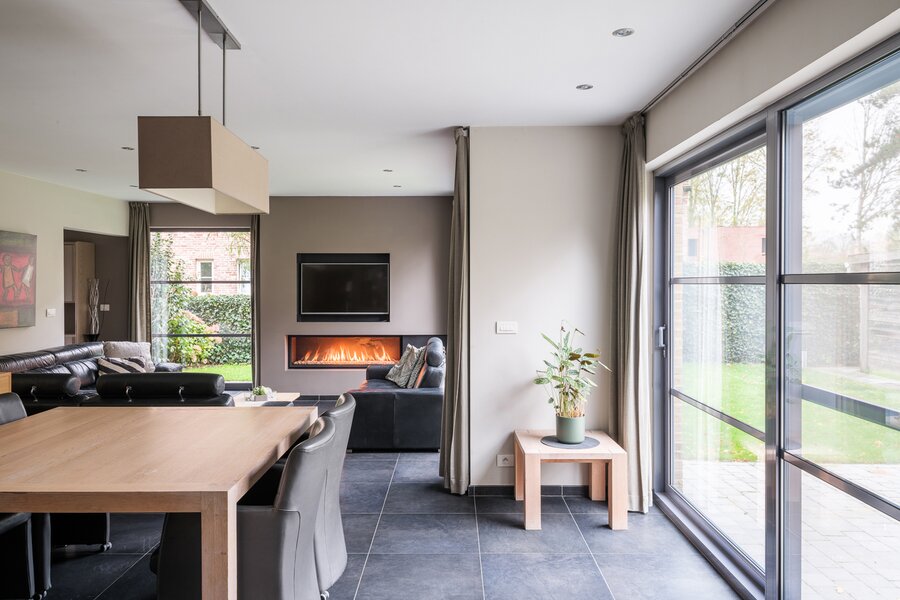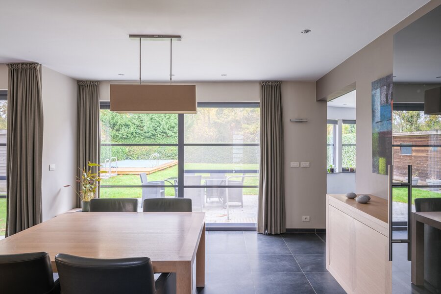 De woning, gebouwd in 2005 en voorzien van een EPC B, biedt alle moderne comfort. Op het gelijkvloers verwelkomt de ruime inkomhal je in een open en lichtrijke leefruimte met gashaard en vloerverwarming. Grote raampartijen zorgen voor een prachtig zicht op de tuin en het zwembad. De aangrenzende keuken is ruim, praktisch en vormt het hart van de woning. Naast de keuken is er een handige wasruimte met directe toegang tot de dubbele garage. Vanuit de leefruimte bereik je een aparte bureauruimte, ideaal voor thuiswerk. Verder op het gelijkvloers vind je een gastentoilet en een eerste badkamer met stoomcabine.