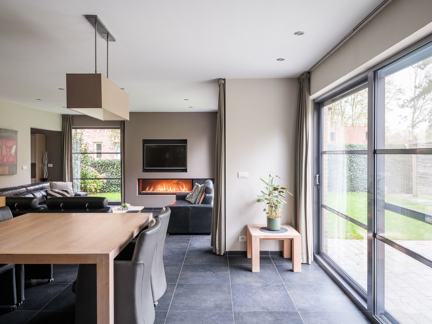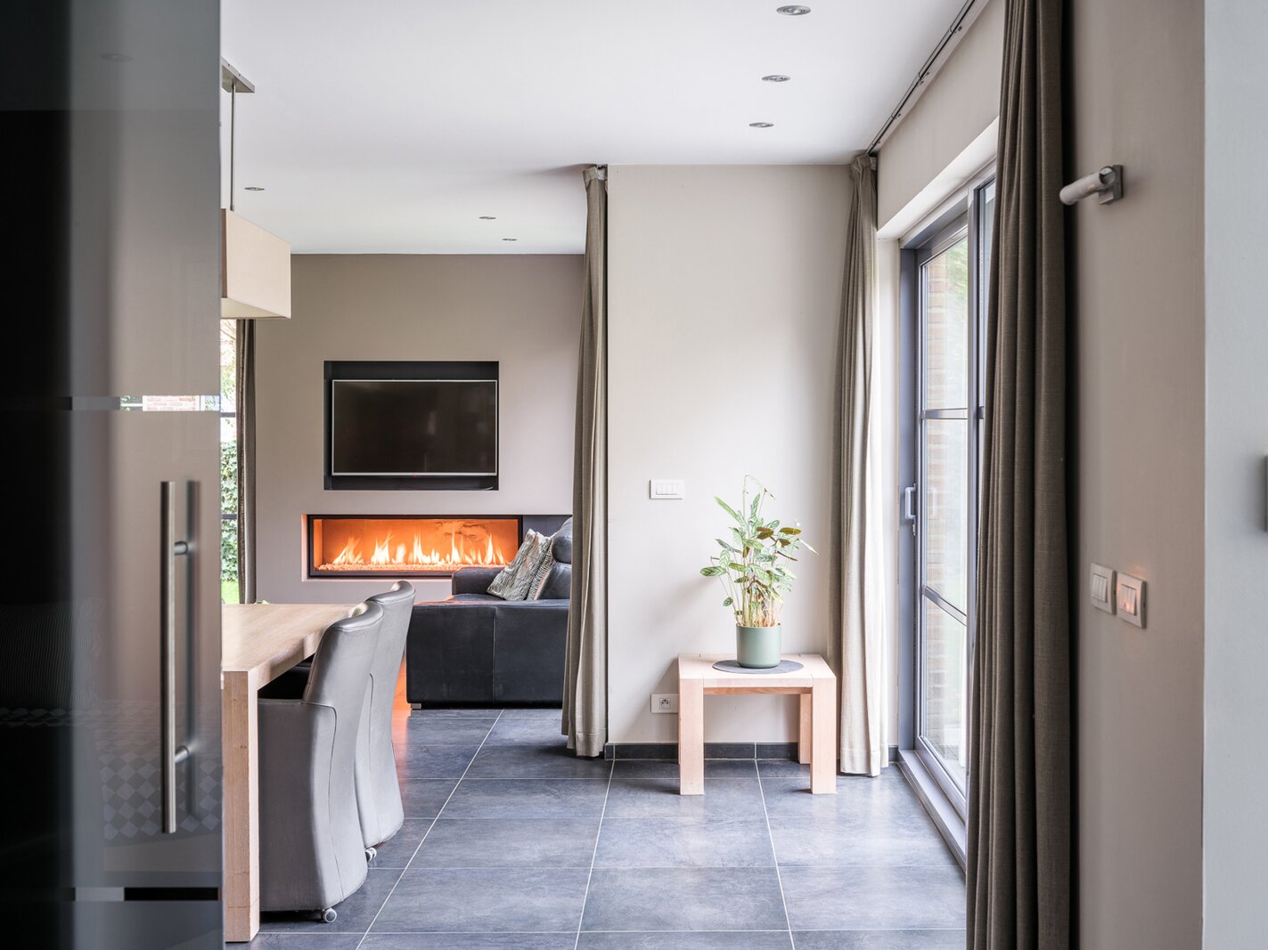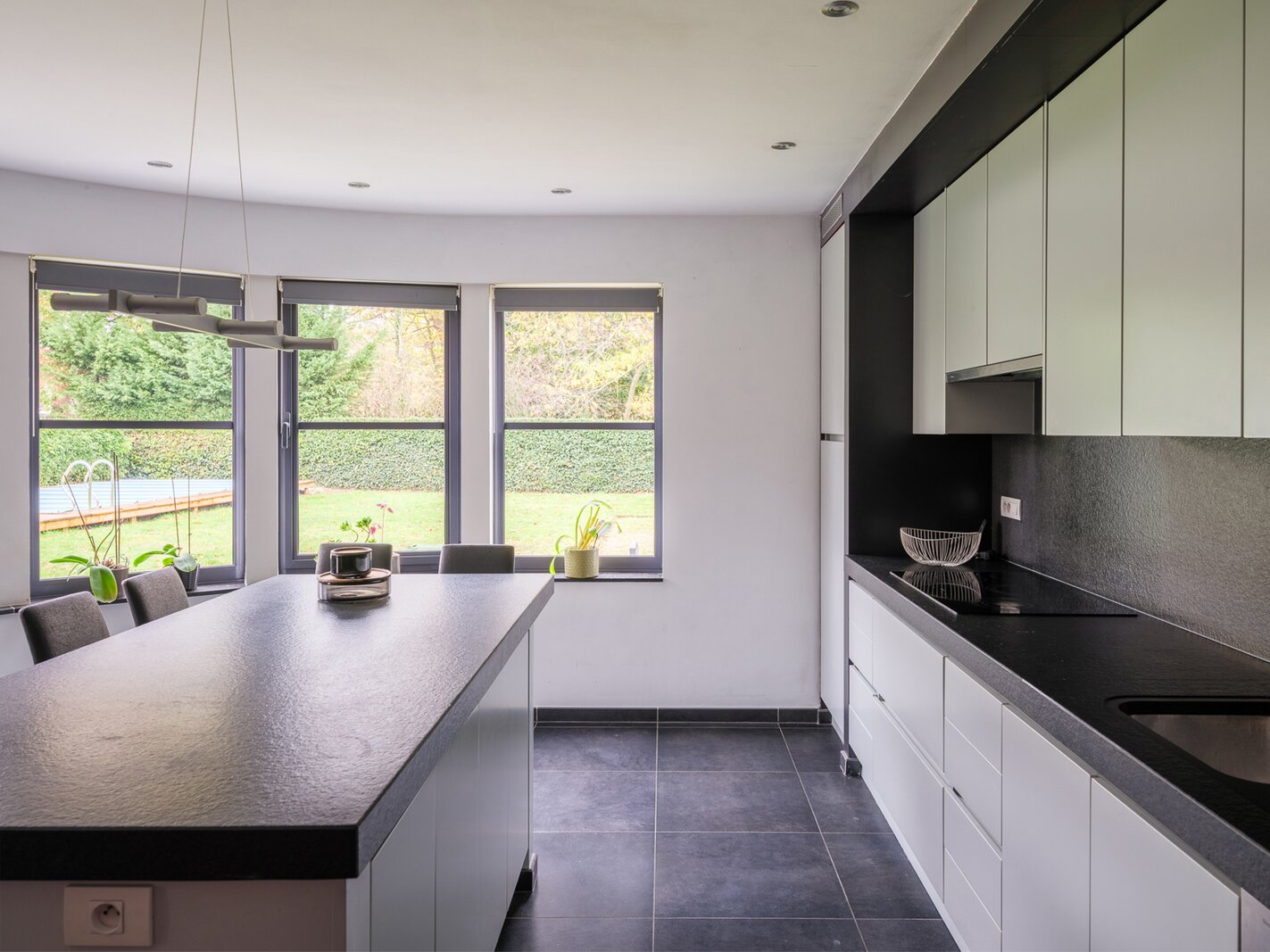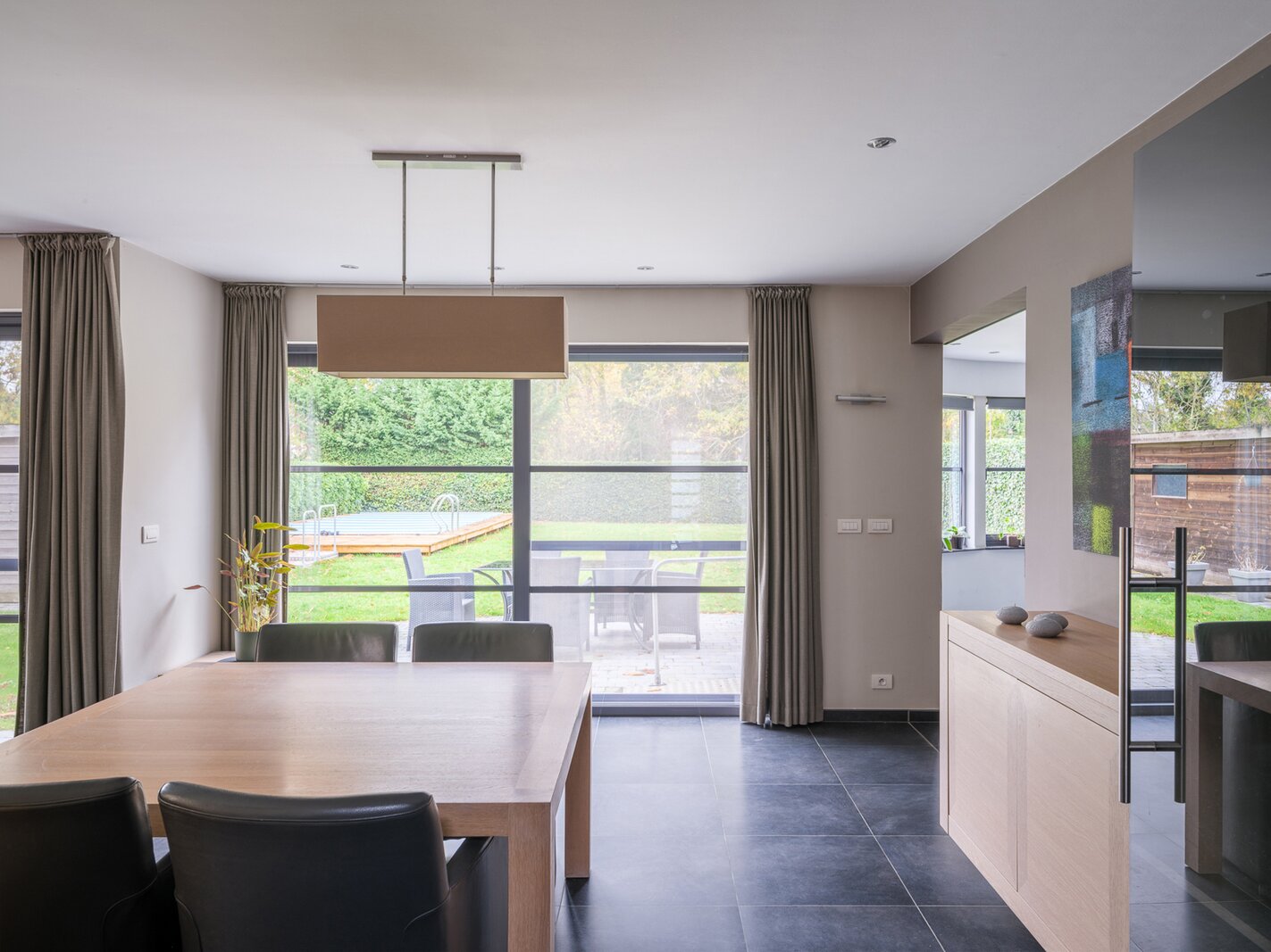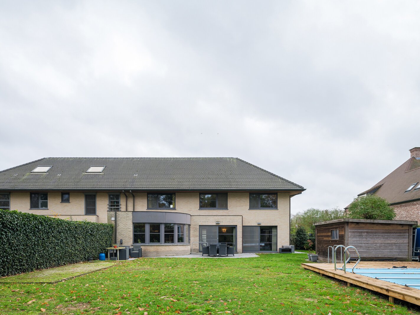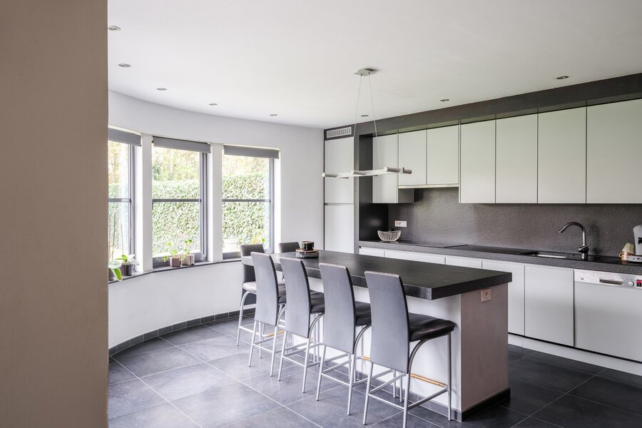 De woning, gebouwd in 2005 en voorzien van een EPC B, biedt alle moderne comfort. Op het gelijkvloers verwelkomt de ruime inkomhal je in een open en lichtrijke leefruimte met gashaard en vloerverwarming. Grote raampartijen zorgen voor een prachtig zicht op de tuin en het zwembad. De aangrenzende keuken is ruim, praktisch en vormt het hart van de woning. Naast de keuken is er een handige wasruimte met directe toegang tot de dubbele garage. Vanuit de leefruimte bereik je een aparte bureauruimte, ideaal voor thuiswerk. Verder op het gelijkvloers vind je een gastentoilet en een eerste badkamer met stoomcabine.