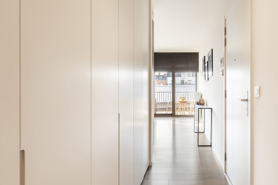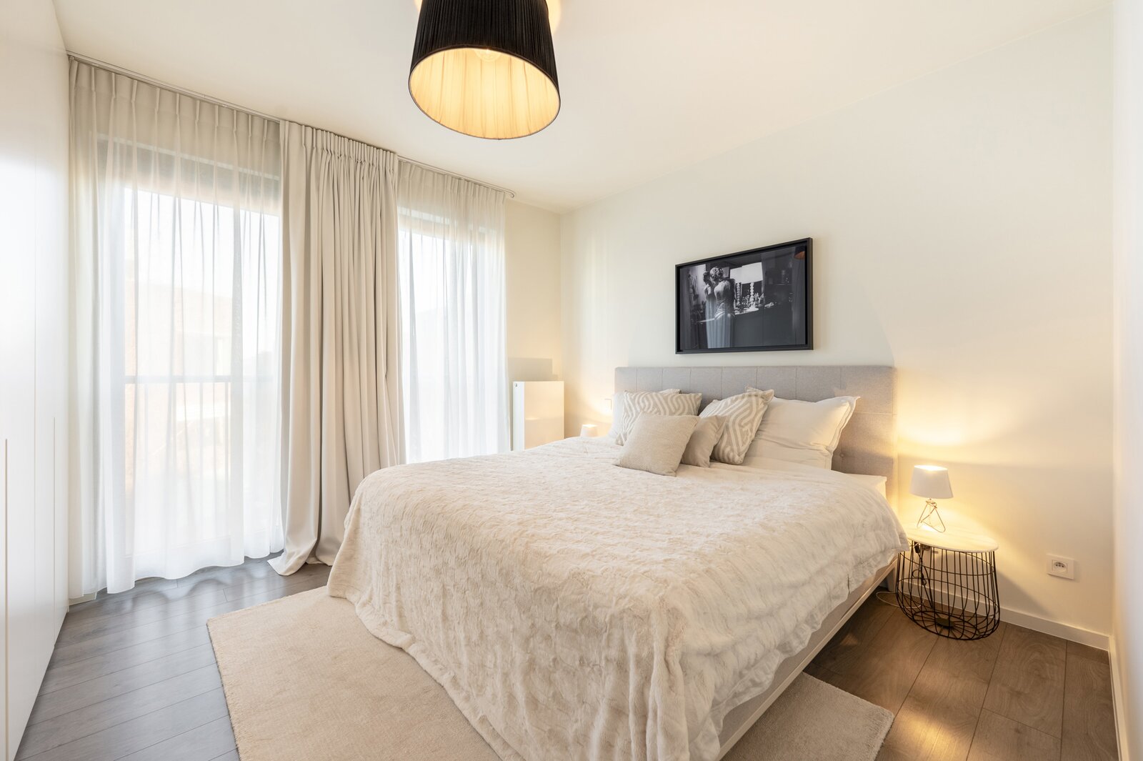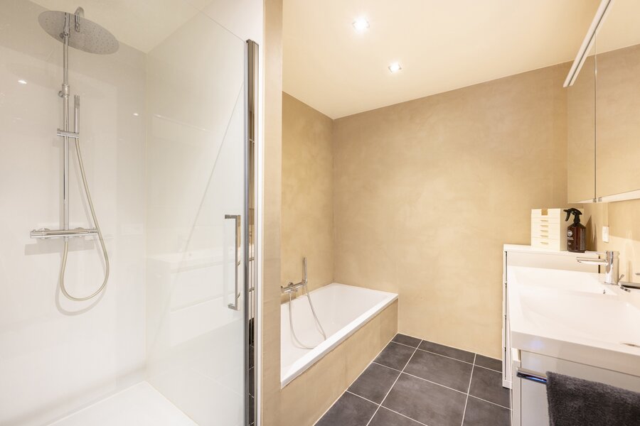 Het appartement beschikt over twee volwaardige slaapkamers, beide uitgerust met ingebouwde kasten. Verder is er een ruim waskot aanwezig. De badkamer, afgewerkt in stijlvolle mortex, is voorzien van een ligbad, inloopdouche en dubbele lavabo.