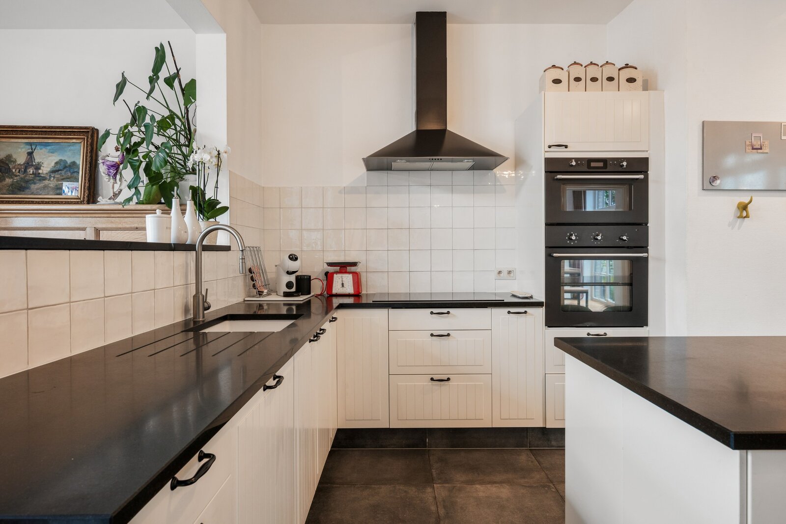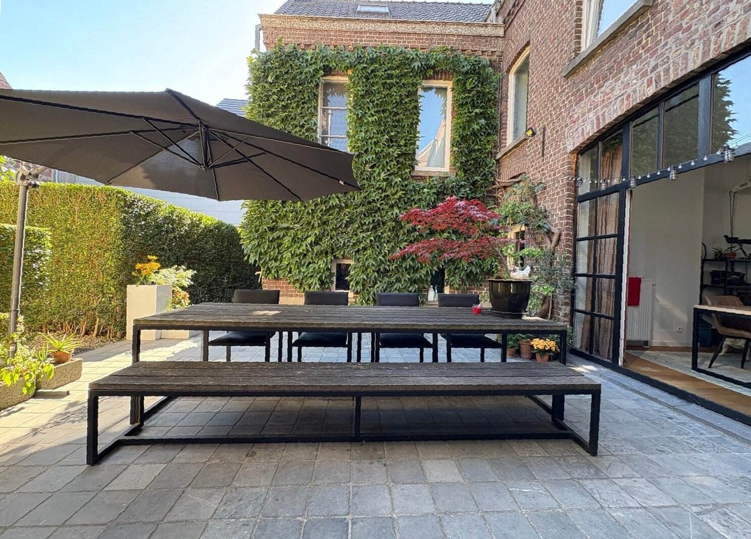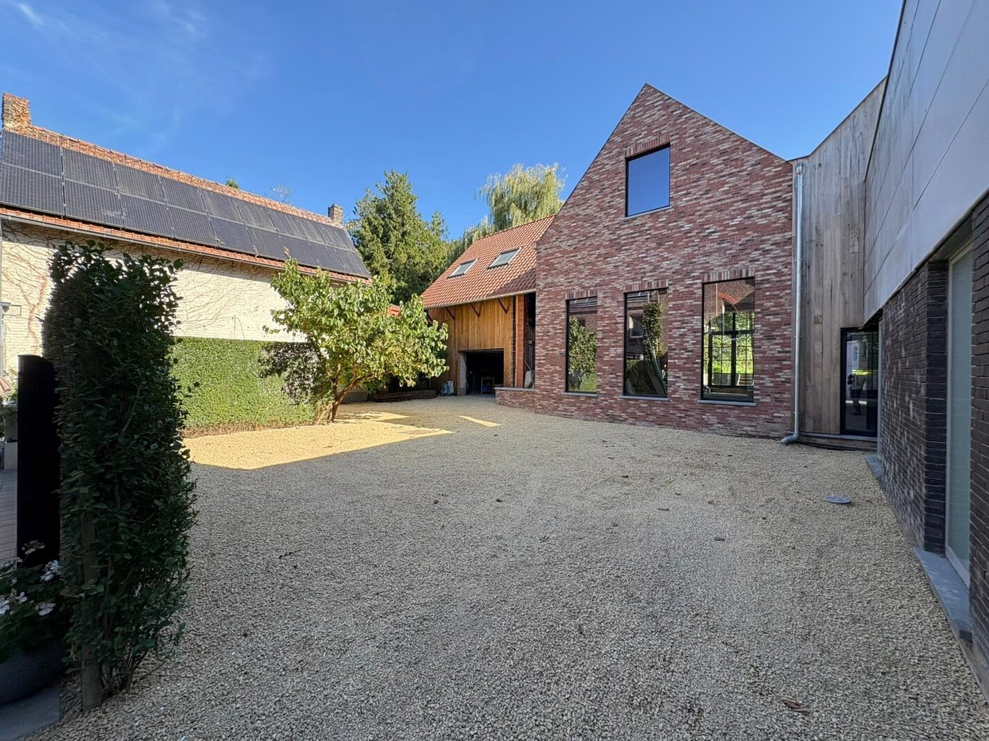 De 18de-eeuwse hoofdwoning is instapklaar en biedt een warme, huiselijke sfeer met royale volumes. Momenteel wordt deze gebruikt als kantoorruimte én woning. Tussen de herenwoning en de nieuwbouwwoning bevindt zich een binnenplaats met terras en parking voor 2-3 wagens. Achteraan ligt een prachtige, diepe tuin, een oase van rust. Via de achterkant is er ook aansluiting met een handige uitweg.