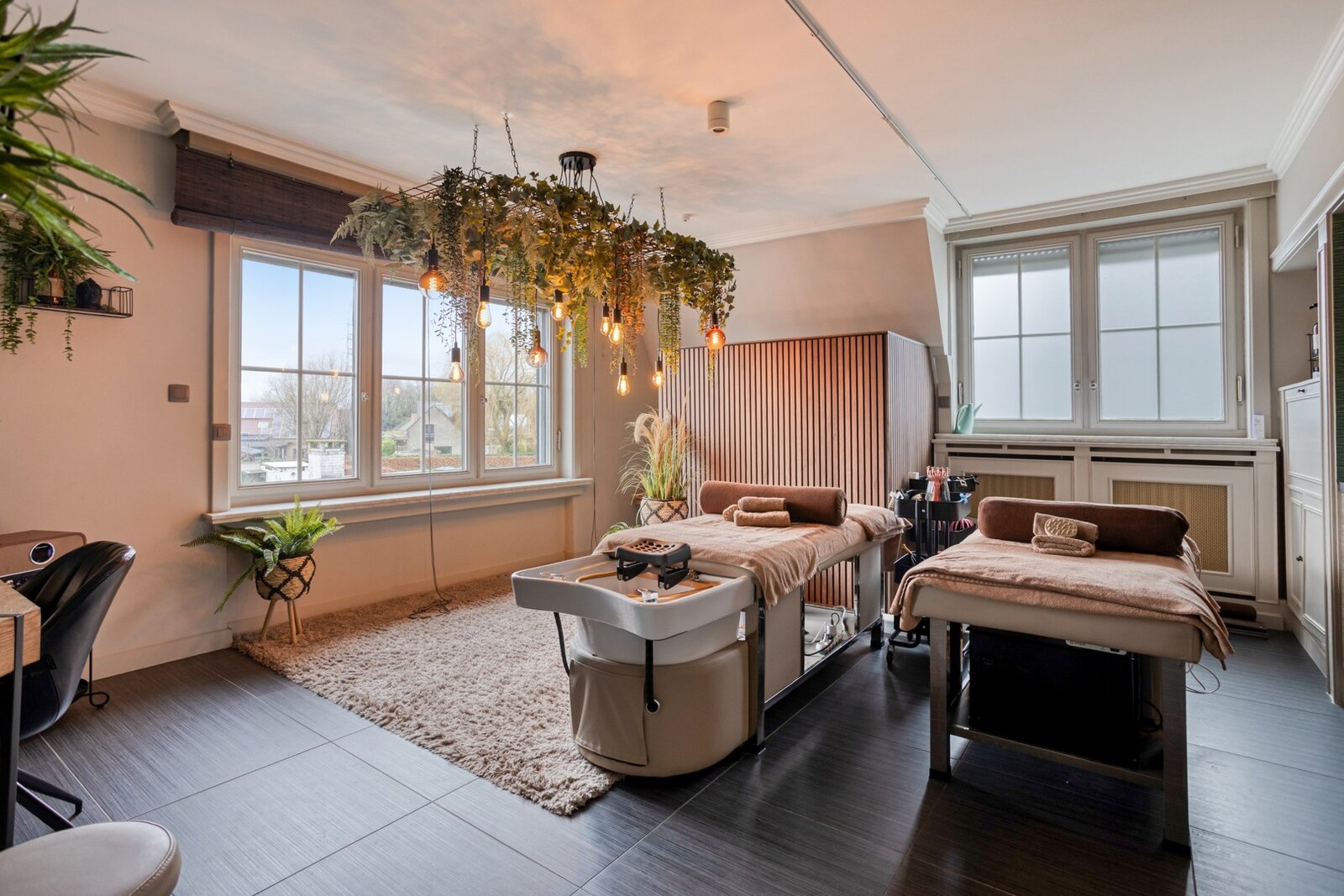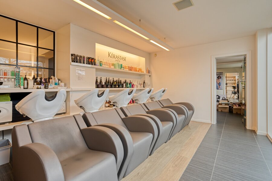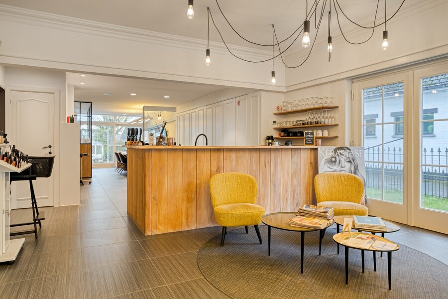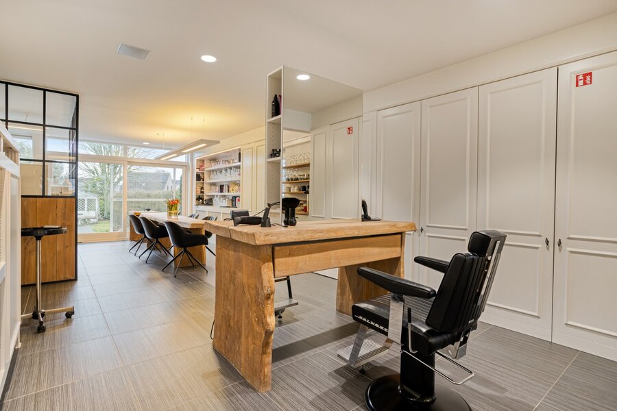 De volledige gelijkvloerse verdieping is thans ingericht als een hoogwaardige schoonheids- en kapperszaak met: