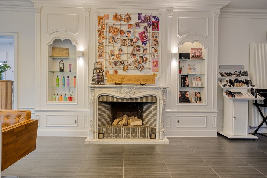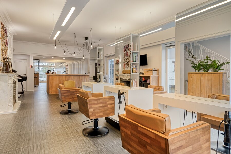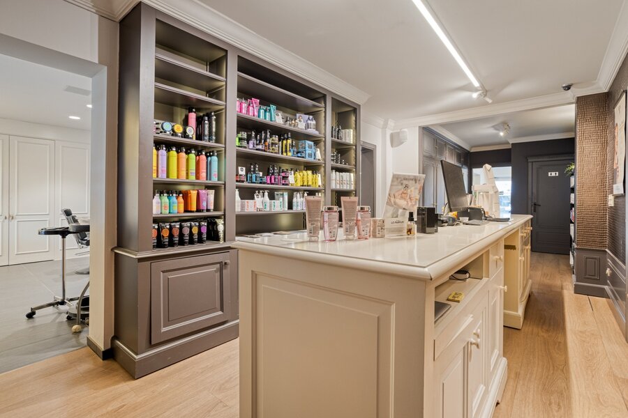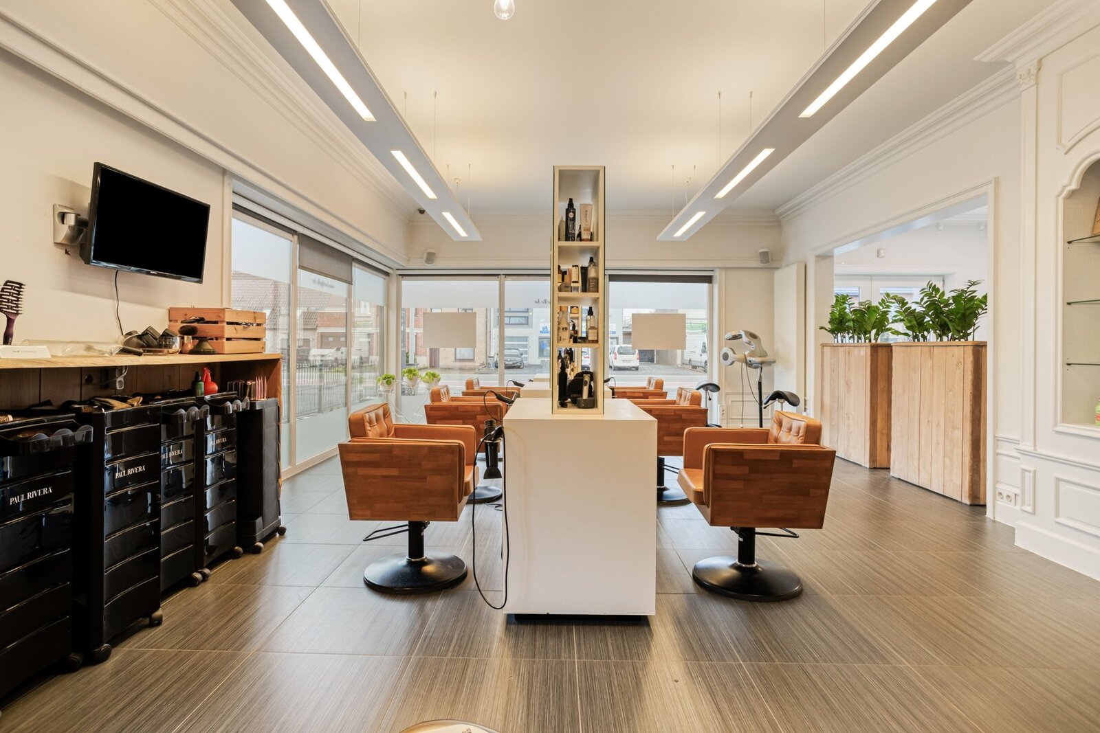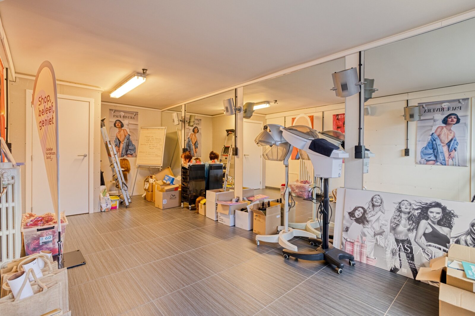 De volledige gelijkvloerse verdieping is thans ingericht als een hoogwaardige schoonheids- en kapperszaak met: