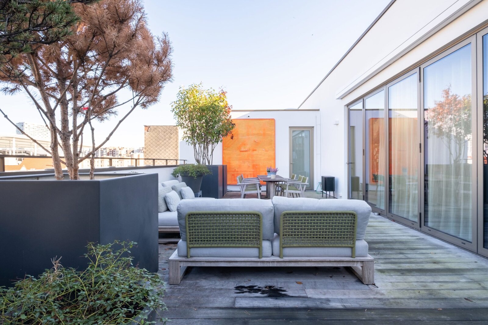 On both sides of the penthouse are spacious terraces with different orientations and beautiful views of the gardens and the city beyond.