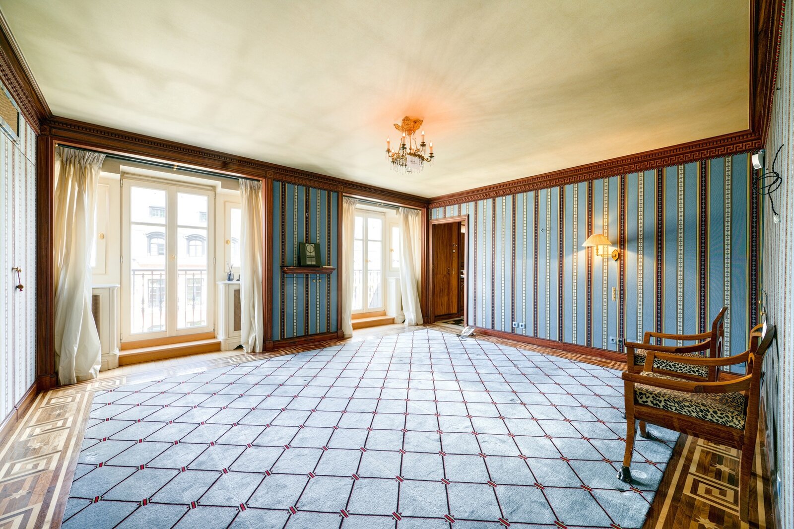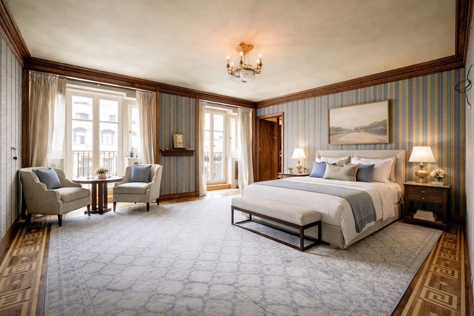 The townhouse offers six suites, each with its own dressing room and en-suite bathroom, as well as several leisure areas including a sauna, a hammam, a fitness room, and a spacious dressing area under the eaves.