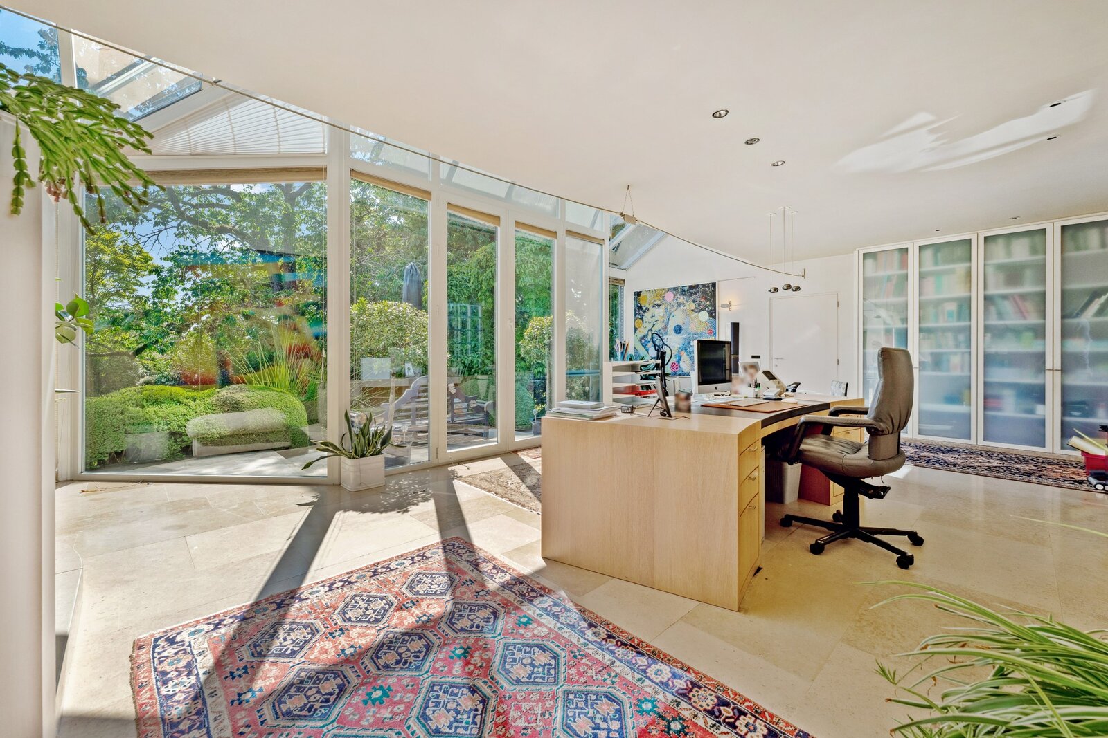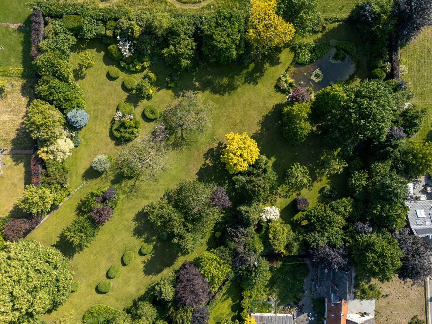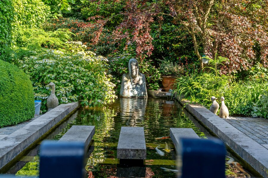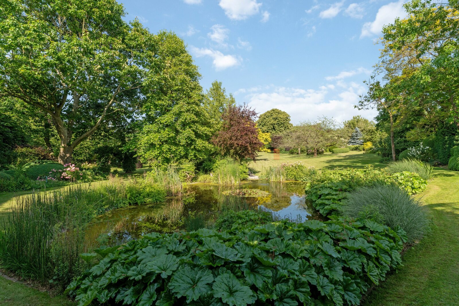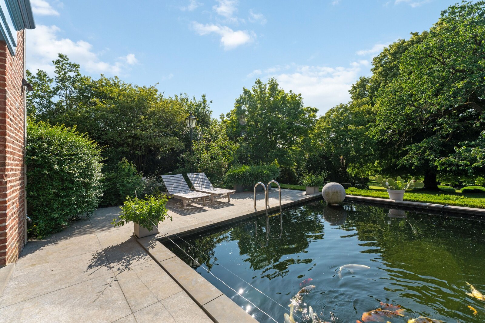 De idyllische, volgroeide tuin met grote zwemvijver vormt een verlengstuk van het woongenot. Er is ook een tuinberging en een garage van ca. 100 m².