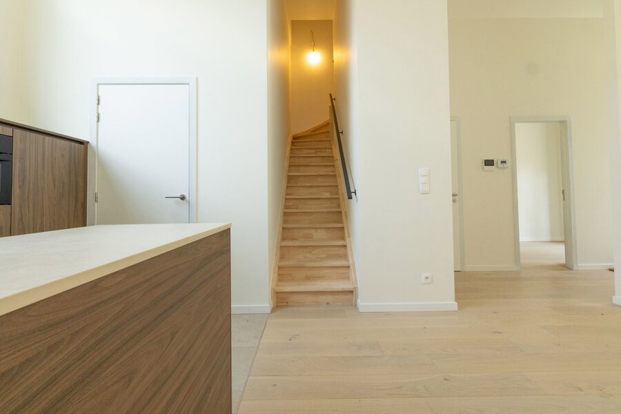 Apartment 9B is a spacious duplex in the inner area, away from the street and overlooking the garden. The entrance hall leads to the living room with open kitchen. The high ceilings immediately catch the eye. The kitchen is fully equipped. Next to the kitchen is a very large storage room with connections for a washing machine and dryer.