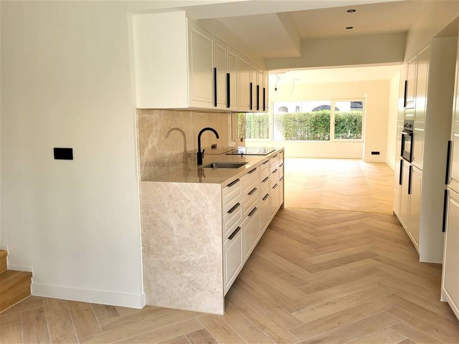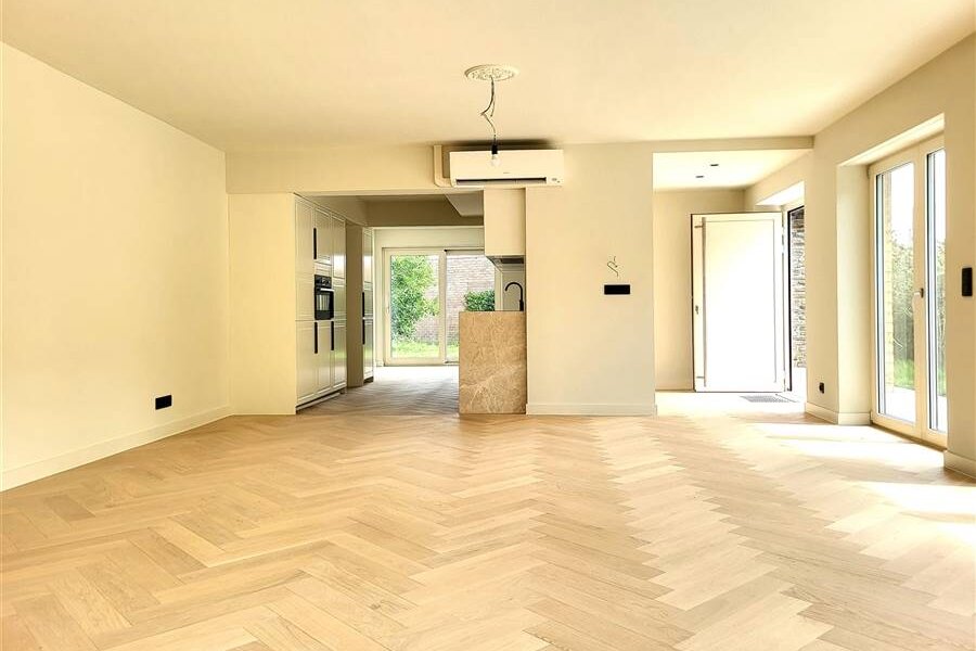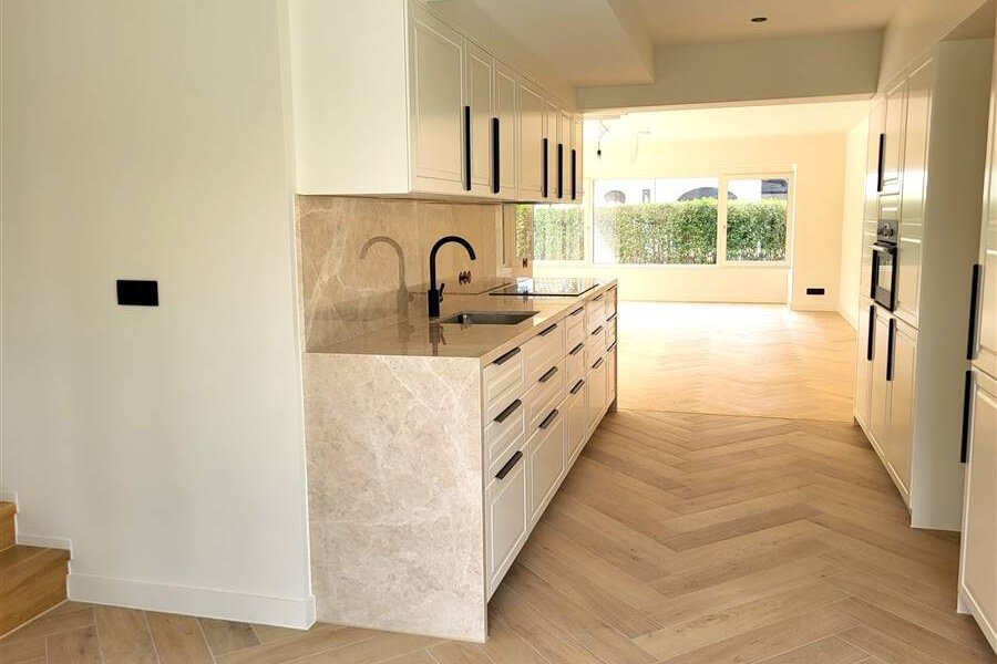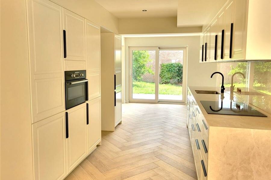 Op korte afstand van het station en Lippenslaan treffen we deze stijlvolle gerenoveerde woning. Deze werd net van kop tot teen volledig gestript en is in instapklare toestand. Beneden vinden we een zeer ruime en lichte leefruimte op parket met schuiframen rondom en met een open ingerichte keuken met eetruimte aan de tuinzijde. Aansluitend terras te betreden via grote schuiframen. De bovenverdieping is prima ingedeeld met een mooie badkamer en drie volwaardige slaapkamers op parket. Inpandige garage en volwaardige kelders. Aangename en zonnige tuin rondom. Onmiddellijk beschikbaar!