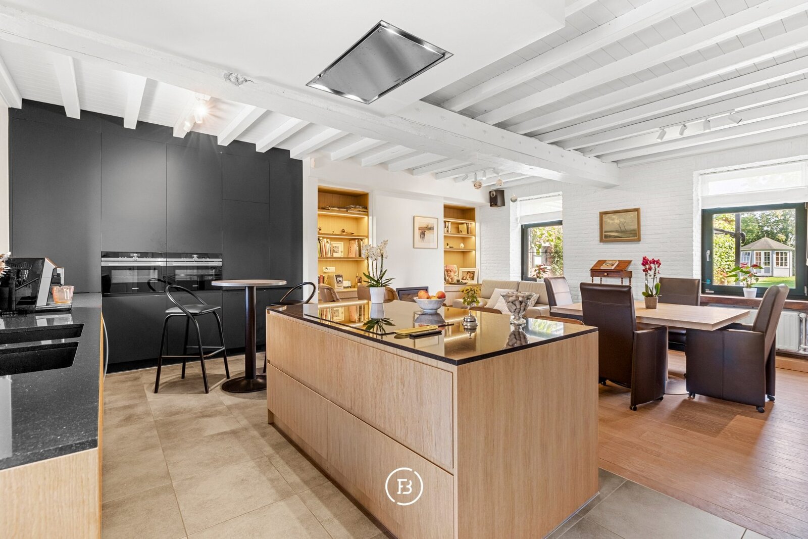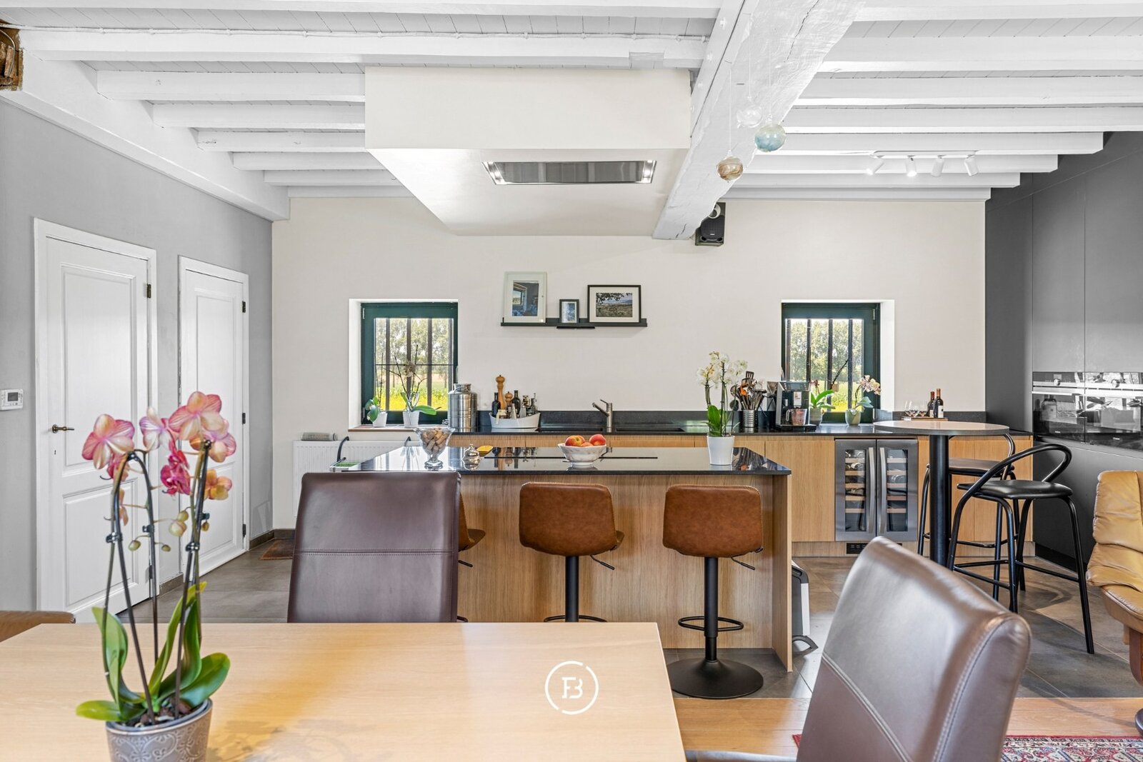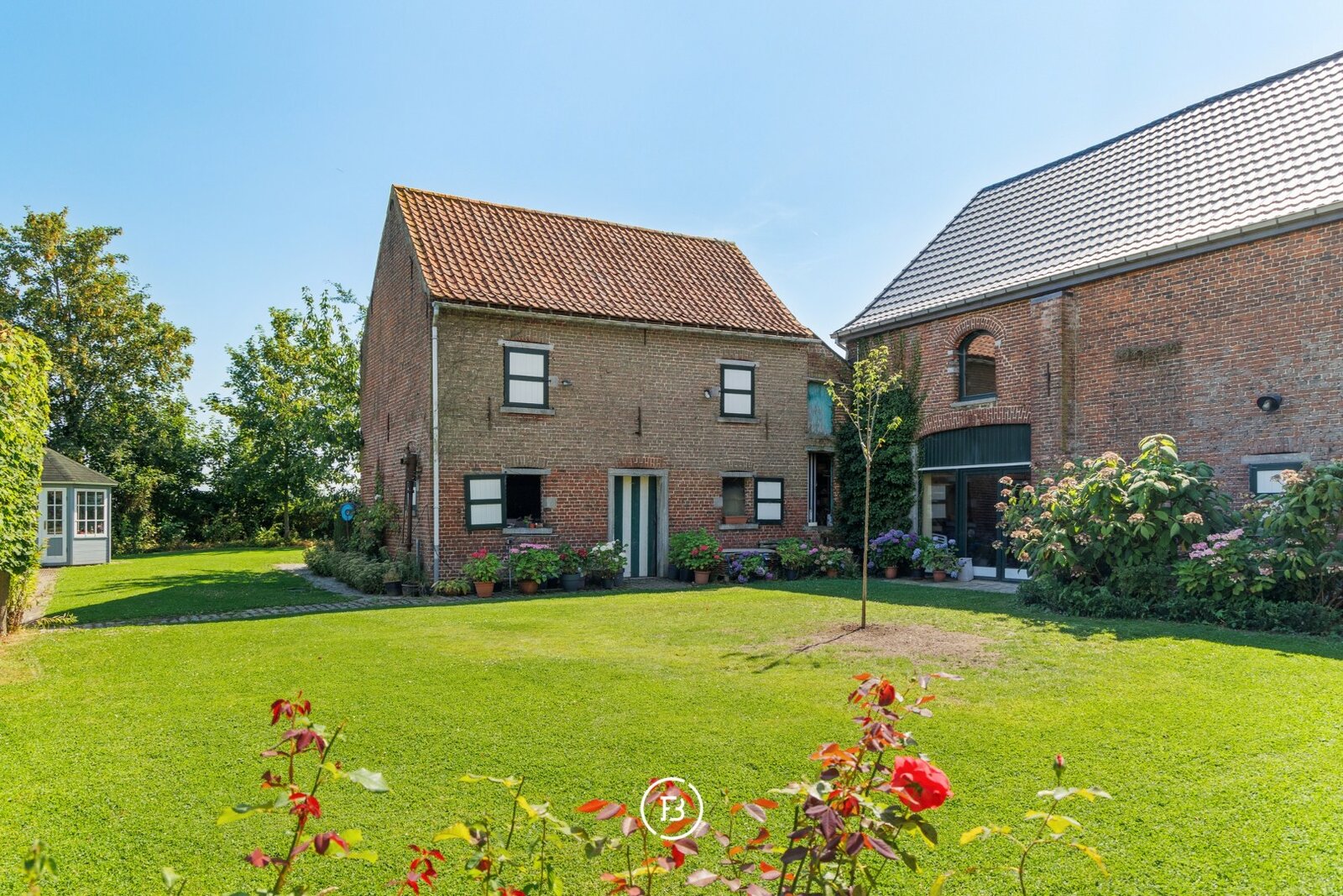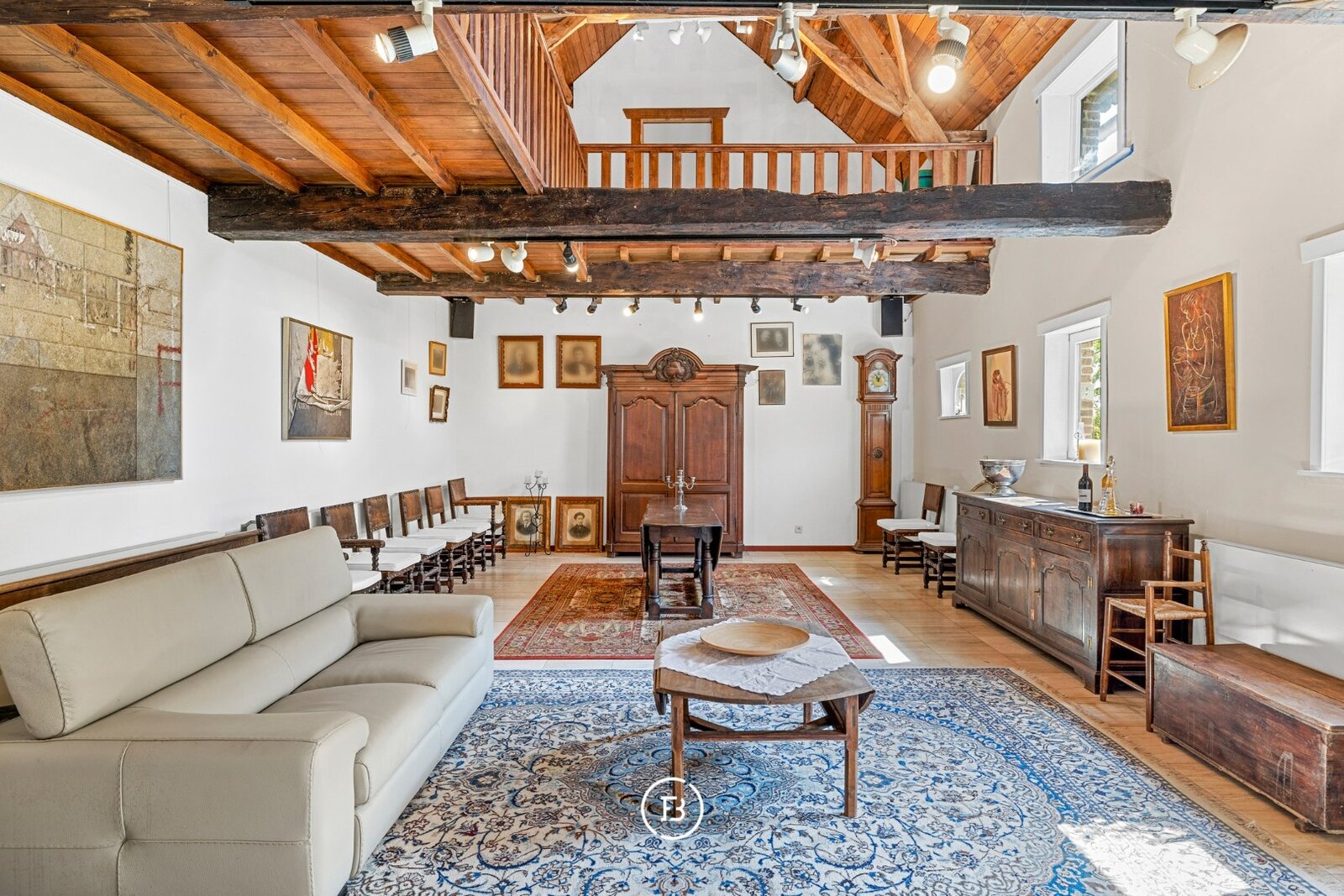 In de linkerschuur schuilt een polyvalente ruimte met tal van mogelijkheden, ideaal voor een vrij beroep of creatieve invulling. Hier zijn bovendien extra bergruimtes en een keuken voorzien.
