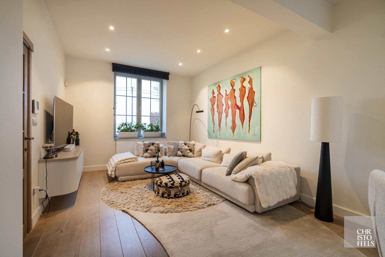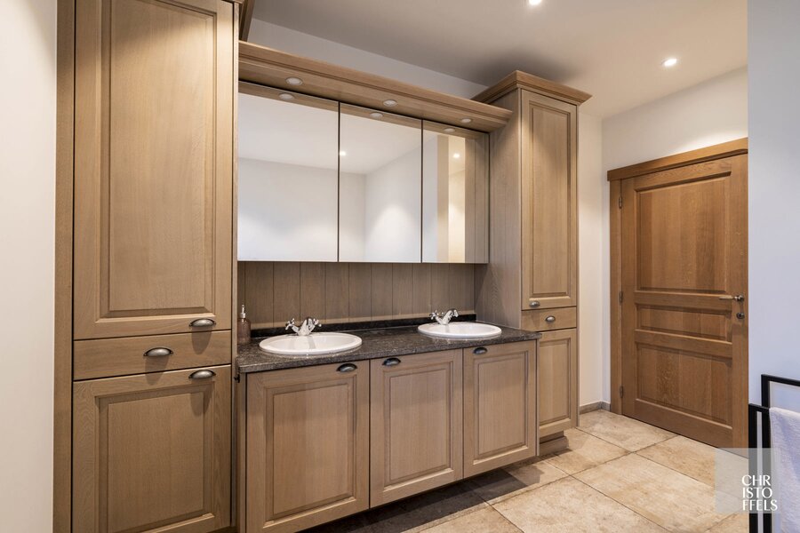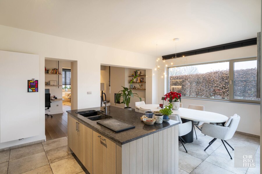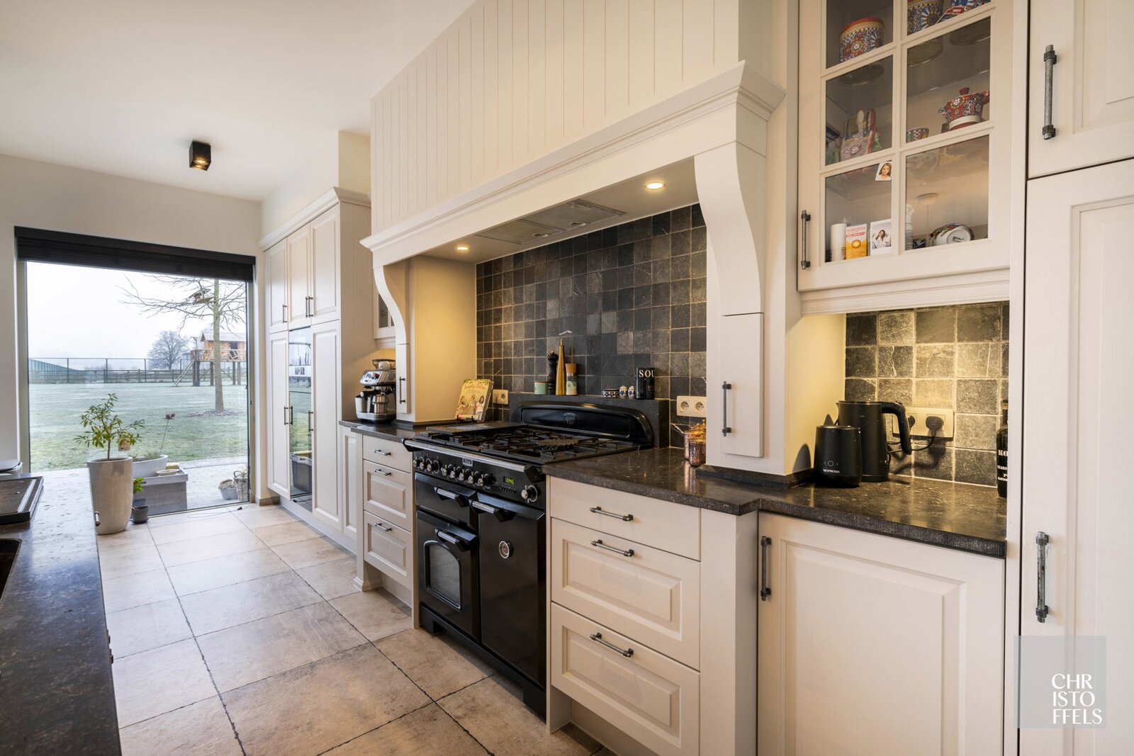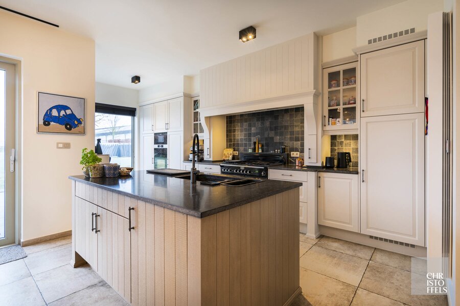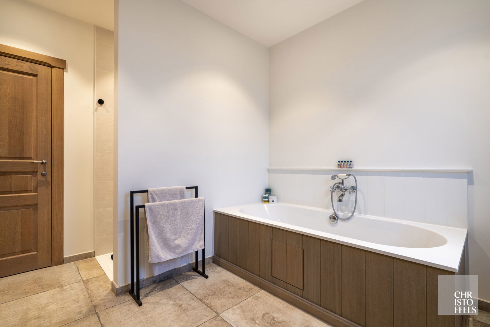 The property features a custom-made interior, solar panels, a solar boiler and air conditioning in the living room and on the first floor. The central entrance hall leads to the bright living room with a separate TV corner, a cosy sitting area around the wood-burning fireplace, a built-in desk corner and a cosy dining area. Adjacent to this is the fully fitted custom kitchen with natural stone worktop, equipped with a Falcon gas stove, refrigerator, wine refrigerator, combi-oven, dishwasher, extractor hood and double sink.