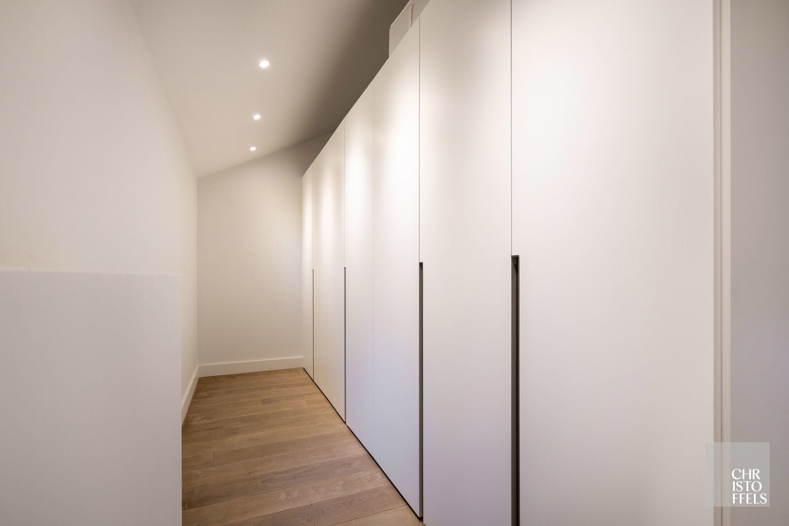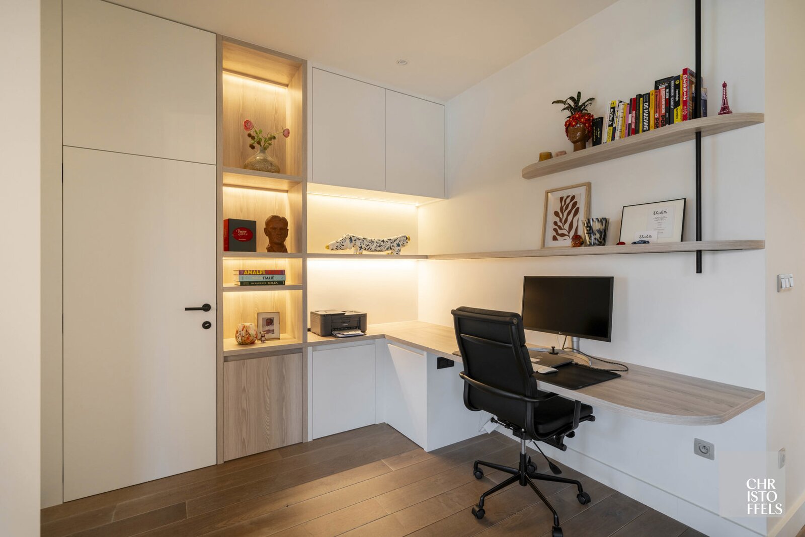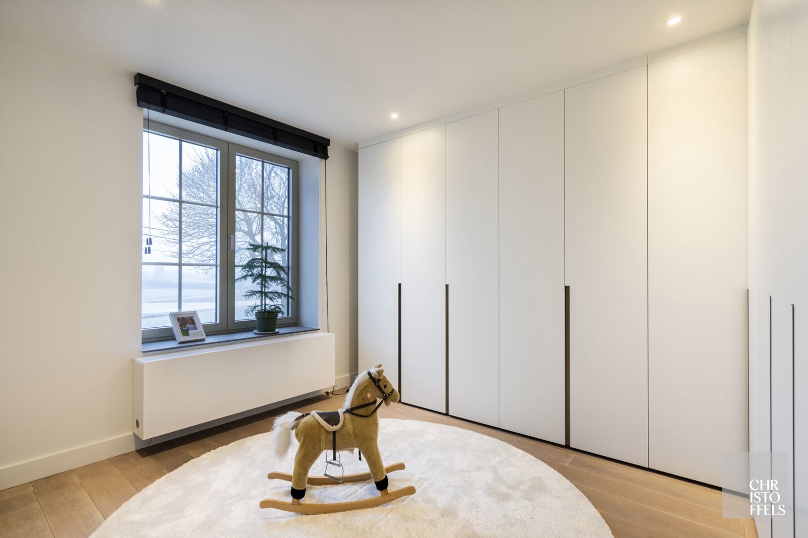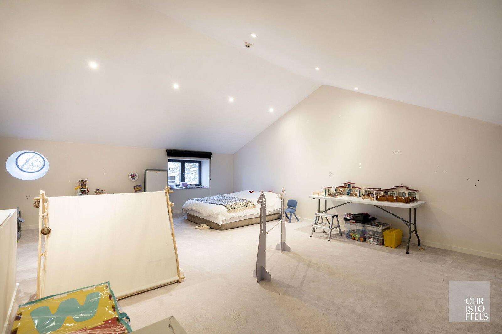 The property features a custom-made interior, solar panels, a solar boiler and air conditioning in the living room and on the first floor. The central entrance hall leads to the bright living room with a separate TV corner, a cosy sitting area around the wood-burning fireplace, a built-in desk corner and a cosy dining area. Adjacent to this is the fully fitted custom kitchen with natural stone worktop, equipped with a Falcon gas stove, refrigerator, wine refrigerator, combi-oven, dishwasher, extractor hood and double sink.
