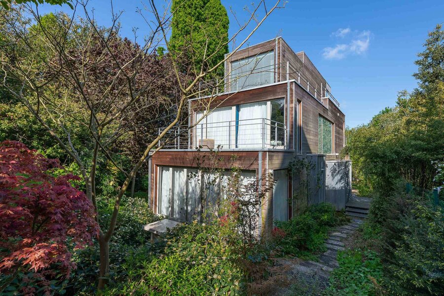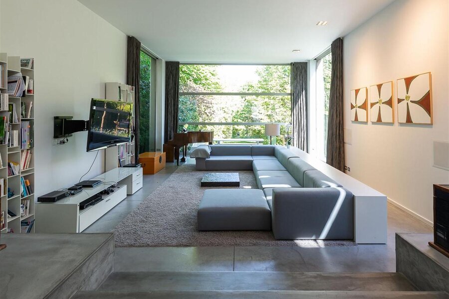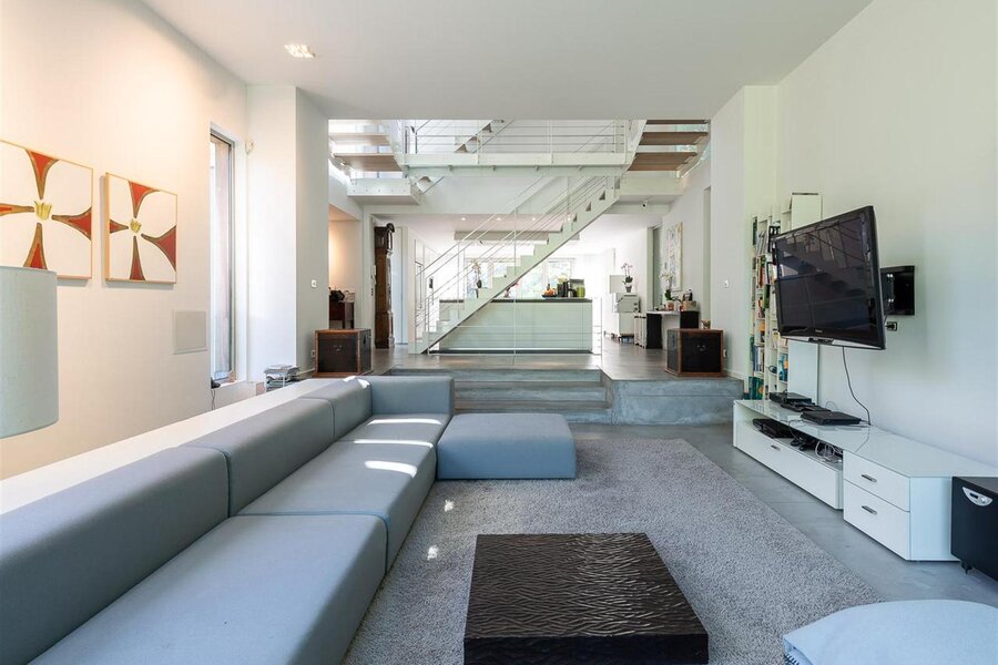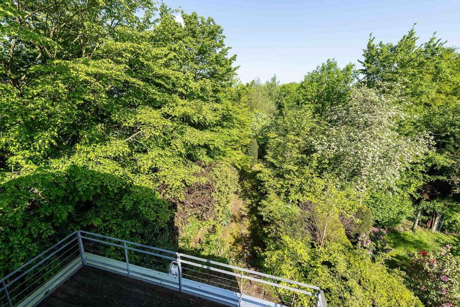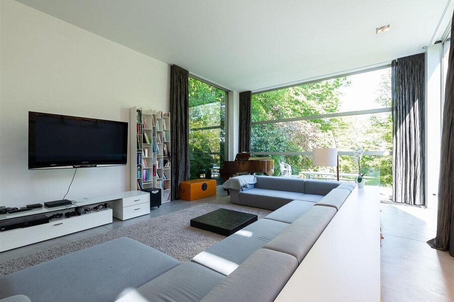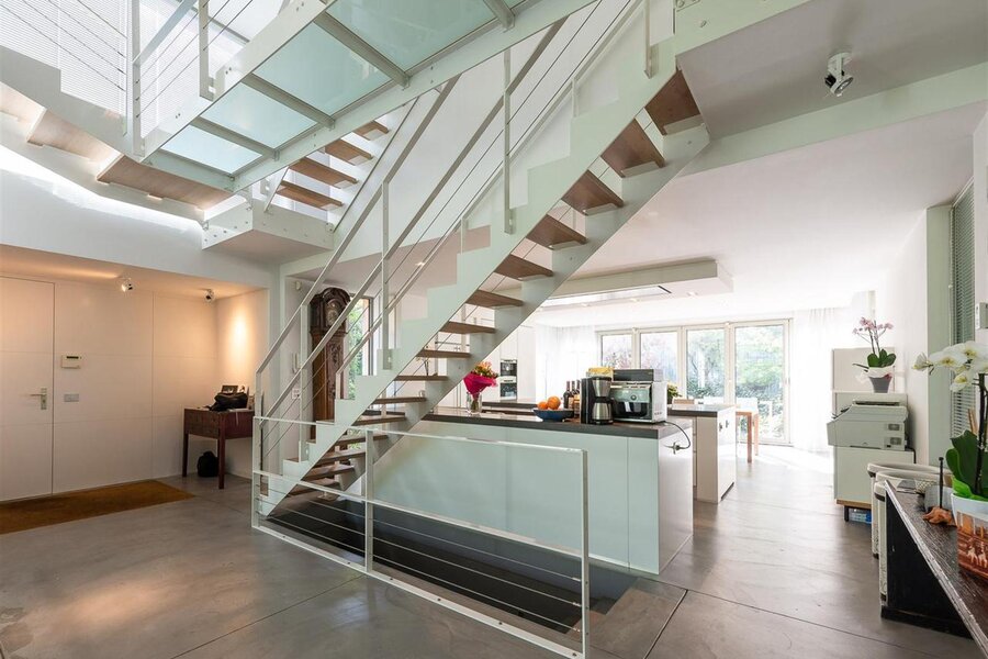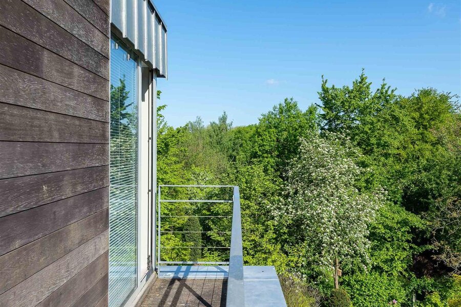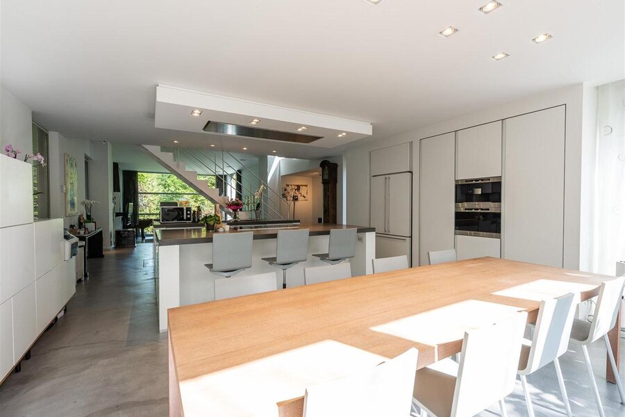 On the outskirts of Brussels, between the Bois du Wilder and the Scheutbos Park, this modern villa, designed by architect Jean-Paul Hermant and completed in 2006, offers a gross floor area of 312 m² and features three bedrooms on a plot of 25 ares. In addition to the main residence, there is an office space with a private entrance, ideal for a professional practice.