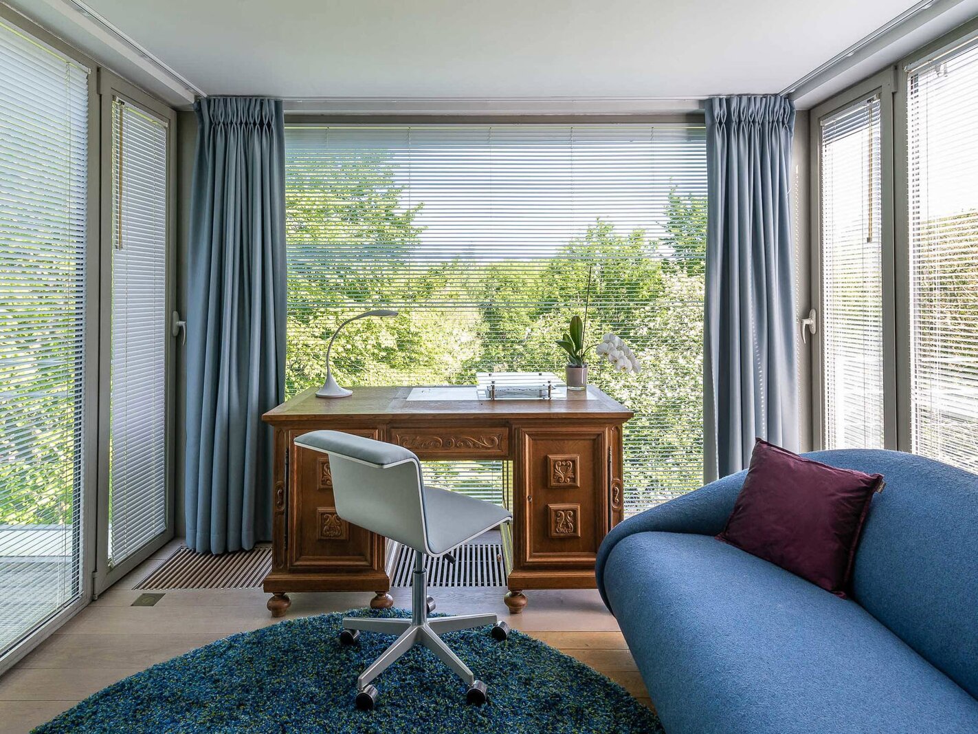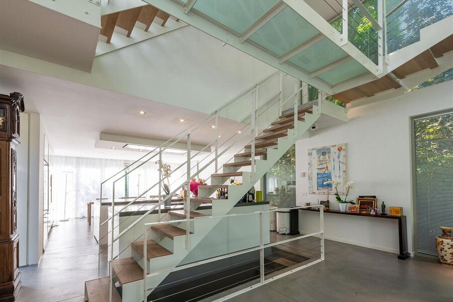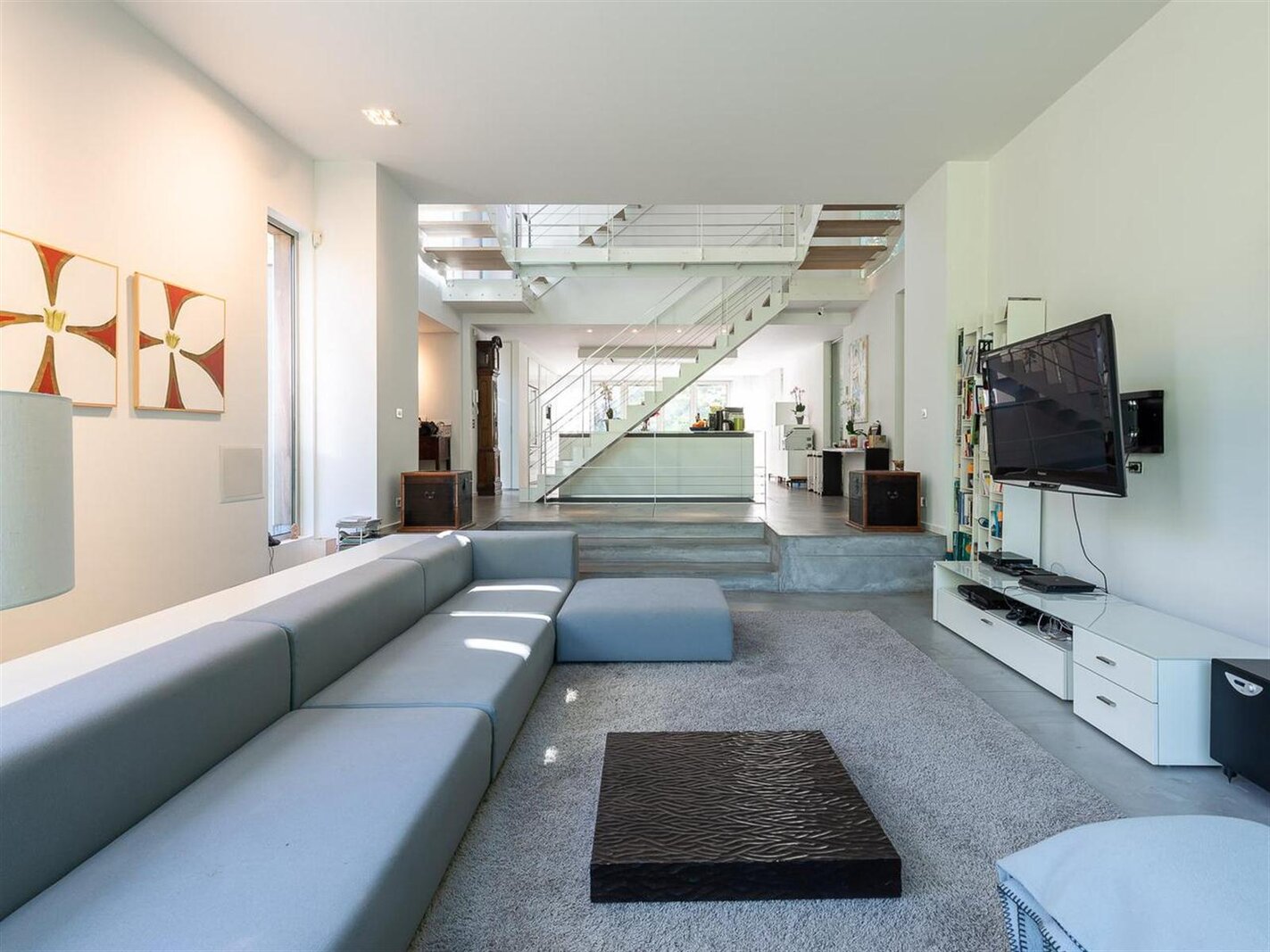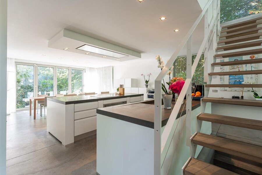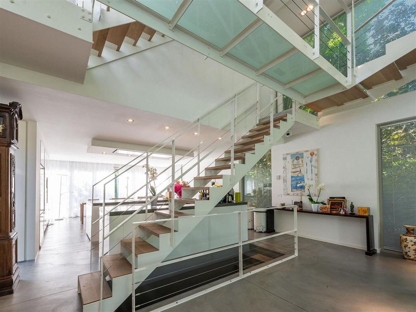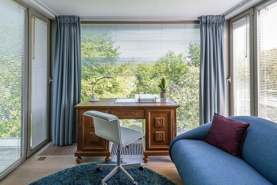 The villa comprises, on the ground floor, a spacious open-plan living, dining, and kitchen area of 100 m², designed in a loft style. The living area extends onto the terrace and the park through a Skyframe window that opens across the entire rear facade. The first floor includes the master bedroom with its own terrace, two further bedrooms, and a bathroom. The top floor consists of a family room and a shower room. Facing the street, the professional space comprises a waiting room and an office of 20 m². The interplay of light throughout the villa and the leafy views create a haven of peace nestled in nature.