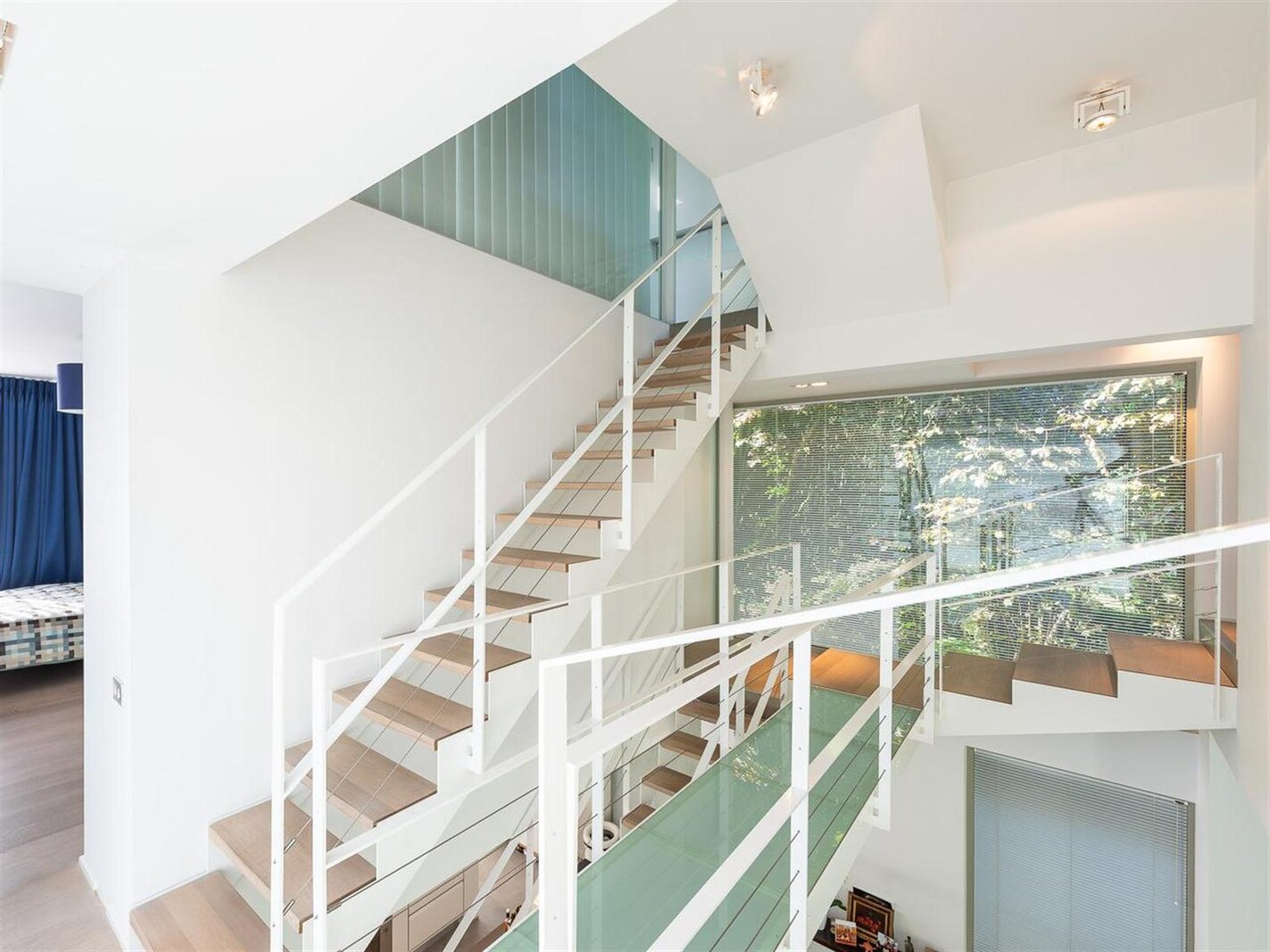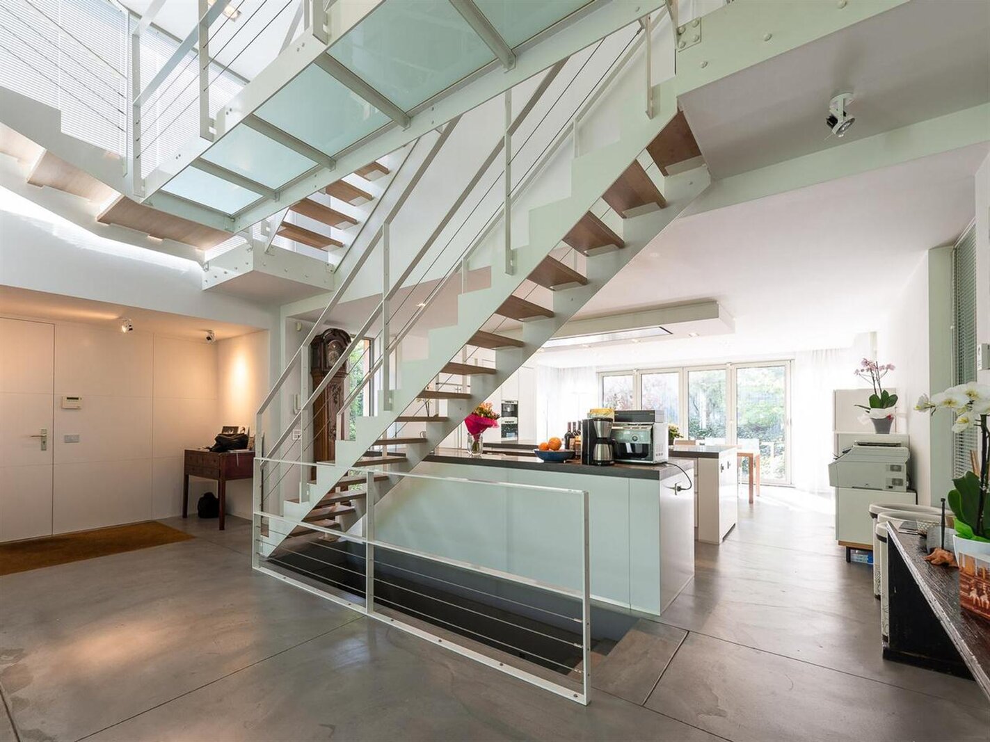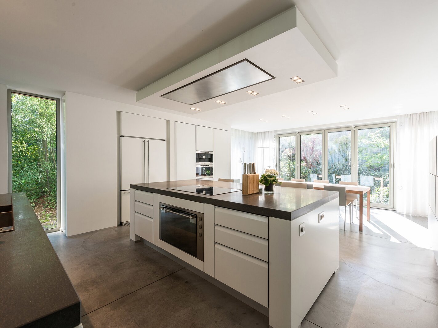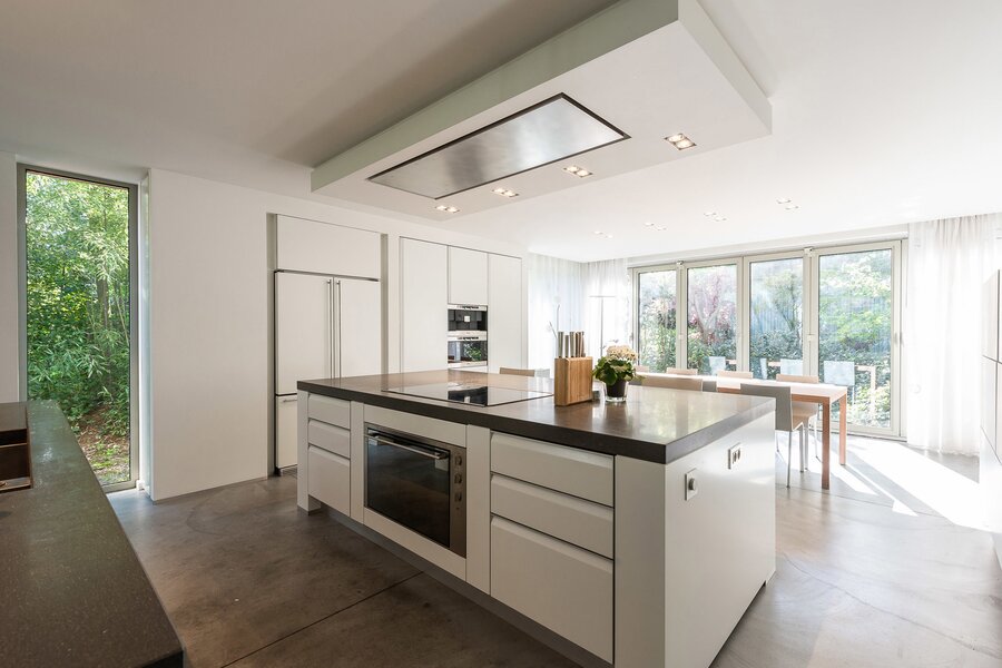 The villa comprises, on the ground floor, a spacious open-plan living, dining, and kitchen area of 100 m², designed in a loft style. The living area extends onto the terrace and the park through a Skyframe window that opens across the entire rear facade. The first floor includes the master bedroom with its own terrace, two further bedrooms, and a bathroom. The top floor consists of a family room and a shower room. Facing the street, the professional space comprises a waiting room and an office of 20 m². The interplay of light throughout the villa and the leafy views create a haven of peace nestled in nature.