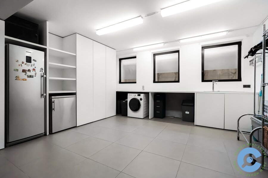 The underground floor is truly an oasis of peace. Here are the heated swimming pool with jet streamer, sauna, fitness room and bar to receive guests. From the wellness area you can go directly to the city garden. There is also a separate laundry room and a technical room.