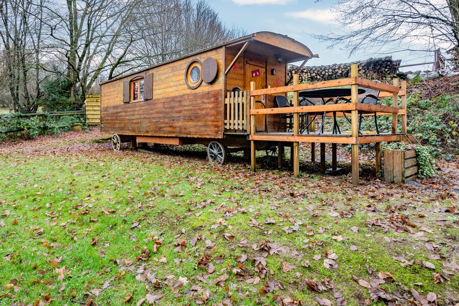An optional plot completes the ensemble: a building plot currently used as a parking area, as well as two characterful gypsy wagons, offering additional potential to host guests, create extra accommodation or develop a creative or professional project.
