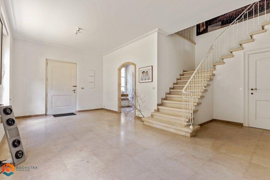 We betreden deze exclusieve woning, met maar liefst 647 m² bewoonbare oppervlakte, via de royale en lichtrijke inkomhal met vestiaire en apart gastentoilet. De magnifieke leefruimte met open haard, woonkamer, aparte bureauruimte/bibliotheek en eetkamer biedt schitterende panoramische zichten over de rijkelijke tuin. U geniet hier van veel lichtinval door de grote raampartijen. Aangrenzend bevindt zich een tweede ruime eetkamer, een aparte ontbijtkamer en de leefkeuken. Deze geeft rechtstreeks uit op de prachtig aangelegde en zuidoost-georiënteerde tuin. Een sfeervolle plek om even helemaal weg te dromen. Op het gelijkvloers vindt u verder nog een wasplaats, apart toilet en een inpandige garage met plaats voor drie wagens terug. Tevens heeft u de mogelijkheid om de woonst via de zij-ingang te betreden.