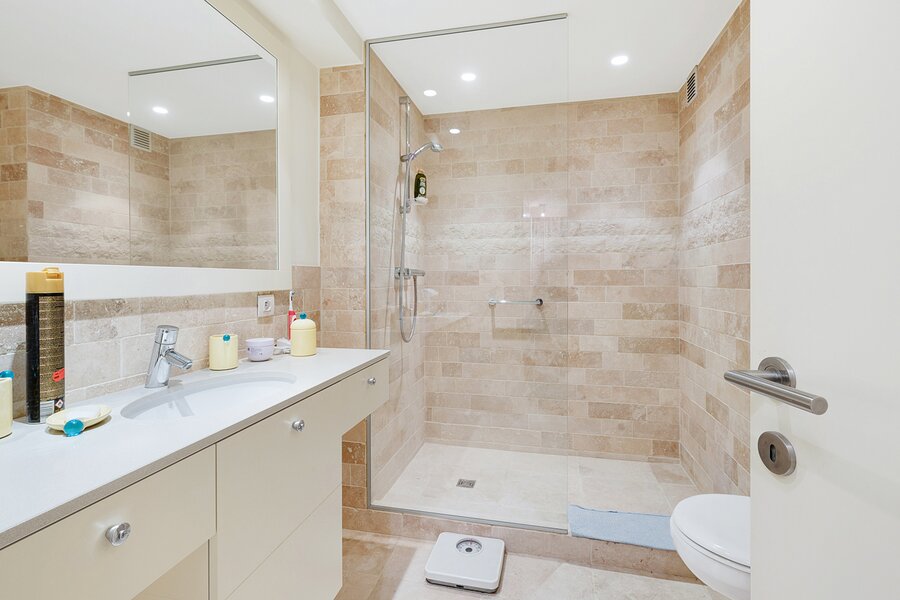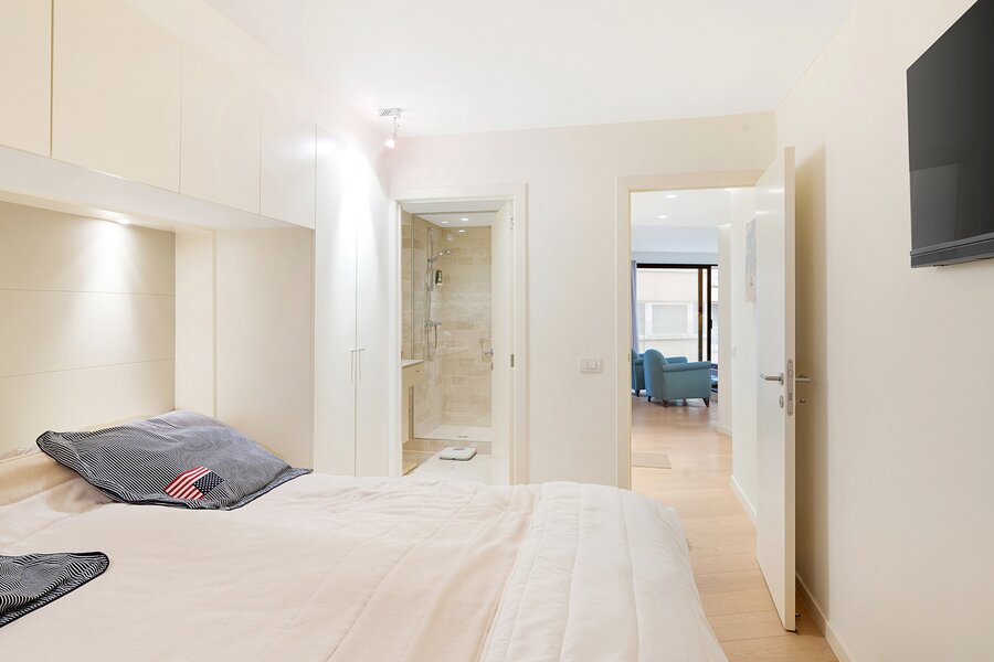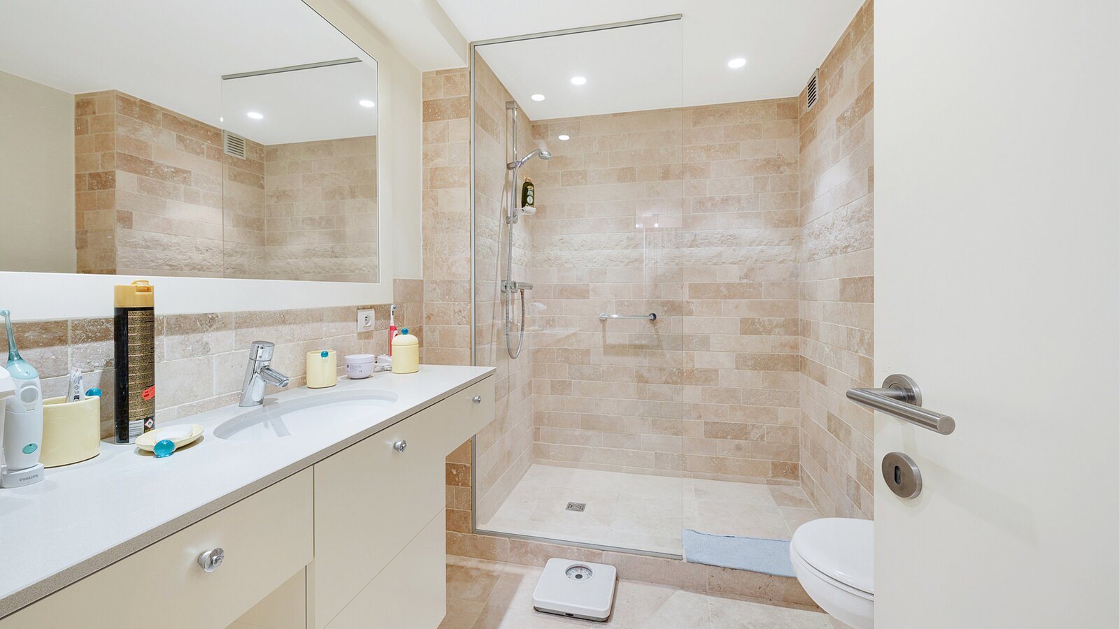 The spacious living area is open to the fully equipped kitchen, creating a modern and inviting atmosphere. The cloakroom provides additional storage space. The bedroom, equipped with built-in wardrobes, gives access to a large shower room, complete with a shower, toilet, and sink.