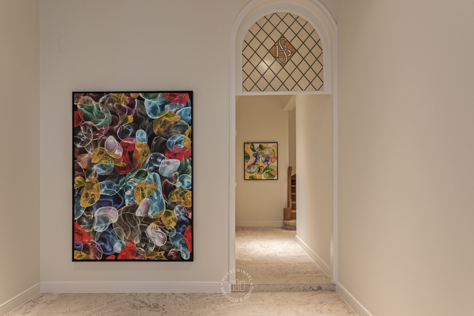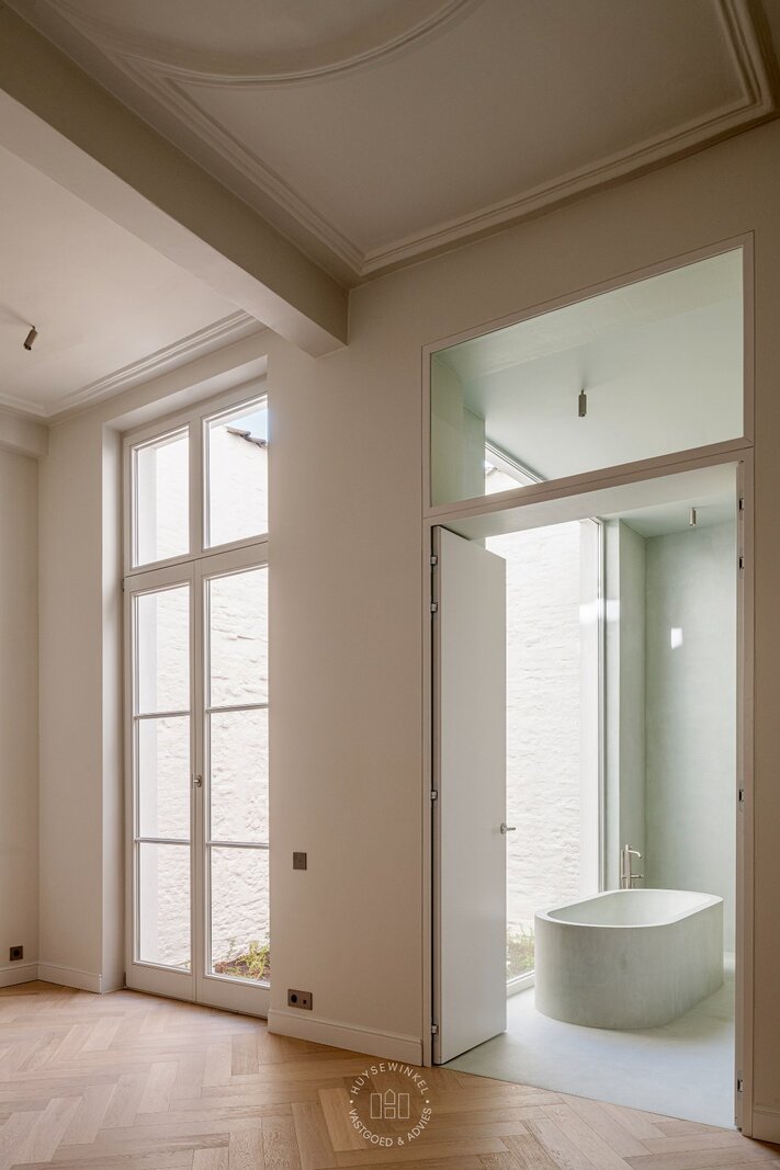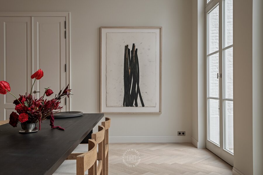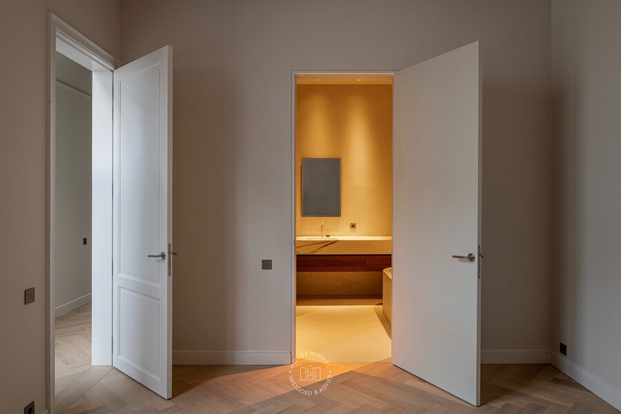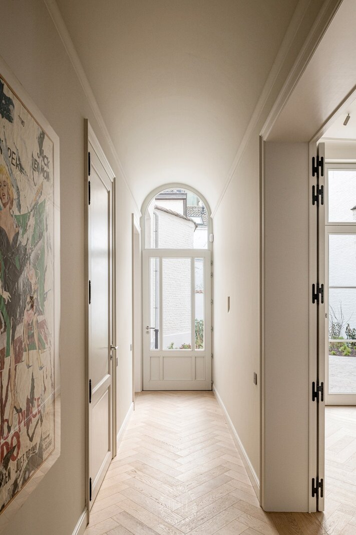 Authentieke elementen zoals klassieke schouwmantels en kwalitatieve parketvloeren geven het interieur een warme, tijdloze uitstraling. De strak vormgegeven keuken en badkamers zorgen voor een verfijnd hedendaags accent en creëren een mooi evenwicht met het historische karakter van de woning.