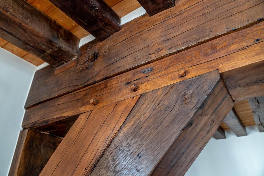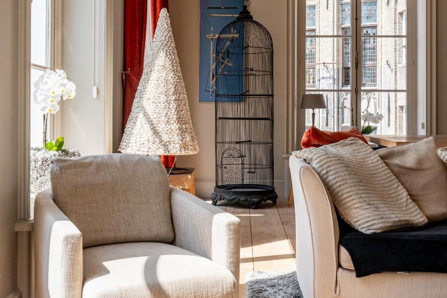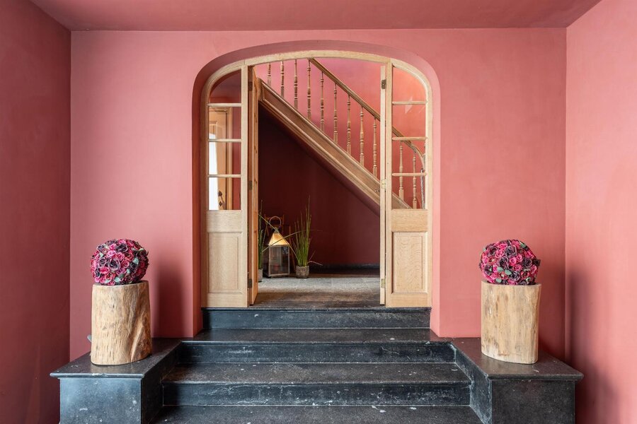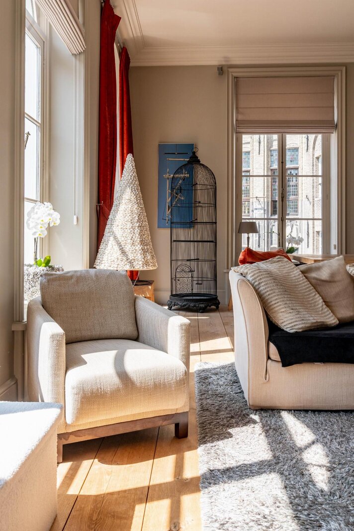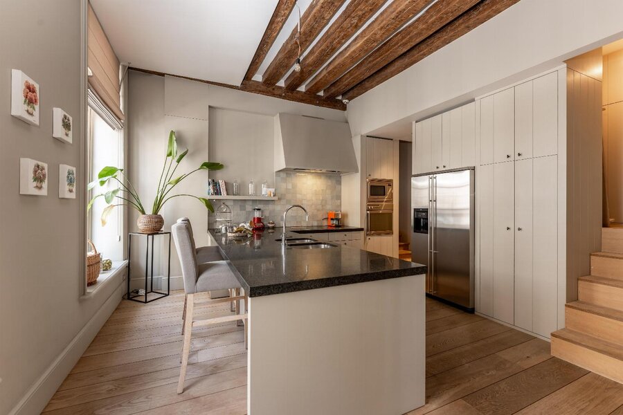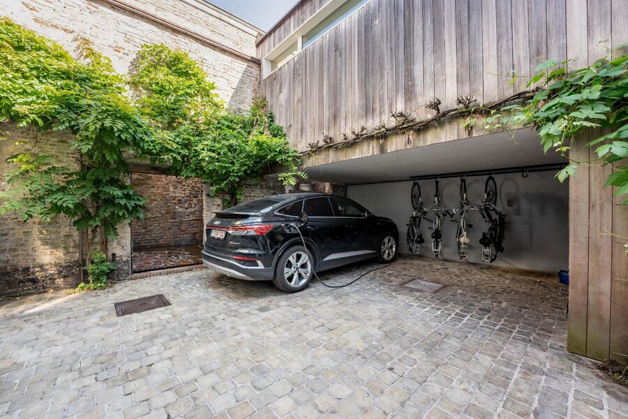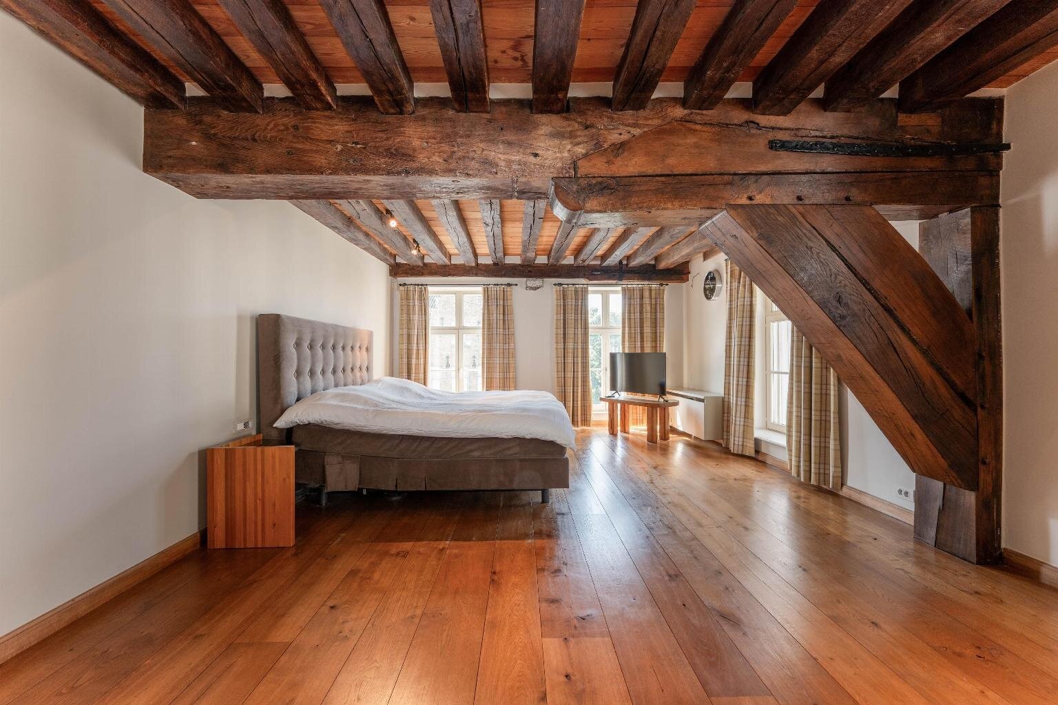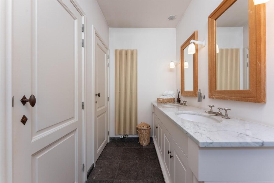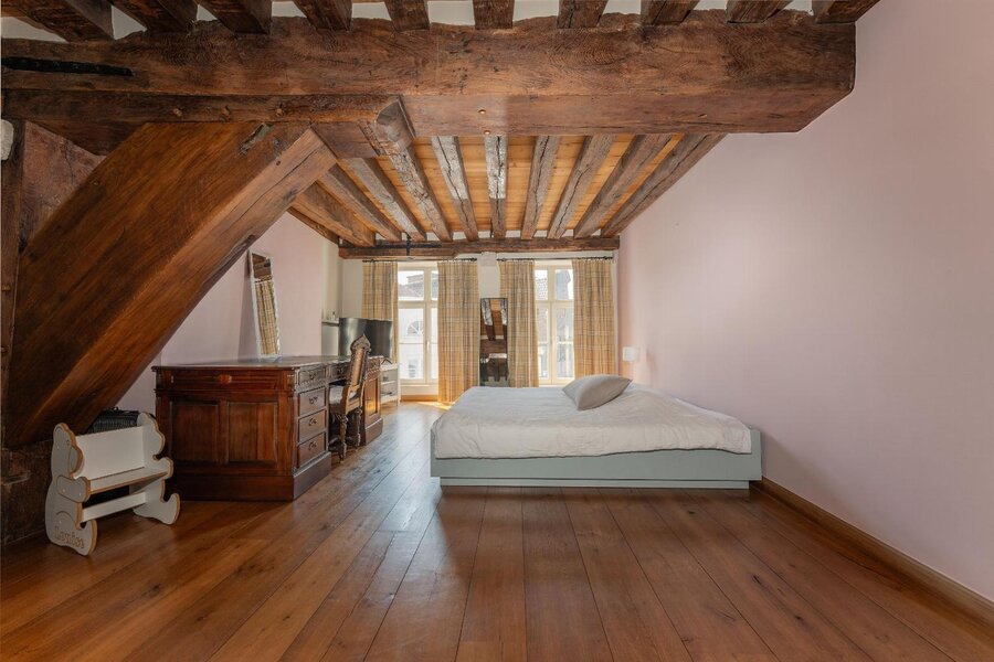 Op de bovenliggende verdieping bevinden zich meerdere slaapkamers met een centrale dressing. Helemaal bovenin, onder het originele dakgebinte, strekt zich een werkelijk unieke ruimte uit die zich leent voor diverse invullingen, gaande van creatieve ruimte tot professionele of representatieve functies.