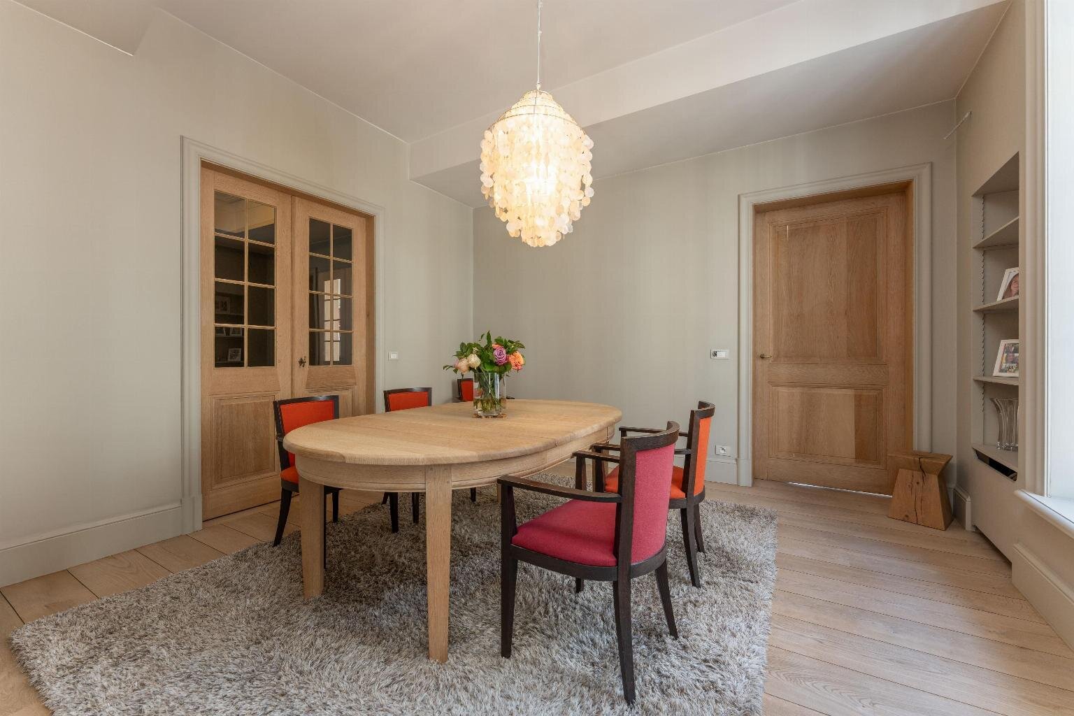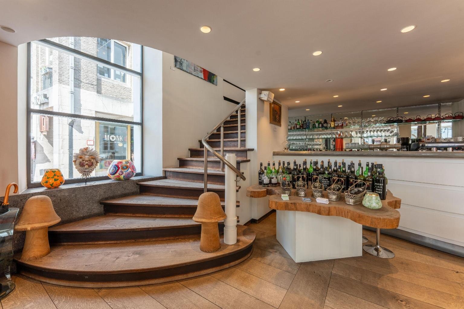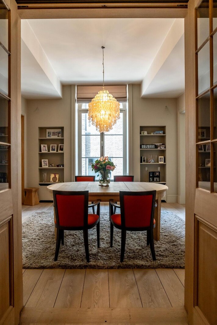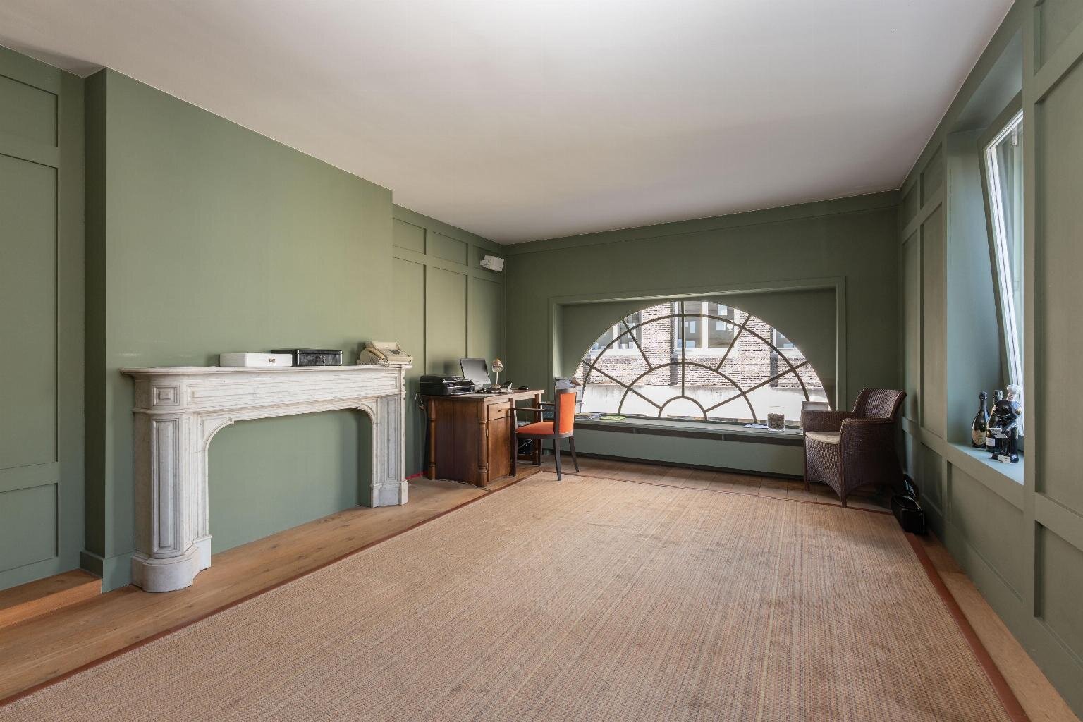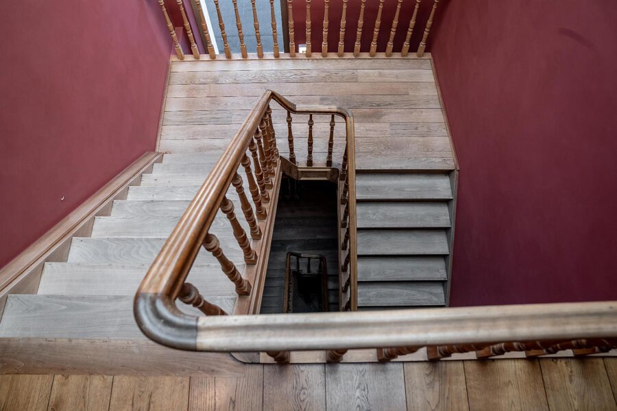 Een centrale traphal vormt de ruggengraat van het gebouw en zorgt voor een vlotte circulatie naar alle verdiepingen, volledig los van de woonvertrekken. De privéverdieping werd ingericht met het oog op comfort en beleving: een aangename leefruimte met haard, een aparte eetkamer, keuken, bureau en badkamer, telkens met maximale lichtinval en zichtlijnen richting het stadsicoon.