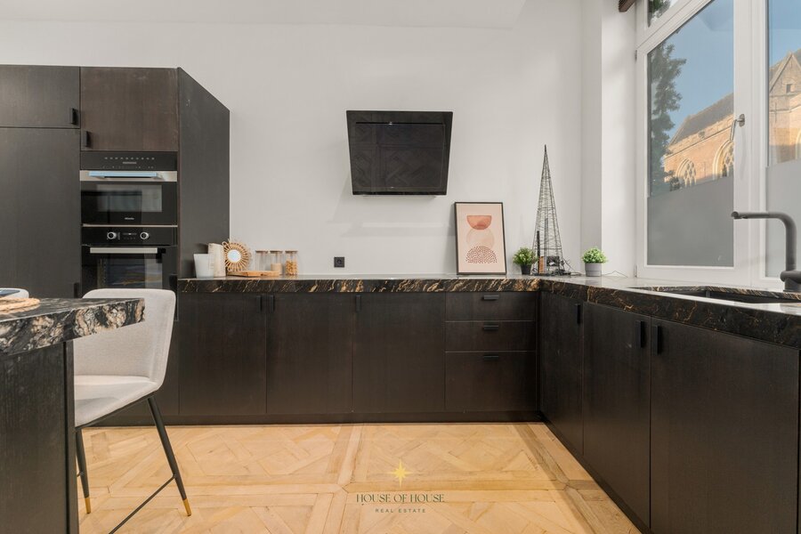 The kitchen is made of custom oak, finished with a marble worktop and kitchen island, and equipped with Miele appliances. Large windows provide plenty of daylight and open onto the spacious, intimate terrace — a particularly pleasant outdoor space in the city centre.