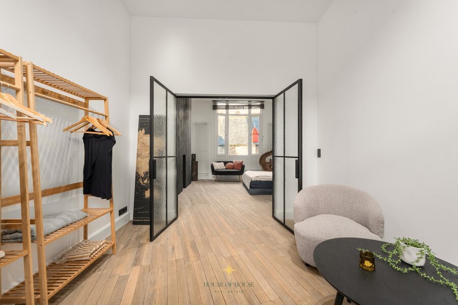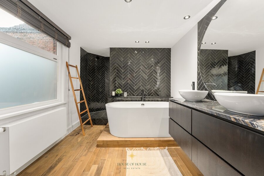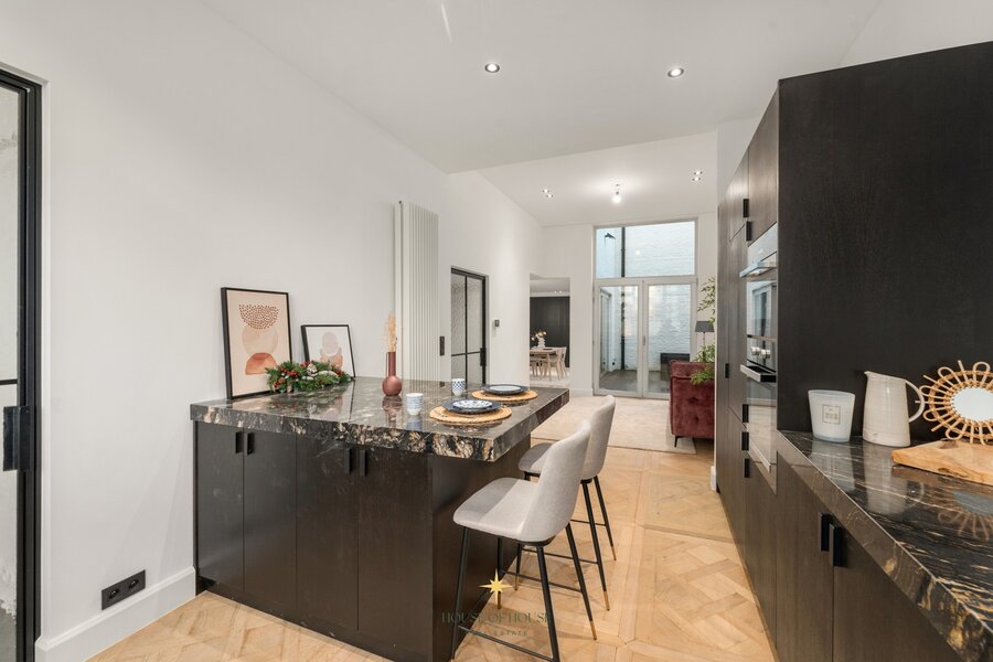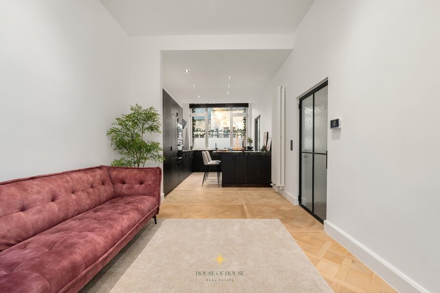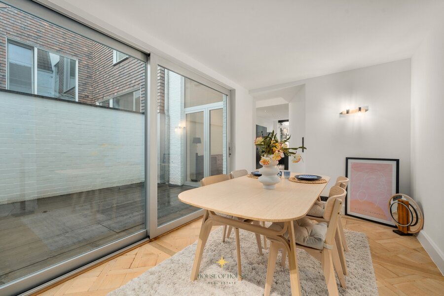 This townhouse with its charming façade has been renovated with particular attention to quality, atmosphere and detail. The Versailles parquet flooring in the living area brings warmth and elegance. The entrance hall leads to the light-filled living area with sitting area and custom-made cupboards, which connects seamlessly to the open kitchen.