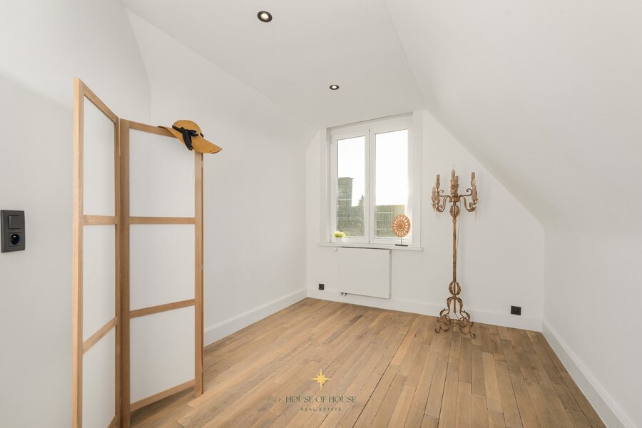 The upper floors feature the master bedroom with a separate lounge and gas fireplace. The bathroom is equipped with a bathtub, double sink and walk-in shower. There is also a second bedroom with a sink, a third full bedroom and a fourth room on the top floor, suitable as a bedroom, office or hobby room.