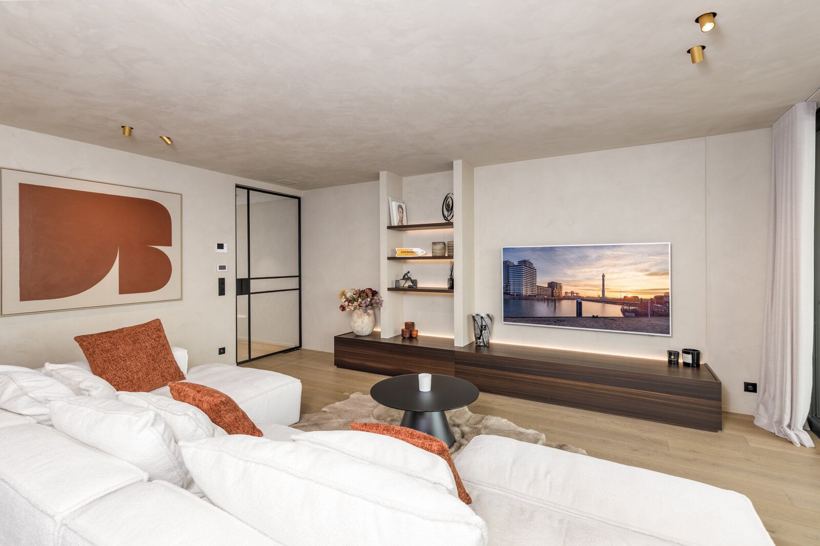 De brede leefruimte van maar liefst 7 meter zorgt voor een overvloed aan natuurlijk licht en een open gevoel. Het op maat gemaakte wandmeubel met indirecte verlichting vormt een verfijnd en stijlvol accent binnen het interieur.
