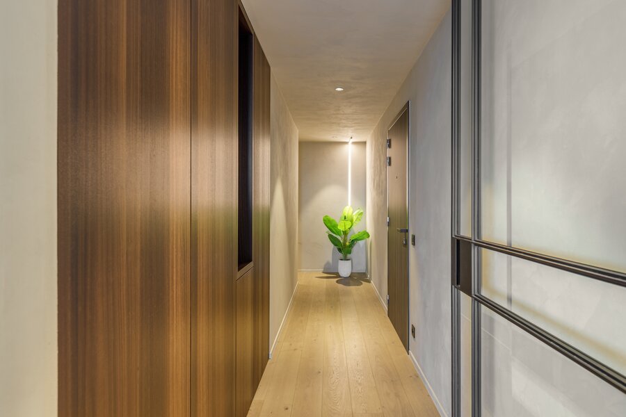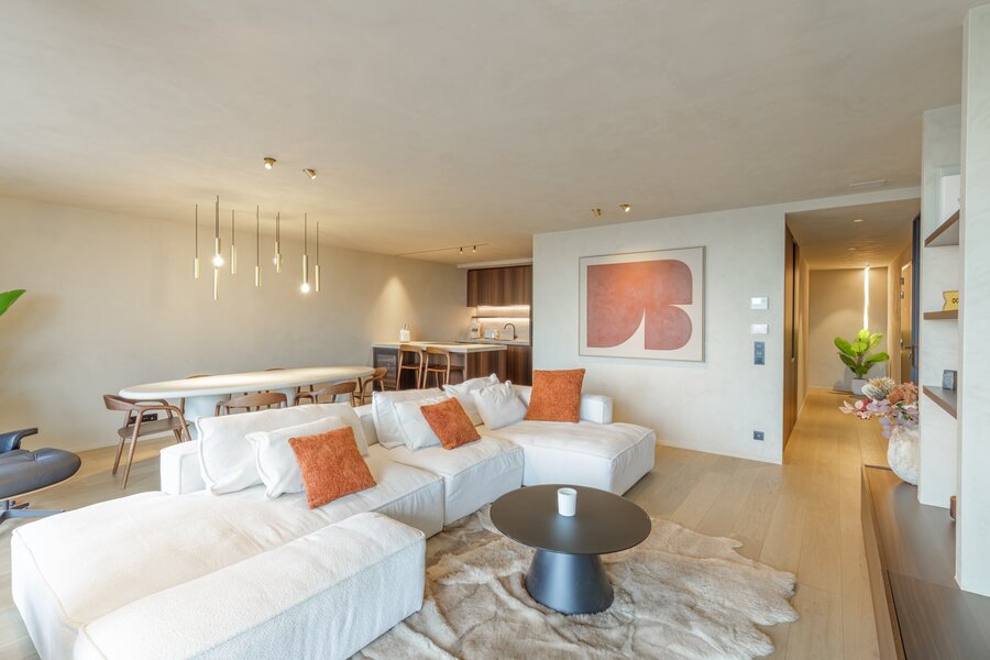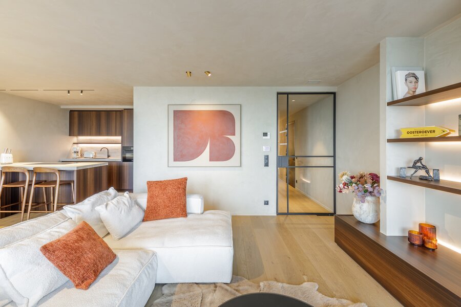 Bij het betreden van het appartement wordt u meteen verwelkomd door een warme en luxueuze afwerking in Mortex. De combinatie van donker hout en aardse tinten creëert een bijzonder gezellige en elegante sfeer.